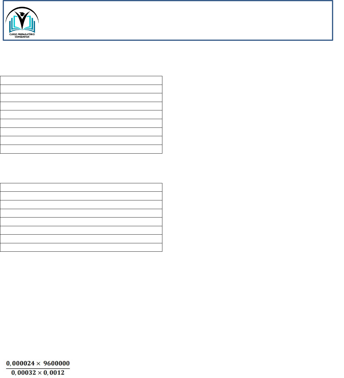 1 Curso Preparatório Conquistar Turma: PMERJ- Aulão 1 Professora: Danieli Sampaio Disciplina: Matemática Nome: _______________________________________ Data: 09/07/2023 CRONOGRAMA AULÃO 1: 09/07/2023 Conjuntos numéricos e suas operações MMC Razão e Proporção Regra de 3 simples Tabelas e Gráficos Média aritmética simples Porcentagem Conjuntos e suas operações Sistemas métricos AULÃO 2: 20/08/2023 Perímetro e Área Volume Teorema de Pitágoras Equação do 1º grau Probabilidade Sistemas de equação do 1º grau Juros simples e composto RLM OPERAÇÕES BÁSICAS 1. IBADE - Prefeitura de São Paulo - Guarda Metropolitano – 2022 Notação científica é uma maneira de escrever números muito grandes ou pequenos. Um número está escrito em notação científica quando temos um número entre 1 e 10 multiplicado por uma potência de 10. Por exemplo: o número 67.200.000 pode ser escrito na notação científica como 6,72.10 7 e o número 0,0023 pode ser escrito como 2,3.10 -3 . Considere a seguinte equação: O resultado da equação acima em notação científica é: a) 6.10 -8 b) 3.10 8 c) 6.10 10 d) 6.10 -10 e) 6.10 8 2. IBADE - Prefeitura de Aracruz - Auxiliar de Saúde Bucal – 2019 O número formado pela soma de 2 centenas de milhar, 4 unidades de milhar, 7 centenas e 3 unidades é igual à: a) 204703. b) 247030. c) 204730. d) 240703. e) 204073. 3.IBADE - SAAE - Oficial Administrativo - 2021 Um vendedor na praia tem uma certa quantidade de picolés. Para o primeiro cliente ele vendeu metade dos picolés mais dois. Para o segundo cliente ele vendeu metade do que restava mais dois. O terceiro cliente comprou metade dos picolés que restavam mais dois. Quando o quarto cliente comprou metade do que restava mais dois os picolés acabaram. O vendedor tinha, originalmente: a) 64 picolés. b) 80 picolés. c) 60 picolés. d) 72 picolés. e) 56 picolés. 4. IBADE - Prefeitura de Aracruz - Auxiliar de Saúde Bucal – 2019 Joana deu toda a sua barra de chocolate para seus amigos. Rafaela ganhou 3/8, Fábio ganhou 1/4, Natália ganhou 1/5 e Thiago ficou com o restante. Quem ganhou o maior pedaço foi: a) Fábio. b) Rafaela. c) Joana. d) Natália. e) Thiago. 5. IBADE - ISE AC - Agente Socioeducativo – 2021 Em uma prova da faculdade três amigos queriam saber quem tinha acertado mais perguntas. Sabemos que do total das questões da prova, José errou 2/9, Marcelo acertou 7/12 e Raquel acertou 5/8. Logo, pode-se concluir que: a) Marcelo acertou mais questões que Raquel. b) José acertou menos questões que Marcelo. c) Marcelo acertou mais questões que José. d) José acertou menos questões que Raquel. e) Raquel acertou mais questões que Marcelo. 6. IBADE - Prefeitura de Vila Velha - Assistente Público Administrativo – 2020 Num escritório trabalham 50 pessoas. Cada pessoa consome em média 1,5 litros de água. A 2 água é fornecida em embalagens de 12 garrafas pet de 1 litro. Considerando que o expediente é de segunda-feira a sexta-feira, quantos litros de água tem que ser comprados por semana? a) 7,5 litros por dia b) menos que 32 embalagens c) 31,25 embalagens d) 375 litros e) 384 litros 7. IBADE - INOVA Capixaba - Assistente Administrativo -Área: Assistencial - 2022 Em uma partida de futebol foram contabilizados 55.230 torcedores no estádio. Sabendo que um terço pagou o bilhete no valor de $ 20,00, e que o restante pagou $ 50,00 pelo ingresso, qual o valor total arrecadado? a) $ 2.092.000 b) $ 2.209.200 c) $ 2.350.000 d) $ 2.650.870 e) $ 2.898.732 8. Considere a seguinte equação: O resultado dessa equação é: a) 3 4 b) 3 2 c) 3 -2 d) 1/3 4 e) -3 4 10. IBADE - 2022 - PM-PB – Sargento Um homem fumante compulsivo consome cerca de 17 cigarros por dia, em média. Assim, em três anos ele irá consumir quantos cigarros? a) 490 b) 51 c) 93 d) 18615 Gabarito: 1E 2A 3C 4B 5E 6D 7B 8D 9D 10D MMC Obs.: números primos são números divisíveis apenas por 1 e por ele mesmo. São eles: 2, 3, 5, 7, 11, 13, 17, 19, 23, 29, 31, 37, 41, 43, 47, 53, 59, 61, 67, 71, 73, 79, 83, 89, 97 A decomposição de dois números simultaneamente terá como resultado a forma fatorada do mínimo múltiplo comum entre eles. Exemplo: fatoração dos números 40 e 60. 40, 60 2 20, 30 2 10, 15 2 5, 15 3 5, 5 5 1, 1...... 2.2.2.3.5= 2 3 .3. 5= 120 A multiplicação dos fatores primos 2 x 2 x 2 x 3 x 5 tem como forma fatorada 2 3 x 3 x 5. Portanto, o MMC de 40 e 60 é: 2 3 x 3 x 5 = 120. 1. IBADE - Prefeitura de Barra de São Francisco - Auxiliar de Consultório – 2022 Certa prefeitura tem a iniciativa de disponibilizar um espaço livre para a troca de livros em seu centro administrativo a partir de Agosto/2022. Os interessados podem trocar seus livros por outros do mesmo gênero, sendo a única condição que o exemplar esteja em bom estado. João decide efetuar suas trocas a cada 6 meses, enquanto Lucia realiza o mesmo procedimento a cada 9 meses. Sabendo que ambos efetuaram a primeira troca no dia da inauguração do espaço, quando será a próxima troca simultânea de livros feita pelos dois? a) Março/2023. b) Julho/2024. c) Fevereiro/2024. d) Janeiro/2024. e) Junho/2024. 2. IBADE - SEA SC - Técnico em Engenharia - Área: Agrimensura – 2022 Três amigas estão treinando para uma corrida dando voltas em uma quadra de futebol, mantendo sempre o ritmo constante. Bruna, Marcela e Ana Júlia completam uma volta na quadra em 40, 60 e 70 segundos, respectivamente. Considerando que elas começaram a correr simultaneamente a partir do mesmo ponto às 7horas, o próximo horário em que as três passarão juntas pelo ponto de partida será às: a) 7h20min. b) 7h15min. c) 7h10min. d) 7h14min. 3 e) 7h12min. 3. IBADE 2022 A cada 15 dias uma pessoa troca a senha do Wi-Fi em sua residência e a cada 25 dias a senha de acesso à internet em sua conta bancária. Na última sexta- feira, essa pessoa trocou essas duas senhas citadas. Em que dia novamente as duas senhas serão atualizadas no mesmo dia? a) Do