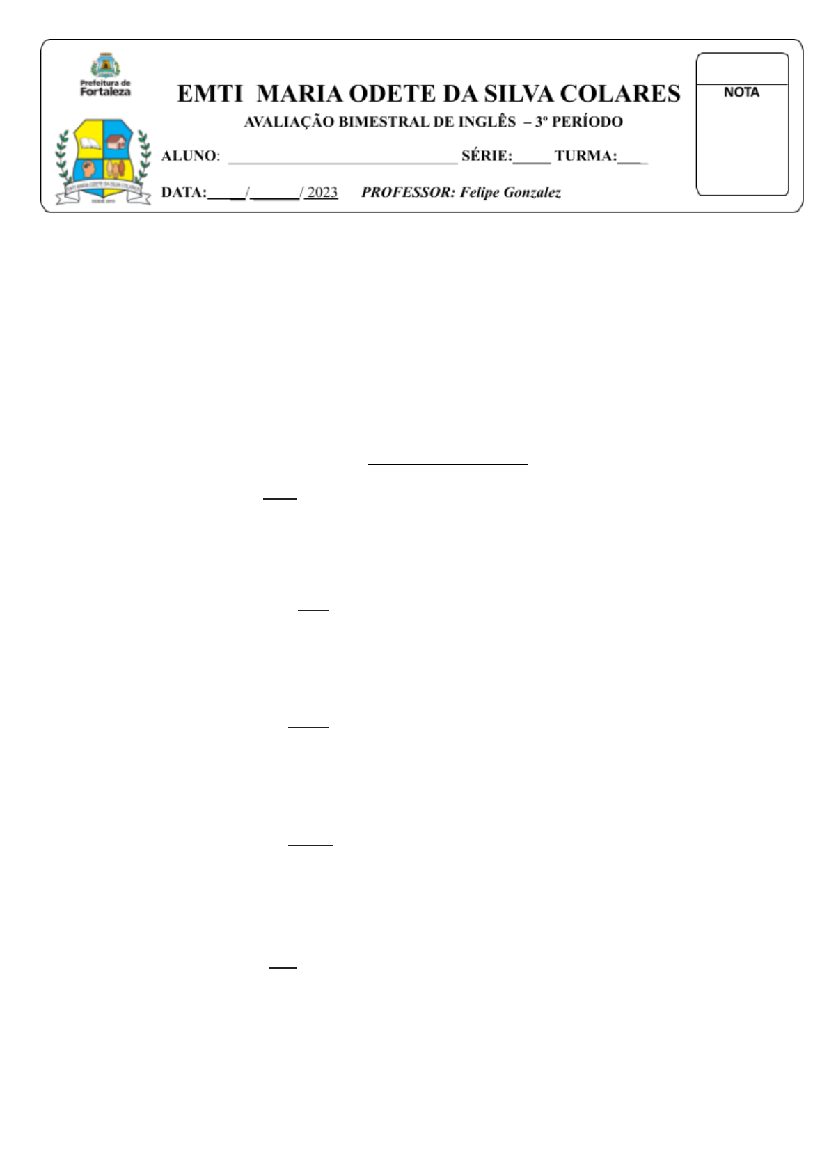 1) Complete as frases abaixo passando o verbo entre parênteses para o Past Continuous. . a) I ____________________ a very pleasant book last night. (read) b) He ____________________ TV when his mother arrived. (watch) c) My father and my brother ____________________ soccer yesterday. (play) d) My mother ____________________ lunch with her friend last week. (have) e) They ____________________ hard in their College project. (work) NAS QUESTÕES DE 2 ATÉ 6, MARQUE O ITEM CORRETO QUE INDICA QUE O PRONOME E O VERBO ESTÃO NO PAST CONTINUOUS. 2) Pronome "I" e o verbo "read"? a) I was reading a book when the phone rang. b) I read a book yesterday. c) I am reading a book every day. 3) Pronome "they" e o verbo "play"? a) They played soccer when it was snowing. b) They play soccer every weekend. c) They were playing soccer when it was snowing. 4) Pronome "you" e o verbo "study"? (FORMA NEGATIVA) a) You didn't studying when I called you. b) You were not studying when I called you. c) You were not study when I called you. 5) Pronome "she" e o verbo "dance"? a) She was dancing at the party when the music stopped. b) She wasn't dance at the party when the music stopped. c) She didn't dancing at the party when the music stopped. 6) Pronome "it" e o verbo "rain"? a) It didn't rain when we were at the concert. b) It was raining when we were at the concert. c) It were rain when we were at the concert.