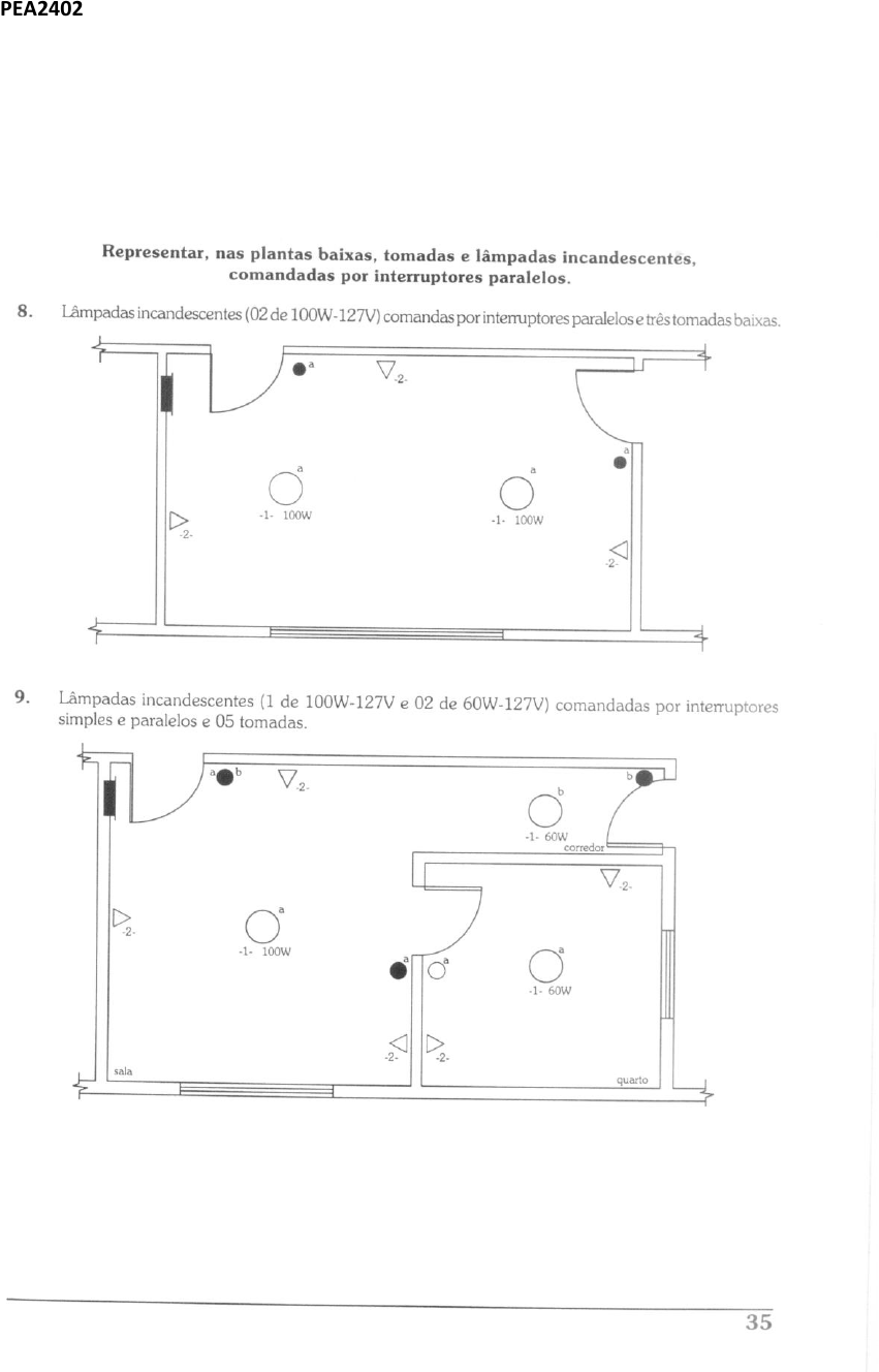PEA2402 EXERCICIOS DE INSTALAÇÕES ELETRICAS OBS : Exercícios retirados do livro Caderno de Atividades - Instalações Elétricas Prediais – Geraldo Cavalin e Severino Cervelin – Editora Érica - 1998 FreeText PEA3402 Rectangle Calcular também as perdas na rede (R CA (70 oC)x l (km) x I(A)2 de cada trecho e o total) Calcular a perda percentual em relação à carga total Determinar o disjuntor que protege o circuito (10, 15, 20, 25, 30, 35, 40, 50, 60 A) utilizando as duas inequações a seguir: 1) I projeto < I nominal disjuntor < I capacidade do cabo 2)1,35 x I nominal disjuntor < 1,45 x I capacidade do cabo Dados dos cabos Resistência Elétrica dos Cabos de Cobre (Seção (mm2 ) RCC (20 oC )/Km) RCA(70 oC ) (/Km) 1,5 12,1 14,48 2,5 7,41 8,87 4 4,61 5,52 6 3,08 3,69 10 1,83 2,19 16 1,15 1,38 25 0,73 0,87 Bitola Capacidade de Corrente dos Cabos e Queda de tensão de Condutor de Cobre com cobertura de PVC Seção (mm2) Capacidade de Corrente (A) Queda de Tensão Unitária (V / A km) Modo de Instalação B – eletroduto embutido em alvenaria Monofásico em eletroduto 2 condutores 3 condutores Fator de potência 0,95 Fator de potência 0,8 1,5 17,5 15,5 27,6 23,3 2,5 24 21 16,9 14,3 4 32 28 10,6 8,96 6 41 36 7,07 6,03 10 57 50 4,23 3,63 16 76 68 2,68 2,32 25 101 89 1,71 1,51
