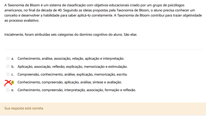 A Taxonomia de Bloom é um sistema de classificação com objetivos educacionais criado por um grupo de psicólogos americanos, no final da década de 40. Seguindo as ideias propostas pela Taxonomia de Bloom, aluno precisa conhecer um conceito e desenvolver a habilidade para saber aplicá-lo A Taxonomia de Bloom contribui para trazer objetividade ao processo avaliativo. Inicialmente, foram atribuídas seis categorias do cognitivo do aluno. São elas: a. Conhecimento, análise, associação, relação, aplicação e interpretação. b. Aplicação, associação, reflexão, explicação, memorização e estimulação. C. Compreensão, conhecimento, explicação, memorização, Conhecimento, compreensão, analise, sintese e avaliação. e. Conhecimento, compreensão, interpretação, associação, formação e Sua resposta está correta.