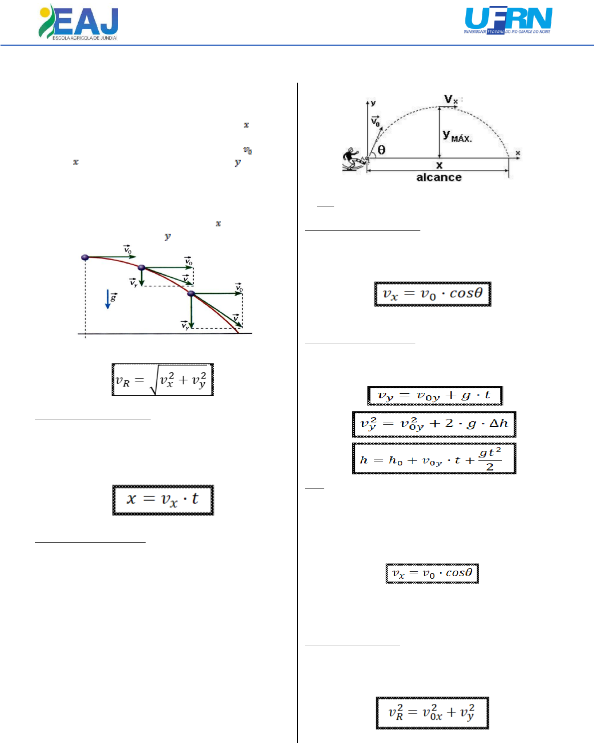 1 ESCOLA AGRÍCOLA DE JUNDIAÍ – EAJ/UFRN Física I – Professora Renata Oliveira LANÇAMENTO HORIZONTAL E OBLÍQUO LANÇAMENTO HORIZONTAL Temos um movimento uniforme ao longo do eixo , pois não existe nenhuma aceleração na direção horizontal, com isso o móvel se mantém sempre com mesma velocidade ao longo do eixo . No entanto, ao longo do eixo temos um movimento uniformemente variado, uma vez que ao longo desse eixo notamos a presença de uma aceleração. Tal aceleração recebe o nome de aceleração gravitacional. Sendo assim, o lançamento horizontal é uma composição de dois movimentos: movimento uniforme (eixo ) e movimento uniformemente acelerado (eixo ). Assim teremos a resultante das velocidades dado pela soma vetorial: Movimento horizontal: M.U. Obs: A componente horizontal da velocidade vx é constante e igual a velocidade de lançamento v0. Alcance: Movimento Vertical: M.U.V Obs: A componente da velocidade vertical inicial é nula. A gravidade é que faz a velocidade vertical aumentar à medida que o tempo passa. Ao longo do movimento vertical, temos o mesmo comportamento de queda livre, ou seja, as equações são as mesmas do movimento uniformemente variado utilizando-se vy. LANÇAMENTO OBLÍQUO Considere um corpo sendo lançado com velocidade v0 numa direção que forma com a horizontal um ângulo θ. Desprezando a resistência do ar, o móvel fica sob ação exclusiva de seu peso, e sujeito apenas, portanto, á aceleração da gravidade. A trajetória descrita, em relação à Terra, é uma parábola. OBS: Quando o alcance é máximo (AMáx) o ângulo θ é 45ᵒ Movimento horizontal: M.U. Obs: A componente horizontal da velocidade vx é constante. Onde, Movimento Vertical: M.U.V Temos as seguintes equações ao longo do eixo y: OBS: ► O módulo da velocidade vy diminui durante a subida e aumenta na descida. ► No ponto de altura máxima (Hmax) o módulo da velocidade no movimento vertical é vx. . ► O tempo de subida (tS) é igual ao tempo de descida (tD), assim o tempo de um projétil no ar é igual a de tS e tD . Equação da Velocidade Para qualquer instante t, a velocidade da componente vertical é uma função do movimento uniformemente variado, assim teremos: 2 ESCOLA AGRÍCOLA DE JUNDIAÍ – EAJ/UFRN Física I – Professora Renata Oliveira EXERCÍCIOS 01) Um corpo é lançado obliquamente com velocidade v0 de módulo 50 m/s, sob um ângulo de lançamento θ (senθ=0,6; cosθ=0,8), conforme indica a figura: Calcule, considerando g=10 m/s² e desprezando a influência do ar: a) a intensidade da velocidade v do corpo ao passar pelo vértice do arco de parábola; b) o tempo de subida; c) a altura máxima (hmáx); d) o alcance horizontal (A). 02) No instante t0=0s, um projétil é atirado para cima com ângulo de 45° em relação à horizontal, com velocidade de módulo 80 √2 m/s. Desprezando a influência do ar e considerando g=10 m/s², determine: a) o(s) instante(s) em que o projétil se encontra a 140 metros acima do plano horizontal de lançamento; b) o módulo da velocidade do projétil no instante t=2 s. 03) Uma esteira transportadora lança minério horizontalmente com velocidade v0. Considere desprezível a influência do ar e adote g=10 m/s2. a) Determine o intervalo das intensidades de v0 para que o minério caia dentro da carroceria do caminhão. b) Se o desnível H fosse maior, o intervalo citado no item anterior aumentaria, diminuiria ou permaneceria o mesmo? 04) Um aluno do CEFET em uma partida de futebol lança uma bola para cima, numa direção que forma um ângulo de 60° com a horizontal. Sabendo que a velocidade na altura máxima é 20 m/s, podemos afirmar que a velocidade de lançamento da bola, em m/s, será: a) 10 b) 17 c) 20 d) 30 e) 40 05) Um projétil é lançado obliquamente no ar, com velocidade inicial v0 = 20 m/s, a partir do solo. No ponto mais alto de sua trajetória, verifica-se que ele tem velocidade igual à metade de sua velocidade inicial. Qual a altura máxima, em metros, atingida pelo projétil? (Despreze a resistência do ar.) 06) Uma esfera de aço de massa 200g desliza sobre uma mesa plana com velocidade igual a 2m/s. A mesa está a 1,8m do solo. A que distância da mesa a esfera irá tocar o solo? Obs.: despreze o atrito. Considere g = 10 m/s² . a) 1,25m b) 0,5m c) 0,75m d) 1,0m e) 1,2m 07) Um corpo de massa 1,0 kg é lançado obliquamente, a partir do solo, sem girar. O valor da componente vertical da velocidade, no instante do lançamento, é 4,0 m/s e o valor da componente horizontal é 5,0m/s. Supondo que o corpo esteja sujeito exclusivamente à ação da gravidade, determine: a) a altura máxima atingida; b) o alcance. 3 ESCOLA AGRÍCOLA DE JUNDIAÍ – EAJ/UFRN Física I – Professora Renata Oliveira 08) Um corpo é lançado horizontalmente do alto de uma torre e atinge o solo horizontal com velocidade de 37,5m/s formando 53° com a horizontal. A altura da torre é de: Obs.: Despreze as resistências ao movimento. Dados: g=10m/s², cos53°=0,6 e sen 53°=0,8. a) 20 m b) 30 m c) 40 m d) 45 m e) 50 m 09) Um motociclista de motocross move-se com velocidade v = 10m/s, sobre uma superfície plana, até atingir uma rampa (em A), inclinada de 45° com a horizontal, como indicado na figura. A trajetória do motociclista deverá atingir novamente a rampa a uma distância horizontal D (D=H), do ponto A, aproximadamente igual a a) 20 m b) 15 m c) 10 m d) 7,5 m e) 5 m 10) Duas esferas A e B, pequenas, de massas iguais e raios iguais, são lançadas de uma mesa horizontal, com velocidades horizontais de vA = 4,0 m/s e vB = 6,0 m/s, em direção a um piso horizontal. Desprezando-se a resistência do ar, é correto afirmar que: a) a esfera A tocará o piso antes de B. b) a esfera B tocará o piso antes de A, porque ficará mais tem- po no ar. c) as esferas tocarão o piso no mesmo instante. d) a esfera A tocará o piso depois de B, porque ficará mais tempo no ar. 11) Considere a figura abaixo, na qual Michele 
