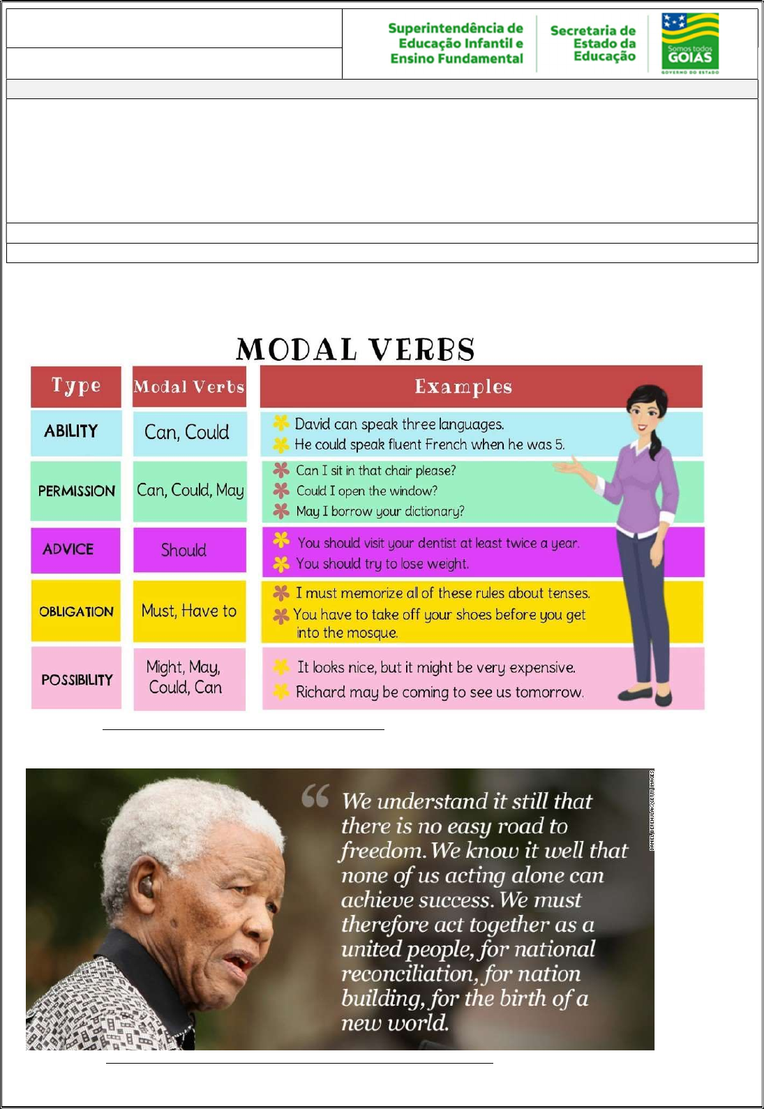 Tema/ objeto de conhecimento: Modal verbs: should, must, have to, may, might Disponível em https://www.tes.com/lessons/l0Ack8RLazvVvA/modals Acesso em 18 de set. de 2020. Disponível em: https://edition.cnn.com/2013/12/05/africa/gallery/mandela-quotes/index.html Acesso em 21 de set. de 2020. 9º ANO LÍNGUA INGLESA 5ª QUINZENA – 3º CICLO Habilidades Essenciais: (EF09LI05-A) Ler diversos textos publicitários e de propaganda para identificar recursos de persuasão, como escolha e jogo de palavras, uso de cores e imagens, tamanho de letras, utilizados nas mídias como elementos de convencimento;(EF09LI16-A) (Re)conhecer e compreender o uso dos verbos should, must, have to, may e might, para empregá-los em situações comunicativas, indicando recomendação, necessidade ou obrigação e probabilidade; (EF09LI19-A) Compreender e discutir a comunicação intercultural, por meio da língua inglesa, como mecanismo de valorização pessoal e de construção de identidades no mundo globalizado para respeitar e valorizar a diversidade linguística e cultural. NOME: UNIDADE ESCOLAR: 1. Answer these questions in English. a) Is there any easy road to freedom? b) Can we achieve success acting alone? c) Why must we act together as a united people? 2. Decide if the following sentences are true (T) or false (F) according to the text. Then correct the false ones. a) ( ) You can’t leave the ground without a plan to get down. b) ( ) The Emergency Rescue Plan should not be appropriate for the situation. c) ( ) Nobody involved in the Rescue Plan should know their role. 3. O verbo modal SHOULD na frase “The Emergency Rescue Plan SHOULD be appropriate for the situation and work being done” expressa um(a) a) ( ) obrigação. b) ( ) habilidade. c) ( ) conselho. d) ( ) permissão. Disponível em: https://in.pinterest.com/pin/660762576563139811/ Acesso em 21 de set. de 2020. 4. According to the text, the expression FREAK OUT means a) ( ) to become so angry, surprised, excited or frightened that you cannot control yourself. b) ( ) to start doing things in a different way like dancing, running in circles and yelling. c) ( ) to look for something in your house in a pleasure way. d) ( ) to begin to have a particular job experience in a quiet and pleasure place. Disponível em: https://www.numberbarn.com/blog/phone-jokes/ Acesso em 21 de set. de 2020. 5. Circle the right modal verb to complete the sentences. a) It's a hospital. You (MUSTN'T / MUST) smoke. b) Take an umbrella. It (MIGHT / SHOULD) rain later. c) You (SHOULDN'T / MUST) leave small objects lying around. Children (MAY / HAVE TO) swallow such objects. d) Drivers (MUST / SHOULD) stop when the traffic lights are red. e) I think you (SHOULD / CAN’T) go out more and meet new people. f) To get a driving licence you (HAVE TO / CAN) be over 18. g) You (MUST / SHOULD) wear a uniform when you're in the army. h) It's dangerous to go into deep water if you (CANNOT / MUST) swim. 6. Unscramble the words in order to make sentences using the modal verbs. (Organize as palavras para formar sentenças usando os verbos modais.) a) THE – FOLLOW – SHE – MUST – RULES. b) DENTIST – SHOULD – GO – THE – YOU – TO c) BY – COME – CAR – MAY – THEY.