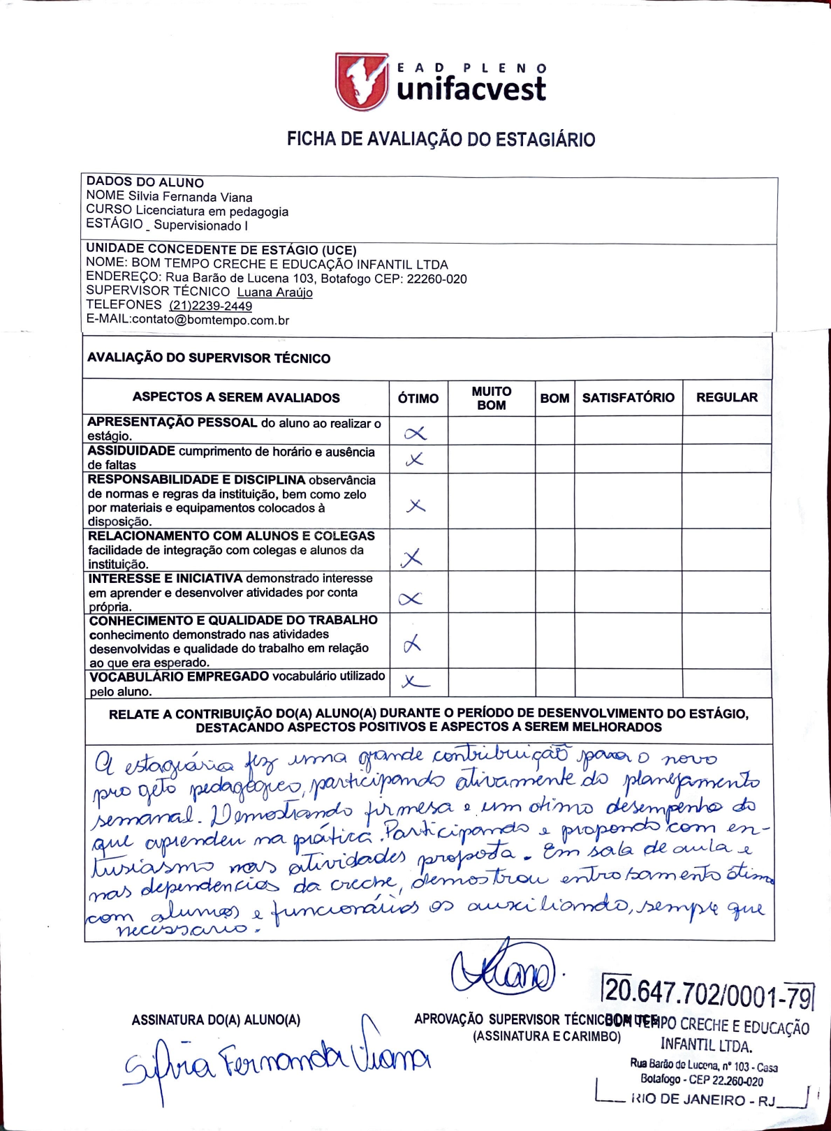 ASSINATURA DO(A) ALUNO(A) ~ APROVAÇÃO SUPERVISOR TÉCNIC8011t ~lilPO CRECHE E EDUCAÇÃO