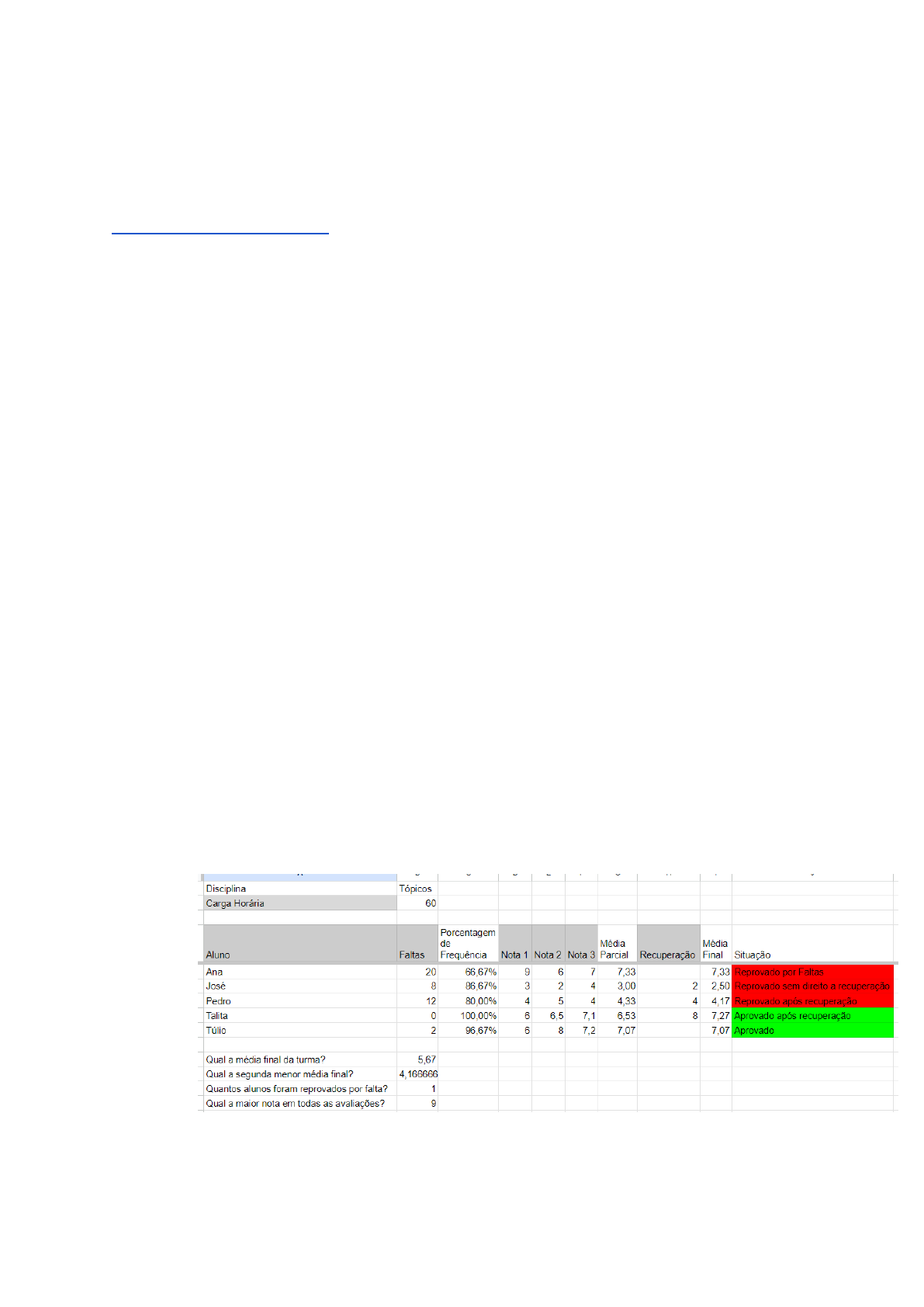 Trabalho - Primeira Avaliação 29/07/2024 Profa. Dra. Sandra Regina Rocha Mariscal Vargas sandra.rocha@ufersa.edu.br (27) 99980 7432 sandra.rocha@ufersa.edu.br UFERSA Nome(s) do(s) Aluno(s): Instruções: ● Preencher nome(s) no trabalho ● São 3 questões avaliativas ● Trabalho Individual ou em grupo de no máximo 5 componentes ● Data limite de envio dos arquivos do trabalho via SIGAA: segunda dia 29 de julho de 2024 ● Serão aceitas submissões somente via SIGAA ● só serão aceitas planilha executáveis ● No caso de grupo, apenas um membro do grupo envia colocando o nome de todos no trabalho. ● Para Arquivos enviados danificados, se for aceita nova submissão pela professora, haverá punição de perda de 2 pontos. É responsabilidade do aluno o envio correto da atividade pelo SIGAA ● Pode ser usada uma aba da planilha para responder as outras questões Exercícios: 1) (5,0) Faça uma planilha segundo o modelo: Usar o editor de planilhas online chrome://apps/ Usar a lista de alunos da sala como fonte de dados para nomes de alunos. Incluir todos os alunos para a simulação de notas. Fixe as linhas da tabela que contém os labels mailto:sandra.rocha@ufersa.edu.br As colunas em cinza são para inserção de dados, as outras colunas numérica são calculadas automaticamente, tem que incluir fórmulas. O aluno que obtiver Média Parcial maior ou igual a 3,5 e menor que 7,0 tem direito a fazer uma recuperação Considere as seguintes regras: A frequência tem que ser maior ou igual a 75% as possíveis situações finais do aluno são: Reprovado por Faltas Reprovado sem direito a recuperação Reprovado após recuperação Aprovado após recuperação Aprovado ● Reprovado por Faltas- aluno não atingiu 75% de frequência e está reprovado independente das notas ● Reprovado sem direito a recuperação - aluno não atingiu média parcial 3,5 para ter direito a recuperação, fica com a média que já estava. ● reprovado após recuperação - após fazer recuperação, aluno não atingiu a média 5, média mínima para passar após exame. ● ● aprovado com recuperação - aluno atingiu média maior que 5 após exame ● aprovado sem exame - aluno atingiu média maior que 7 considerando as notas das 3 avaliações Marcar com as seguintes a coluna de situação com as seguintes cores OBS: ● reprovado por frequência - vermelho ● reprovado sem direito a recuperação -roxo ● reprovado após recuperação - laranja ● aprovado com recuperação - amarelo ● aprovado sem recuperação - verde Indicar na planilha: Terceira maior nota: Total de alunos aprovados com recuperação: Média da turma (média da médias finais): Segunda menor média final: Exemplo ilustrativo: É obrigatório que as informações sejam dinâmicas na planilha eletrônica, ou seja, se houver alteração de uma informação para um aluno, todos os cálculos devem ser automaticamente atualizados Para salvar neste ambiente: vá no menu Arquivo->Fazer download e salve no formato excel (xlsx) 2) Assista o seguinte vídeo: https://www.youtube.com/watch?v=XiwNLqk9LFA E com base no conteúdo destes vídeos responda às seguintes questões: a) (1,0) O que é o minimalismo digital? b) (1,0) Indique e explique as três etapas da faxina digital 3) (1,0) Assista o seguinte vídeo: https://www.youtube.com/watch?v=XiwNLqk9LFA E com base no conteúdo do vídeo: https://www.youtube.com/watch?v=mkZt72S1JDE a) (1,0) Segundo o vídeo, quais usos benéficos da dark web? https://www.youtube.com/watch?v=mkZt72S1JDE