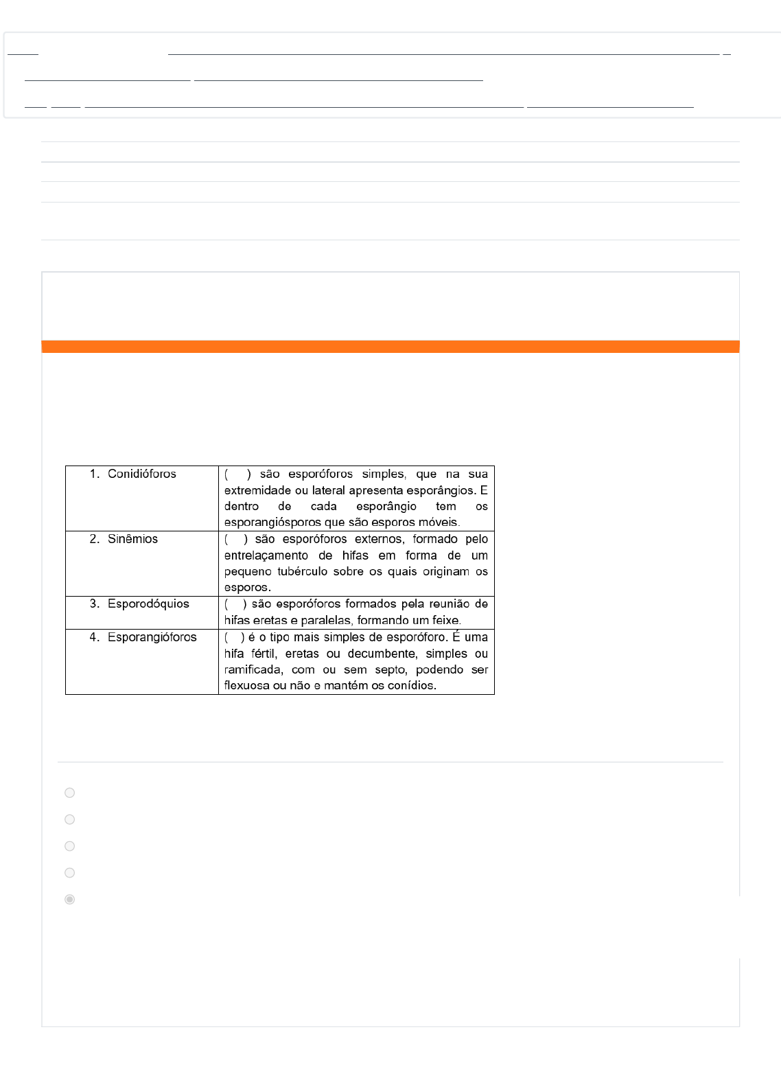 Iniciado em sábado, 18 jun 2022, 17:54 Estado Finalizada Concluída em sábado, 18 jun 2022, 18:05 Tempo empregado 11 minutos 31 segundos Avaliar 6,00 de um máximo de 6,00(100%) Questão 1 Correto Atingiu 0,60 de 0,60 Os esporóforos, hifas diferenciadas do sistema vegetativo, tem o crescimento limitado e uma estrutura especial pois diferenciam quanto a posição, apresentando –se simples ou compostos. Os esporóforos simples são constituídos por uma única hifa ereta ou decumbente. Enquanto que os esporóforos compostos são constituídos por feixes ou massas complexas de hifas. Assim sendo, relacione a coluna da direita com a da esquerda: Assinale a alternativa correta: a. 1, 4, 3, 2. b. 2, 4, 1, 3. c. 3, 2, 1, 4. d. 1, 2, 3, 4. e. 4, 3, 2, 1. Sua resposta está correta. A resposta correta é: 4, 3, 2, 1. Painel / Minhas Disciplinas / BACHARELADO EM CIÊNCIAS BIOLÓGICAS EAD-disc. 3-Mód. 6- MICROBIOLOGIA GERAL E BIOSSEGURANÇA / PROVA CURRICULAR - REALIZAÇÃO DIA 16/06/2022 À 19/06/2022 - VALOR 6,0 PONTOS / CLIQUE AQUI PARA REALIZAR A PROVA CURRICULAR - DIA 16/06/2022 À 19/06/2022 - VALOR 6,0 PONTOS - 1ª OPORTUNIDADE https://www.eadunifatecie.com.br/course/view.php?id=9173 https://www.eadunifatecie.com.br/course/view.php?id=9173 https://www.eadunifatecie.com.br/my/ https://www.eadunifatecie.com.br/course/view.php?id=9173 https://www.eadunifatecie.com.br/course/view.php?id=9173#section-14 https://www.eadunifatecie.com.br/mod/quiz/view.php?id=265077 Questão 2 Correto Atingiu 0,60 de 0,60 As bactérias são microrganismos procariontes, o núcleo não é delimitado por membranas. A maioria é formada por uma única célula e apesar dos seus 3, 5 bilhões de anos durante os quais têm evoluído a célula bacteriana é simples se observarmos em um microscópio ótico sua forma, tamanho e arranjo. Na verdade, por trás desta simplicidade se esconde uma maquinaria altamente complexa no seu interior, se observarmos em um microscópio eletrônico moderno, vamos ver estruturas que raramente poderiam ser vistas ou sequer imaginadas pelos primeiros micologistas. As bactérias podem apresentar formas. Quanto a essas formas, analise as afirmativas abaixo: I. Esféricas. II. Cilíndricas. III. Espiraladas. IV. Geométricas. Assinale a alternativa correta: a. Apenas I, II e IV estão corretas. b. Apenas I, III e IV estão corretas. c. Apenas II e III estão corretas. d. Todas as alternativas estão corretas. e. Apenas I, II e III estão corretas. Sua resposta está correta. A resposta correta é: Apenas I, II e III estão corretas. Questão 3 Correto Atingiu 0,60 de 0,60 Por muito tempo pensava-se que os microrganismos não se reproduziam, pois acreditava-se que os microrganismos surgiam do nada. Hoje sabe-se que os microrganismos são capazes de se reproduzir. Diante deste cenário, analise as afirmativas abaixo quanto as formas que a célula bacteriana pode se reproduzir: I. Fissão binária. II. Brotamento. III. Sexo. IV. Fotossíntese. Assinale a alternativa correta: a. Apenas I, III e IV estão corretas. b. Apenas I e II estão corretas. c. Apenas II e III estão corretas. d. Todas as alternativas estão corretas. e. Apenas I, II e IV estão corretas. Sua resposta está correta. A resposta correta é: Apenas I e II estão corretas. Questão 4 Correto Atingiu 0,60 de 0,60 A célula fúngica é eucariótica não fotossintética que apresenta uma variedade de formas e processos celulares. Contudo, os vírus são os organismos mais simples já conhecidos, são parasitas intracelulares, que podem adentrar em qualquer tipo de célula existente. Deste modo, analise as afirmativas abaixo quanto aos fungos: I. São microrganismos procariontes, o núcleo não é delimitado por membranas. II. Os fungos constituem–se em um grupo numeroso de organismos bastante diversificado morfologicamente e filogeneticamente. III. O corpo do fungo é constituído por dois tipos básicos de estruturas, as estruturas assimilativas e as estruturas reprodutivas. IV. Apesar de heterogêneo, este grupo apresenta características básicas que permitem distingui-los dos outros seres vivos. Assinale a alternativa correta: a. Apenas I, III e IV estão corretas. b. Todas as alternativas estão corretas. c. Apenas II e III estão corretas. d. Apenas II, III e IV estão corretas. e. Apenas I, II e IV estão corretas. Sua resposta está correta. A resposta correta é: Apenas II, III e IV estão corretas. Questão 5 Correto Atingiu 0,60 de 0,60 Enquanto que a microbiologia básica estuda a natureza fundamental, as propriedades de microrganismo, a microbiologia aplicada usa os microrganismos nas mais diversas áreas da medicina, agricultura, indústrias e ambiente. Não obstante, analise as asserções abaixo: I. Os microrganismos são capazes de sintetizar várias substâncias químicas como ácido cítrico e antibióticos (Penicilina). II. Além da indústria, os microrganismos podem ser utilizados para alterar ambientes específicos, como exemplo, bactérias que extraem cobre e ferro de minérios de baixa qualidade. III. A palavra, micróbio, tem origem grega onde mikros significa pequeno e bio significa vida. Assim, microbiologia é a ciência que estuda os organismos grandes, e suas atividades biológicas. IV. Entre as técnicas mais usadas na microbiologia tem a microscopia de Luz e a Eletrônica. Assinale a alternativa correta: a. Apenas I, II e IV estão corretas. b. Apenas II e III estão corretas. c. Apenas I, III e IV estão corretas. d. Todas as alternativas estão corretas. e. Apenas II, III e IV estão corretas. Sua resposta está correta. A resposta correta é: Apenas I, II e IV estão corretas. Questão 6 Correto Atingiu 0,60 de 0,60 Os ribossomos são moléculas presentes em todos os seres vivos e que são pouco alterados ao longo dos anos, então, ele é utilizado para a classificação dos seres vivos em domínio até diferentes taxas (Unidade taxonômica). Dito isto, analise as afirmativas abaixo: I. Os ri