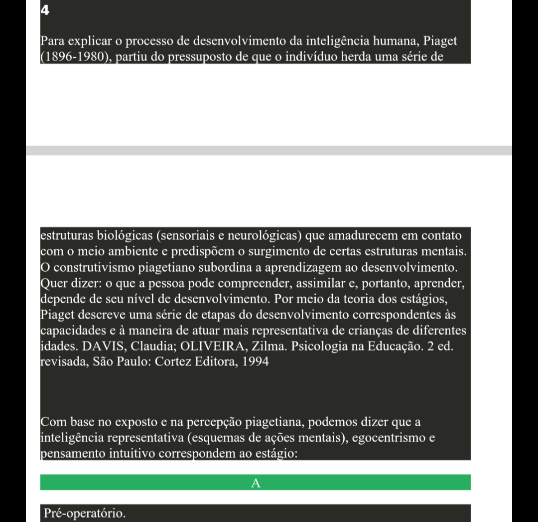4 Para explicar o processo de desenvolvimento da inteligência humana, Piaget (1896-1980), partiu do pressuposto de que o indivíduo herda uma série de estruturas biológicas (sensoriais e neurológicas) que amadurecem em contato com meio ambiente e predispõem o surgimento de certas estruturas mentais. O construtivismo piagetiano subordina a aprendizagem ao desenvolvimento. Quer dizer: que a pessoa pode compreender, assimilar e, portanto, aprender, depende de seu nível de desenvolvimento. Por meio da teoria dos estágios, Piaget descreve uma série de etapas do desenvolvimento correspondentes às capacidades e à maneira de atuar mais representativa de crianças de diferentes idades. DAVIS, Claudia; OLIVEIRA, Zilma. Psicologia na Educação. 2 ed. revisada, São Paulo: Cortez Editora, 1994 Com base no exposto e na percepção piagetiana, podemos dizer que a inteligência representativa (esquemas de ações mentais), egocentrismo e pensamento intuitivo correspondem ao estágio: A Pré-operatório.