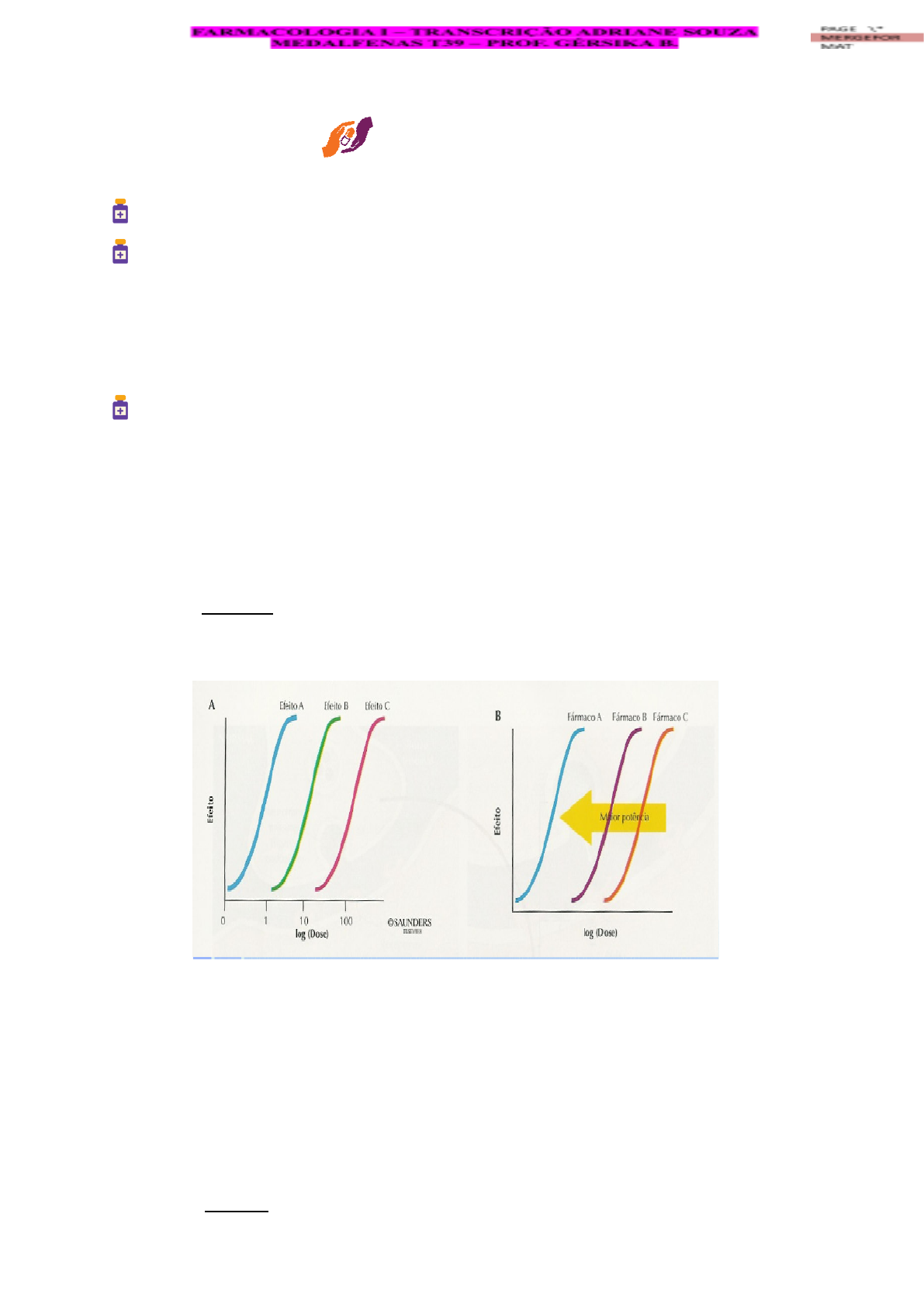 (AULA 11 – VÍDEO AULA) FARMACODINÂMICA Estudo do Mecanismo de ação dos medicamentos Estudo da interação que ocorre entre a molécula do medicamento e a estrutura do organismo. Se ligando a receptores presente em uma célula, e com isso, causando mudanças intracelulares >> EFEITO FARMACOLÓGICO. ~ Nenhum fármaco é capaz de gerar um efeito farmacológico se não interagir com o organismo ~ Possíveis efeitos dos fármacos: 1) BENÉFICOS / TERAPÊUTICOS: ● É considerado o efeito esperado de um medicamento. ● Quando o medicamento se liga ao receptor ele é capaz de produzir uma atividade intrínseca – capacidade da droga de produzir um efeito farmacológico quando ligada ao seu receptor. - POTÊNCIA: capacidade de o medicamento produzir o efeito farmacológico na menor dose possível, ou seja, quando um fármaco é muito potente deve-se adm em baixas doses para que se tenha um efeito farmacológico interessante. ~ Quanto menor a dose, maior a Potência ~ ~ Considerando um efeito de 50%, ou seja, no meio da linha na vertical, cada medicamento precisará de uma dose diferente – Sempre que for olha potência deve-se fixar uma dose a ser analisada. O medicamento A: precisa de uma dose ‘X’, se quisermos o mesmo efeito para o medicamento B será preciso uma dose maior, assim como, se quisesse do medicamento C iria precisar de uma dose maior ainda. Sendo assim, é possível concluir que o Fármaco A é o mais potente dentre eles, ou seja, necessita de menores doses para que o efeito aconteça. - EFICÁCIA: Capacidade do medicamento de produzir uma resposta farmacológica desejada- Efeito farmacológico mais intenso. Ou seja, quando um medicamento é muito eficaz, isso indica que ele produz um efeito maior/intenso. O medicamento ‘A’ tem uma curvatura maior, o que indica que ao se utilizar doses crescentes desse medicamento, o efeito também cresce, podendo assim, atingir 100%. O medicamento ‘B’ mesmo adm várias doses ele atinge um platô de cerca de 50%, ou seja, o MEDICAMENTO A’ é mais eficiente do que o ‘B’. O medicamento ‘C’ com a adm de várias doses não chega a atingir nem 50%. Ex: Morfina produz analgesia mais intensa, portanto ela é mais EFICAZ que o Paracetamol. 2) EFEITOS ADVERSOS/ COLETERAIS/ TÓXICOS: A) REAÇÕES ADVERSAS PREVISÍVEIS [acontece em pacientes normais, ou seja, sem hipersensibilidade a medicamentos/ que não possuem alergia]: - Sabe-se que àquela reação adversa pode ocorrer = previsível. - Pode acontecer por dois principais motivos: ¹ TOXICIDADE devido a SUPERDOSAGEM; Quando o paciente utiliza uma dose elevada, ou , quando o paciente utiliza uma dose terapêutica e por ele ter dificuldade de excreção, o fármaco se acumula, aumentando a concentração plasmática e posterior toxicidade. ² EFEITO COLATERAL: Ocorre devido à falta de SELETIVIDADE e ESPECIFICIDADE, pois quanto mais seletivo e específico um medicamento for para seu receptor, maior será a chance dele causar o efeito farmacológico esperado sem produzir o efeito colateral. EX: Atropina [anticolinérgico] é específica, mas não é seletiva. Ela é específica por se ligar e bloquear apenas receptores muscarínicos, mas não é seletiva, pois ela se liga a todos os receptores muscarínicos, ou seja, ela se liga a M1-SNC / M2-coração / M3-M. liso [brônquios, intestino, bexiga, glândulas]. Se utilizá-la em procedimentos para diminuir secreções ela irá realizar este papel – ESPERADO -, porém, também trará outros efeitos, já que, se liga a outros receptores – COLATERAL - EX: Clorpromazina (antipsicótico muito utilizado para esquizofrenia), espera-se que ela bloqueie os receptores dopaminérgicos no SNC, pois a dopamina em excesso é o que ocasiona a esquizofrenia. Porém ela é pouco específica e pouco seletiva, pois se a todos os receptores do organismo, não só nos dopaminérgicos, como por exemplo: Muscarínicos / Histamínicos / Alfa-Adrenérgico; Dessa maneira, ela causa muitos efeitos indesejáveis, ou seja, COLATERAIS. ● ÍNDICE TERAPÊUTICO [fornece a margem de segurança/ quão seguro o fármaco é] IT = Índice Terapêutico – a distância entre TD50 e ED50 - DT = Dose Tóxica 50, ou seja, para 50% dos pacientes ED = Dose Eficaz 50 ~ Quanto maior o índice terapêutico de um medicamento, maior será a sua margem de segurança, ou seja, quanto maior o numerador = TD50 - dose tóxica, maior tem que ser sua margem demonstrando ser um fármaco seguro ~ ³ EFEITOS SECUNDÁRIOS DIRETOS E INDIRETOS: Às vezes alguns medicamentos são utilizados para tratar alguma doença e seu uso pode provocar outra doença. EX: ANTIBIÓTICOS geram Colite Pseudomembranosa; A Clindamicina é um medicamento que além de eliminar as bactérias do foco infeccioso, também elimina algumas bactérias do trato gastrointestinal, exceto a Clostridium difficile, o que fará com que ele tem maior fonte de alimentação e comece a se multiplicar, liberando uma toxina que leva a essa doença secundária. EX: Pacientes que utilizam GLICOCORTICOIDES na bombinha pra asma, se ele faz o uso do medicamento de maneira incorreta, como ele diminui a imunidade, ele pode ficar na região orofaríngea e essa cândida pode multiplicar e ocasionar Candidose orofaríngea. B) EFEITO ADVERSO IMPREVISÍVEL - que acontece em pacientes hipersensíveis: - Acontece por 3 motivos: ● INTOLERÂNCIA: Mesmo em pequenas doses o paciente apresenta efeito adverso. EX: Ácido Acetilsalicílico – alguns pacientes podem apresentar zumbido no ouvido – comuns em casos de intoxicações -. Mas alguns pacientes mesmo em baixas doses. ● REAÇÕES IDIOSSINCRÁSICAS: Reações individuais/ inespecíficas de um determinado medicamento a um determinado paciente. Sendo considerado como uma resposta ANORMAL, porém existem indivíduos que podem apresentar estes efeitos. ● REAÇÕES ALÉRGICAS: Acontecem em um número limitado de pacientes; Sendo resposta do sistema imunológico frente a determinada 