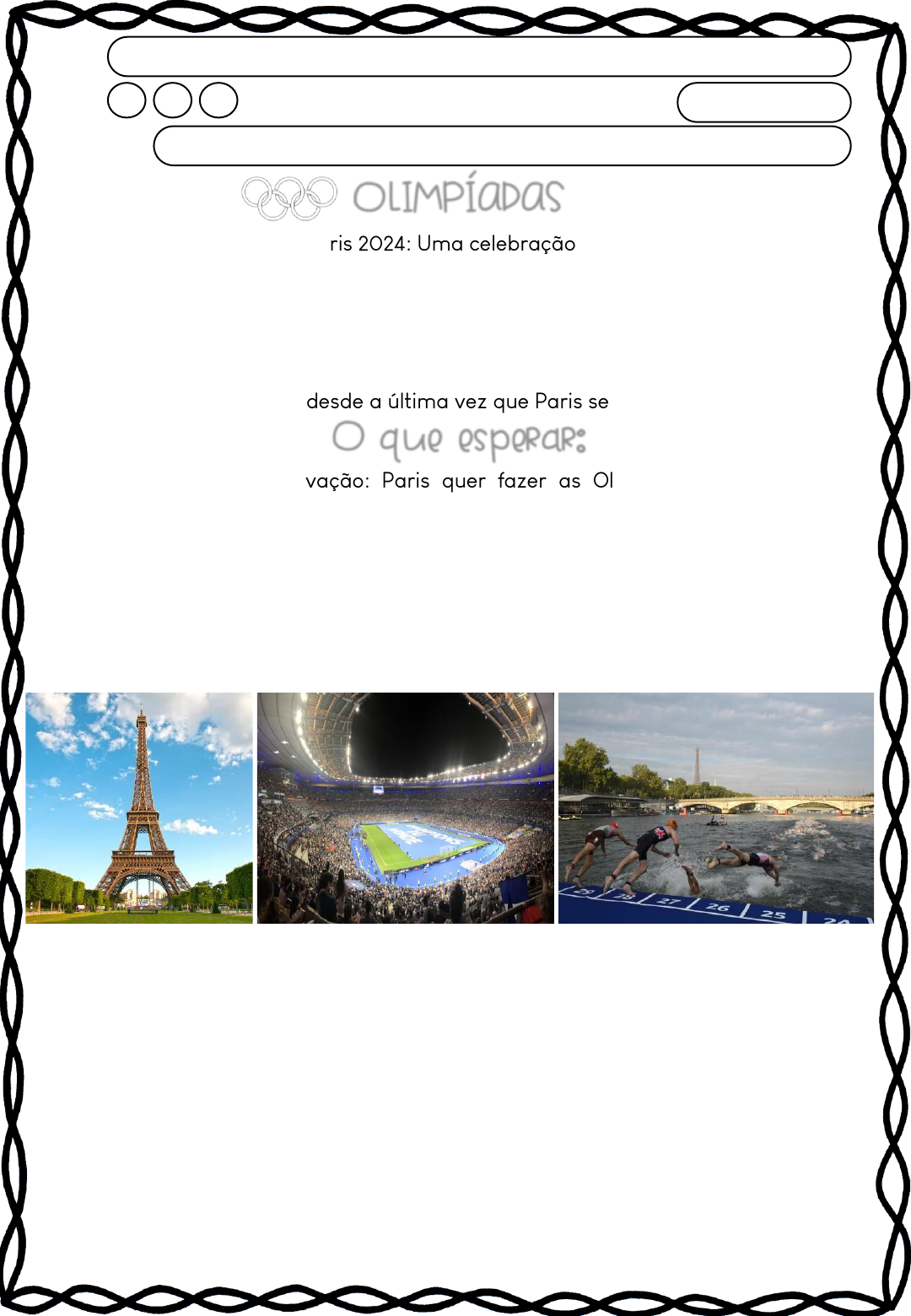 As Olimpíadas de Paris 2024: Uma celebração de esporte e cultura! As Olimpíadas de Paris 2024 prometem ser um evento memorável, marcado pela celebração do esporte, da cultura e da inovação. Programadas para acontecer entre os dias 26 de julho e 11 de agosto, os Jogos Olímpicos retornarão à capital francesa após um hiato de 100 anos, desde a última vez que Paris sediou o evento em 1924. 1. Sustentabilidade e Inovação: Paris quer fazer as Olimpíadas mais verdes da história, usando locais já existentes e transportes como bicicletas e transporte público para reduzir a poluição. 2. Locais Icônicos: Os jogos serão em lugares famosos como a Torre Eiffel, o Stade de France, o Grand Palais e o Palácio de Versalhes. A abertura será incrível, com atletas desfilando ao longo do Rio Sena. 3. Inclusão e Diversidade: Pela primeira vez, haverá o mesmo número de homens e mulheres competindo. Além disso, os Jogos Paralímpicos terão mais atletas do que nunca, mostrando que todos podem brilhar no esporte. 4. Novos Esportes: Prepare-se para ver esportes novos e empolgantes como breakdance, skate, surfe e escalada esportiva. 5. Legado Duradouro: As melhorias na cidade, como novas instalações esportivas e melhores transportes, ficarão para o futuro. Paris também está investindo em programas para incentivar os jovens a praticarem esportes. Data: Turma: Estudante: Escola: OLIMPÍADAS O que esperar: As Olimpíadas de Paris 2024 vão ser mais do que um evento esportivo – será uma grande festa global celebrando a humanidade, a diversidade e o espírito olímpico! 1. Quais são as datas programadas para a realização das Olimpíadas de Paris 2024? _______________________________________________________________________ 2. O que torna as Olimpíadas de Paris 2024 um evento memorável? _______________________________________________________________________ _______________________________________________________________________ 3. A afirmação abaixo, é verdadeira ou falsa? “As Olimpíadas de Paris 2024 \vão \acontecer \pela primeira \vez \na \história \na \capital \francesa.” ( ) Verdadeira ( ) Falso 4. Associe cada conceito com a descrição correta: • ( ) Sustentabilidade e Inovação • ( ) Locais Icônicos • ( ) Inclusão e Diversidade • ( ) Novos Esportes • ( ) Legado Duradouro 1. Haverá o mesmo número de homens e mulheres competindo. 2. Uso de bicicletas e transporte público para reduzir a poluição. 3. Novos esportes como breakdance e skate. 4. Melhorias na cidade que beneficiarão a população a longo prazo. 5. Jogos em lugares famosos como a Torre Eiffel. 5. Explique como Paris pretende tornar as Olimpíadas de 2024 mais sustentáveis. _______________________________________________________________________ _______________________________________________________________________ _______________________________________________________________________ _______________________________________________________________________ 6. Complete a frase corretamente: “Pela \primeira \vez \na história \das Olimpíadas, \haverá o \mesmo \número \de _________ \e _________ competindo.” TESTANDO CONHECIMENTOS 7. Explique com suas palavras o que são os Jogos Olímpicos? ______________________________________________________________________ ______________________________________________________________________ 8. Quais são os novos esportes que serão incluídos nas Olimpíadas de Paris 2024? A) Breakdance, skate, surfe e escalada esportiva B) Natação, futebol, basquete e vôlei C) Rugby, cricket, tênis e golfe D) Tiro com arco, esgrima, judô e karatê 9. Em que país fica Paris? _________________________________________________ 10. Qual é o nome do rio que atravessa Paris? ______________________________________________________________________ 11. Quais são alguns dos valores que os atletas olímpicos devem seguir? ______________________________________________________________________ ______________________________________________________________________ 12. Como as novas instalações construídas para as Olimpíadas podem beneficiar a população local no futuro? A) As novas instalações esportivas e melhorias no transporte público proporcionarão mais oportunidades para a prática de esportes e facilitarão a mobilidade na cidade. B) As novas instalações serão demolidas após os Jogos Olímpicos. C) As novas instalações serão usadas apenas para eventos futuros. D) As novas instalações não terão impacto significativo para a população local. 13. O que as Olimpíadas de Paris 2024 representam para a humanidade? A) Uma celebração global da humanidade, da diversidade e do espírito olímpico. B) Apenas um evento esportivo sem relevância cultural. C) Um momento para competir sem considerar a inclusão e a diversidade. D) Uma festa exclusiva para atletas profissionais. 1. Sobre as Olimpíadas, pinte as alternativas VERDADEIRAS: 2. Qual é o intervalo de anos entre a realização dos Jogos Olímpicos? ________________________________________________________________________ 3. Leia o trecho abaixo. Os Anéis Olímpicos Os anéis olímpicos são um dos símbolos mais reconhecidos no mundo do esporte. Criados por Pierre de Coubertin, fundador dos Jogos Olímpicos modernos, os cinco anéis entrelaçados representam a união dos cinco continentes habitados: África, América, Ásia, Europa e Oceania. Cada anel é de uma cor diferente — azul, amarelo, preto, verde e vermelho —, e as cores foram escolhidas porque, combinadas com o fundo branco da bandeira olímpica, representam as cores presentes em todas as bandeiras nacionais do mundo na época da criação do símbolo. Os anéis olímpicos simbolizam a universalidade dos Jogos Olímpicos e a reunião de atletas de todo o mundo em um espírito de competição amigável e respeito mútuo. Este emblema é uma poderosa lembrança do objetivo dos Jogos Olímpicos: promover a paz e a amizade interna