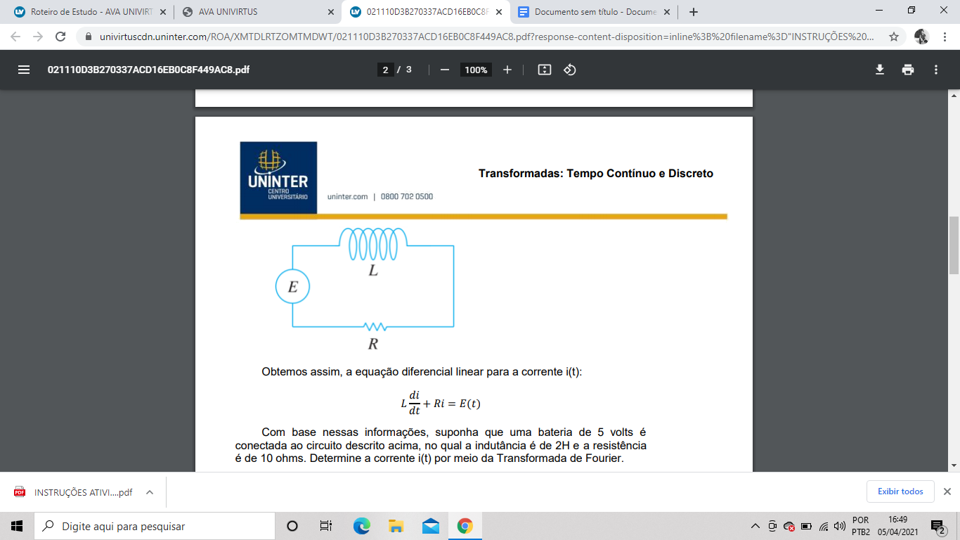 Roteiro de Estudo AVA AVA UNIVIRTUS Documento sem título Docume + 2 / 3 - 100% + + UNINTER Transformadas: Tempo Contínuo e Discreto CENTRO UNIVERSITÁRIO uninter.com 0800 702 0500 L E R Obtemos assim, a equação diferencial linear para a corrente i(t): Com base nessas informações, suponha que uma bateria de 5 volts é conectada ao circuito descrito acima no qual a indutância é de 2H e a resistência é de 10 ohms. Determine a corrente i(t) por meio da Transformada de INSTRUÇÕES ^ Exib Digite aqui para pesquisar POR 1 e PTB2 05/0