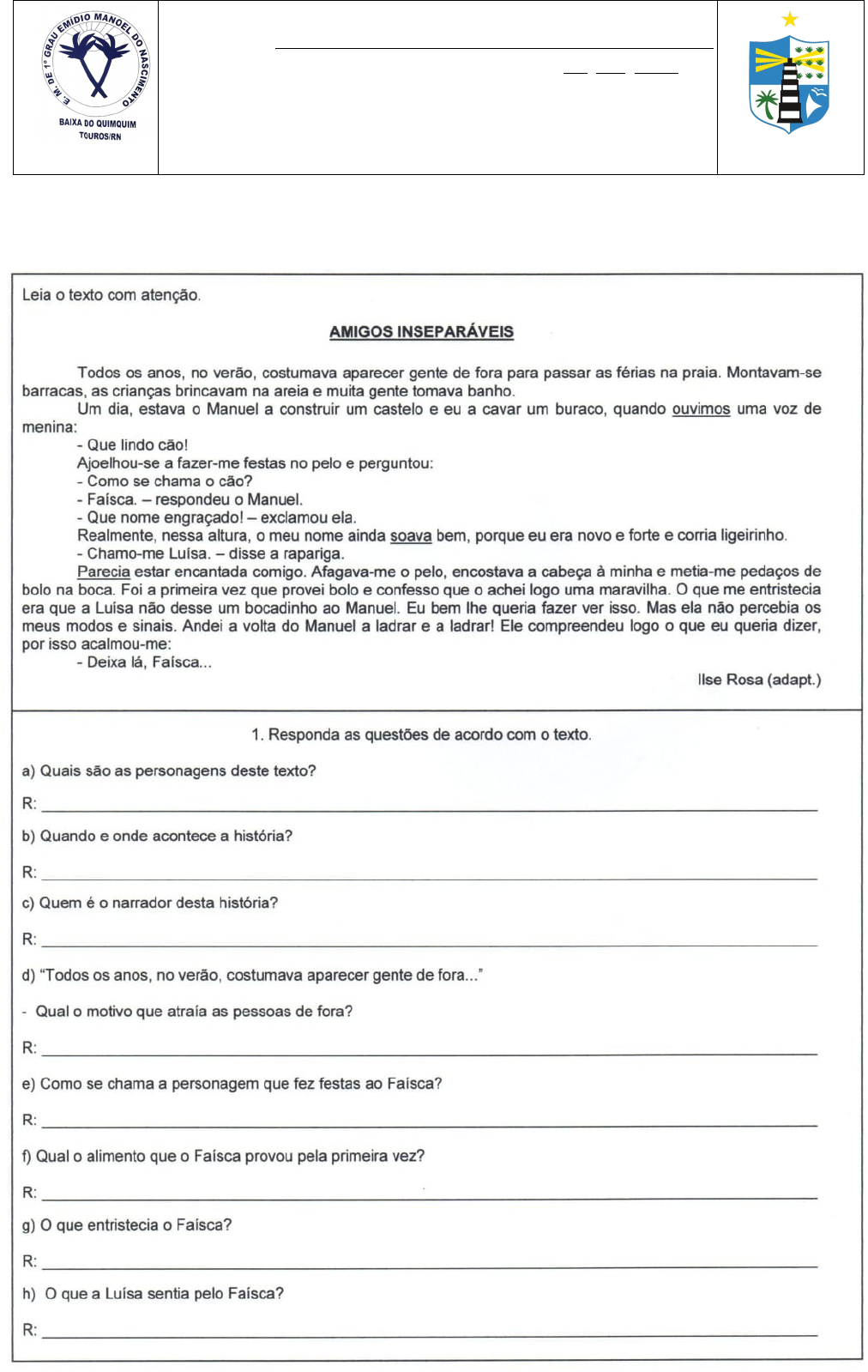ESCOLA MUNICIPAL EMÍDIO MANOEL DO NASCIMENTO ALUNO (A): PROFESSORA: LEONICE LIMA DATA: / / TURMA: 5° ANO TURMA: ÚNICA TURNO: VESPERTINO ATIVIDADE AVALIATIVA DE PORTUGUÊS DO 2º BIMESTRE ESTUDO DA GRAMÁTICA 1- Copie do quadro somente as palavras que têm hiato. RESFRIADO- LUAR- PRIMEIRO – RAIVA – GRATUITO – BOA RIACHO – CRIATURA – CANÁRIO – AGUOU – RIO - ÁLCOOL ______________________________________________________________________________________________________________________________________________________________________________________ 2- Leia as palavras do quadro e separe-as nas colunas corretas: CHEGOU – IRMÃO – OURO – CAULE – PNEU – PULMÃO – LIMÃO CHAPÉU – CRISTÃO – CAMPEÃO – PERDEU – METRO – MÃE - COUVE DITONGOS NASAIS DITONGOS ORAIS 3- Indique o tempo dos verbos em negrito nas frases. ( PRESENTE, PASSADO, FUTURO) a)- Eu lavo as panelas do almoço. _____________________________________________________________________________ b)- Carla vendeu doces na porta da escola. _____________________________________________________________________________ c)- Maria lavará muitas roupas. _____________________________________________________________________________ d)- Nós vamos ao cinema hoje. _____________________________________________________________________________ e)- Ele cantará sábodo a noite. _____________________________________________________________________________ F)- Marcos falava com Nair ao telefone. _____________________________________________________________________________ g)- O ator interpretou Romeu na peça. _____________________________________________________________________________ h- Eu tenho dois irmãos e duas irmãs. _____________________________________________________________________________ I)- Nós compramos o lanche do dia do lazer. _____________________________________________________________________________ j)- O livro custou menos que o DVD. _____________________________________________________________________________ 4 – Quais são os pronomes pessoais do caso reto simples? _____________________________________________________________________________ 5 – Conjugue o verbo ESTUDAR nos tempos que se pede: PRESENTE PASSADO FUTURO EU= ______________________ EU= _________________________ EU= _________________________ TU= _____________________ TU=_________________________ TU=_________________________ ELE=_______________________ ELE= ________________________ ELE=_________________________ NÓS=________________________ NÓS=________________________ NÓS=________________________ VÓS=________________________ VÓS=________________________ VÓS=_________________________ ELES/ELAS=__________________ ELES/ELAS=___________________ ELES/ELAS=____________________ 6 – Comple as frases com os pronomes pessoais; EU, ELE, NÓS, ELES, ELAS. a)- __________ gosto muito de tomar sorvete. b)- __________ ficamos muito felizes com o passeio. c)- __________ trabalha na fábrica de brinquedos. d)- __________ foram juntas ensaiar a música. e)- __________ cheguei na escola atrasado. f)- __________ gostam de jogar futebol com os amigos. 7 8 9 10 - Complete as palavras com X ou CH e leia: BAI___O ENCAI____E BORRA____A ____ICLETE FI____A RELA_____AR CO___A _____UTE IN____ADA ____UTEIRA CAI___A EN____ADA 11 - Separe as palavras abaixo escrita com “X” porém com sons diversos, em suas devidas colunas: FAIXA-EXPECTORANTE-CAIXA-EXALTAR-TÁXI-TÓXICO-EXEMPLO-ABAIXO-EXPLICAR-FIXO-EXAME-ENXADA-TEXTO-EXPLICAÇÃO-COMPLEXO-ÊXITO-EXPEDIENTE-EXÉRCITO-CAXUMBA-SEXO-OXIGÊNIO-EXAUSTO-ENCAIXE-CRUCIFIXO-EXERCÍCIO-FAIXA-PREFIXO-EXPANSÃO-EXTENSO. X COM SOM DE Z X COM SOM DE S X COM SOM DE CH X COM SOM DE CS 12-Ditado de frases: 1= ____________________________________________________________________________________ 2= ____________________________________________________________________________________ 3= ____________________________________________________________________________________ 4= ____________________________________________________________________________________ 5= ____________________________________________________________________________________ 6= ____________________________________________________________________________________ 7= ____________________________________________________________________________________ 8= ____________________________________________________________________________________ 9= ____________________________________________________________________________________ 10= ___________________________________________________________________________________ Pois o SENHOR é quem da sabedoria; De sua boca procedem o conhecimento e o discernimento. (Provérbios 2:6) image4.jpeg image1.png image2.png image3.jpeg