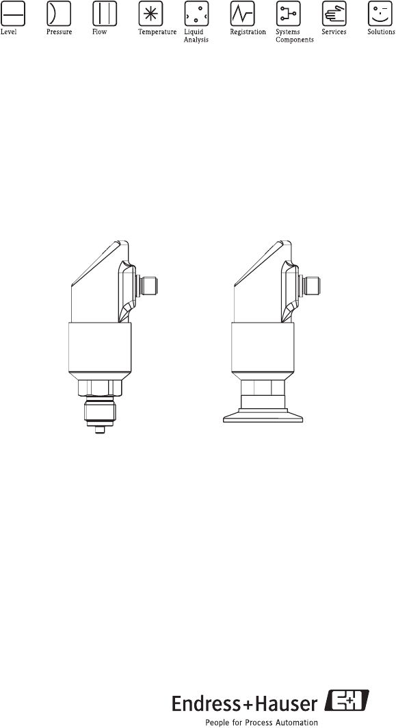 KA225P/00/en/04.04 52023607 Release 1.00.ZZ Operating Instructions Ceraphant T PTC31, PTP31, PTP35 Pressure switches Ceraphant T PTC31, PTP31, PTP35 2 Table of contents 1 Safety instructions. . . . . . . . . . . 3 1. 1 Designated use . . . . . . . . . . . . . . . . . . . . . . 3 1. 2 Installation, commissioning and operation . . 3 1. 3 Operational safety . . . . . . . . . . . . . . . . . . . . 3 1. 4 Return . . . . . . . . . . . . . . . . . . . . . . . . . . . . 3 2 Device identification . . . . . . . . . 4 2. 1 Nameplate . . . . . . . . . . . . . . . . . . . . . . . . . 4 3 Installation . . . . . . . . . . . . . . . . 5 3. 1 Incoming acceptance, storage . . . . . . . . . . . 5 3. 2 Dimensions . . . . . . . . . . . . . . . . . . . . . . . . 5 3. 3 Process connection . . . . . . . . . . . . . . . . . . . 6 3. 4 Installation instructions . . . . . . . . . . . . . . . 7 4 Wiring . . . . . . . . . . . . . . . . . . . . 8 4. 1 DC voltage version with M12 plug . . . . . . . 8 4. 2 DC voltage version with valve plug . . . . . . . 8 4. 3 DC voltage version with cable . . . . . . . . . . 9 5 Operation . . . . . . . . . . . . . . . . 10 5. 1 On-site operation . . . . . . . . . . . . . . . . . . . 10 5. 2 Operation with personal computer and ReadWin 2000 . . . . . . . . . . . . . . . . . . . . . 18 6 Accessories . . . . . . . . . . . . . . . 20 6. 1 Process connection . . . . . . . . . . . . . . . . . . 20 6. 2 Welding bosses . . . . . . . . . . . . . . . . . . . . . 24 6. 3 Electrical connection . . . . . . . . . . . . . . . . 25 6. 4 Operation with ReadWin . . . . . . . . . . . . . 25 7 Trouble-shooting. . . . . . . . . . . 26 7. 1 Errors and warnings . . . . . . . . . . . . . . . . 26 7. 2 Repair . . . . . . . . . . . . . . . . . . . . . . . . . . . 27 7. 3 Disposal . . . . . . . . . . . . . . . . . . . . . . . . . . 27 7. 4 Change status (release) . . . . . . . . . . . . . . . 27 7. 5 Change status - history . . . . . . . . . . . . . . 27 8 Most important technical data .28 8. 1 Power supply . . . . . . . . . . . . . . . . . . . . . . 28 8. 2 Output . . . . . . . . . . . . . . . . . . . . . . . . . . 28 8. 3 Operating conditions . . . . . . . . . . . . . . . . 28 9 Dangerous Goods sheet . . . . . .30 Ceraphant T PTC31, PTP31, PTP35 Safety instructions 3 1 Safety instructions 1. 1 Designated use The Ceraphant T is a pressure switch for measuring and monitoring absolute and gauge pressures. The device has been safely built with state-of-the-art technology and meets the applicable requirements and EC Directives. It can, however, be a source of danger if used incorrectly or for anything other than the designated use. 1. 2 Installation, commissioning and operation Installation, electrical connection, commissioning, operation and maintenance of the measuring system must be carried out by trained, qualified specialists authorised to perform such work by the facility's owner-operator. The specialist must have read and understood these Operating Instructions and must follow the instructions they contain. The device may only be modified and repair work carried out if this is explicitly permitted in the Operating Instructions. Damaged devices which could be a source of danger may not be commissioned and must be labelled and identified as defective. 1. 3 Operational safety • Functional safety The Ceraphant T pressure switches were developed according to the standards IEC 61508 and IEC 61511-1 (FDIS). The device version with PNP switch output and additional analog output is equipped with fault detection and fault prevention facilities within the electronics and software. This device version can therefore be used to monitor limit pressure up to SIL 2 (Safety Integrity Level). • Ex-area The Ceraphant T is not approved for use in Ex-areas. 1. 4 Return The following procedures must be carried out before a device is returned to Endress+Hauser: • Always enclose a fully completed “Declaration of Contamination” form with the device. Only then can Endress+Hauser transport and examine a returned device. A copy of the “Declaration of Contamination” can be found on the second last page of these Operating Instructions. • Remove all fluid residues. This is particularly important if the fluid is hazardous to health, e.g. flammable, toxic, caustic, carcinogenic, etc. # Warning! Do not return a measuring device if you are not absolutely certain that all traces of hazardous substances have been removed, e.g. substances which have penetrated crevices or diffused through plastic. Device identification Ceraphant T PTC31, PTP31, PTP35 4 2 Device identification 2. 1 Nameplate To identify your device, compare the complete order code and the version information on the delivery papers with the data on the nameplate. P01-PTx3xxxx-18-xx-xx-xx-001 Fig. 1: Explanation of the nameplate - see Table below Notes: • The release number indicates the change status of the device. A change in the last two figures does not have any affect on the compatibility - see also section 7. • The MWP (maximum working pressure) is specified on the nameplate. This value refers to a reference temperature of +20 °C and may be applied to the device for an unlimited time. The test pressure (Over Pressure Limit OPL) corresponds to 1.5 times the MWP and may be applied for a limited time only in order to avoid lasting damage. 1 2 3 4 5 9 10 10 10 8 6 7 11 12 13 C e ra p h a n t T M a d e in G e rm a n y D -7 9 6 8 9 M a u lb u rg p: TAG: Mat: Ser.-No.: Rel.: Order Code: MWP: U: I out: 15 L– L+ 2 1 3 4 R1 14 1 Order code 6 Degree of protection 11 Electronics 2 Serial number 7 Degree of protection 12 Current output 3 TAG number 8 Sensor range 13 Supply voltage 4 TAG number 9 Max. operating pressure 14 Connection diagram 5 Release number (change status) 10 Wetted materials 15 Approvals Ceraphant T PTC31, PTP31, PTP35 Installation 5 3 Installation 3. 1 Incoming acceptance, storage • Incoming acceptance: Check the packaging and the device for da
