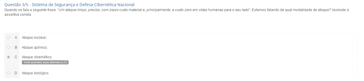 Questão 3/5 - Sistema de Segurança e Defesa Cibernética Nacional Quando se fala a seguinte frase: ataque limpo, com baixo custo material principalmente, a custo zero em vidas humanas para seu Estamos falando de qual modalidade de Assinale a assertiva A Ataque B Ataque químico; C Ataque Você assinalou essa alternativa (C) D Ataque