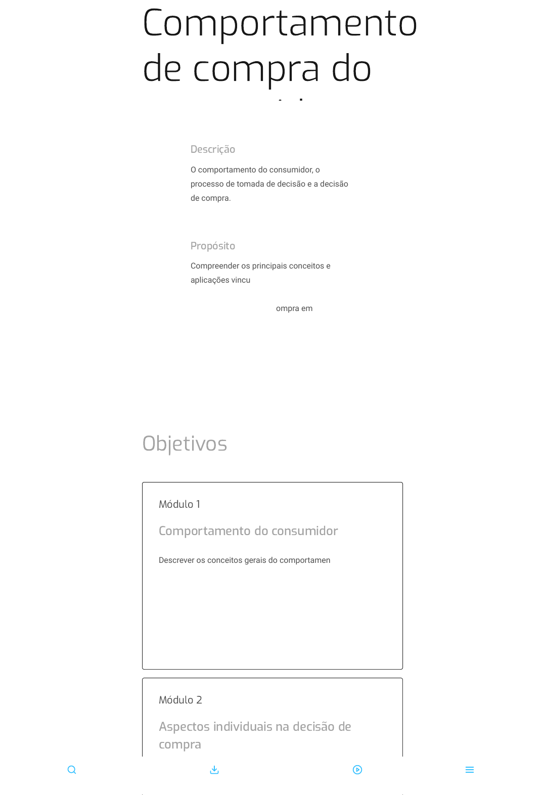 Objetivos Módulo 1 Comportamento do consumidor Descrever os conceitos gerais do comportamento de compra do consumidor. Acessar módulo Módulo 2 Aspectos individuais na decisão de compra Identificar os aspectos individuais com influência nas decisões de consumo. Comportamento de compra do consumidor Prof. Yan Bernardes Vieites Castro dos Santos Descrição O comportamento do consumidor, o processo de tomada de decisão e a decisão de compra. Propósito Compreender os principais conceitos e aplicações vinculados ao comportamento do consumidor, assim como a relação do processo decisório de compra em seus aspectos individuais e coletivos. Buscar Baixar conteúdo em PDF Vídeos Menu 26/06/2024, 22:05 Comportamento de compra do consumidor https://stecine.azureedge.net/repositorio/00212ge/00071/index.html?brand=estacio&high-contrast=true&template=high-contrast# 1/52 Acessar módulo Módulo 3 Aspectos sociais na decisão de compra Relacionar as decisões de consumo individuais com a vida em sociedade. Acessar módulo Introdução Entender o comportamento dos consumidores é um elemento essencial do marketing; afinal, seu estudo apresenta conceitos fundamentais em relação às decisões tomadas por eles. Baseadas em fatores internos e externos, elas são a causa direta das estratégias de marketing de firmas e agências. Em apenas um dia, é possível observar muitas decisões sobre a compra de produtos e serviços. Surgem então as seguintes perguntas: quais são os conceitos fundamentais para que o comportamento desse consumidor possa ser compreendido? Como funciona esse processo de decisão de consumo na nossa mente? E, por fim, como o contexto social no qual estamos inseridos influencia esse processo? Abordaremos esses assuntos de forma detalhada neste material. Do ponto de vista profissional, uma boa base de conhecimento sobre o comportamento do consumidor pode lhe proporcionar ferramentas a serem aplicadas em equipes que busquem entendê-lo melhor e utilizar o marketing de maneira mais efetiva. 26/06/2024, 22:05 Comportamento de compra do consumidor https://stecine.azureedge.net/repositorio/00212ge/00071/index.html?brand=estacio&high-contrast=true&template=high-contrast# 2/52 1 Comportamento do consumidor Ao final deste módulo, você será capaz de descrever os conceitos gerais do comportamento de compra do consumidor. 26/06/2024, 22:05 Comportamento de compra do consumidor https://stecine.azureedge.net/repositorio/00212ge/00071/index.html?brand=estacio&high-contrast=true&template=high-contrast# 3/52 Fundamentos do comportamento do consumidor Embora o conceito do comportamento do consumidor possa não soar familiar a princípio, ele está presente em boa parte das nossas vidas; afinal, somos todos consumidores. As decisões de consumo são tão rotineiras em nossas vidas que, muitas vezes, sequer nos damos conta delas. Por isso, vamos relembrar algumas em um dia comum. Ao acordarmos, escolhemos não só os tipos de alimento a serem consumidos no café da manhã, mas também a quantidade de cada um. Quando nos deslocamos para o trabalho ou faculdade, decidimos qual meio de transporte vamos utilizar. 26/06/2024, 22:05 Comportamento de compra do consumidor https://stecine.azureedge.net/repositorio/00212ge/00071/index.html?brand=estacio&high-contrast=true&template=high-contrast# 4/52 A relevância das decisões de consumo em nossas vidas é uma realidade. Com isso em mente, definiremos alguns conceitos fundamentais relativos ao comportamento do consumidor e apontaremos a importância desse estudo para as empresas. No trajeto, checamos as mensagens no e-mail e conversamos com amigos e familiares pelo celular, um aparelho que, aliás, também foi escolhido entre diversos tipos e opções de modelo. De fato, até mesmo a escolha da operadora do plano contratado reflete uma decisão de compra que nos acompanha durante boa parte do dia. Ao longo do dia, tomamos mais uma série de decisões até chegarmos a casa e nos prepararmos para dormir. Nas oito horas seguintes, descansaremos em uma cama (também fruto de uma decisão de consumo no passado) até que, no dia seguinte, possamos repetir essa imensa variedade de decisões de compra normalmente despercebidas. 26/06/2024, 22:05 Comportamento de compra do consumidor https://stecine.azureedge.net/repositorio/00212ge/00071/index.html?brand=estacio&high-contrast=true&template=high-contrast# 5/52 De�nição No passado, o comportamento do consumidor envolvia basicamente o estudo sobre as decisões que motivavam a compra de produtos. Embora ele ainda continue sendo o foco de boa parte de seu espectro analítico, o estudo desse comportamento ampliou profundamente o seu escopo ao longo dos últimos anos. Em uma abordagem mais moderna, Solomon estabelece que o comportamento do consumidor representa: O estudo dos processos envolvidos quando indivíduos ou grupos selecionam, compram, usam ou dispõem de produtos, serviços, ideias ou experiências para satisfazer necessidades e desejos. (SOLOMON, 2016) Ao compararmos, no estudo do consumo de produtos, algumas definições recentes com outras mais antigas, dois pontos ficam bastante evidentes. O primeiro deles é que, atualmente, o comportamento do consumidor também enfatiza a importância do estudo dos serviços. Em larga escala, essa mudança reflete o crescimento das vendas de serviços ao longo dos últimos anos. 26/06/2024, 22:05 Comportamento de compra do consumidor https://stecine.azureedge.net/repositorio/00212ge/00071/index.html?brand=estacio&high-contrast=true&template=high-contrast# 6/52 A evolução do consumo audiovisual Entenda como o consumo de produtos audiovisuais evoluiu ao longo do tempo graças à chegada de novas tecnologias que revolucionaram a forma de acesso a esse tipo de conteúdo. O streaming é apenas um dos inúmeros exemplos que retratam a importância dos serviços frente aos produtos para o consumidor moderno. O segundo ponto de divergência em relação ao comporta
