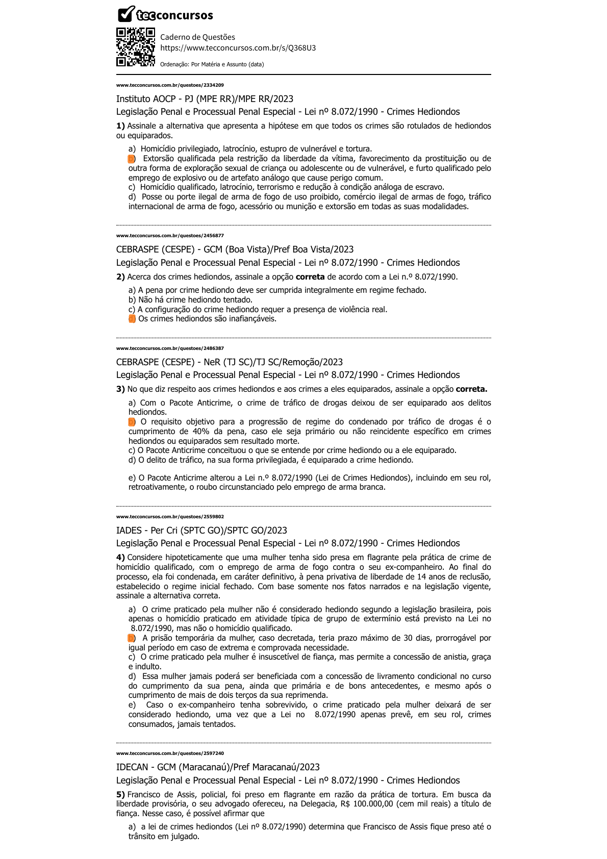 1) 2) 3) 4) 5) Caderno de Questões https://www.tecconcursos.com.br/s/Q368U3 Ordenação: Por Matéria e Assunto (data) www.tecconcursos.com.br/questoes/2334209 Instituto AOCP - PJ (MPE RR)/MPE RR/2023 Legislação Penal e Processual Penal Especial - Lei nº 8.072/1990 - Crimes Hediondos Assinale a alternativa que apresenta a hipótese em que todos os crimes são rotulados de hediondos ou equiparados. a) Homicídio privilegiado, latrocínio, estupro de vulnerável e tortura. b) Extorsão qualificada pela restrição da liberdade da vítima, favorecimento da prostituição ou de outra forma de exploração sexual de criança ou adolescente ou de vulnerável, e furto qualificado pelo emprego de explosivo ou de artefato análogo que cause perigo comum. c) Homicídio qualificado, latrocínio, terrorismo e redução à condição análoga de escravo. d) Posse ou porte ilegal de arma de fogo de uso proibido, comércio ilegal de armas de fogo, tráfico internacional de arma de fogo, acessório ou munição e extorsão em todas as suas modalidades. www.tecconcursos.com.br/questoes/2456877 CEBRASPE (CESPE) - GCM (Boa Vista)/Pref Boa Vista/2023 Legislação Penal e Processual Penal Especial - Lei nº 8.072/1990 - Crimes Hediondos Acerca dos crimes hediondos, assinale a opção correta de acordo com a Lei n.º 8.072/1990. a) A pena por crime hediondo deve ser cumprida integralmente em regime fechado. b) Não há crime hediondo tentado. c) A configuração do crime hediondo requer a presença de violência real. d) Os crimes hediondos são inafiançáveis. www.tecconcursos.com.br/questoes/2486387 CEBRASPE (CESPE) - NeR (TJ SC)/TJ SC/Remoção/2023 Legislação Penal e Processual Penal Especial - Lei nº 8.072/1990 - Crimes Hediondos No que diz respeito aos crimes hediondos e aos crimes a eles equiparados, assinale a opção correta. a) Com o Pacote Anticrime, o crime de tráfico de drogas deixou de ser equiparado aos delitos hediondos. b) O requisito objetivo para a progressão de regime do condenado por tráfico de drogas é o cumprimento de 40% da pena, caso ele seja primário ou não reincidente específico em crimes hediondos ou equiparados sem resultado morte. c) O Pacote Anticrime conceituou o que se entende por crime hediondo ou a ele equiparado. d) O delito de tráfico, na sua forma privilegiada, é equiparado a crime hediondo. e) O Pacote Anticrime alterou a Lei n.º 8.072/1990 (Lei de Crimes Hediondos), incluindo em seu rol, retroativamente, o roubo circunstanciado pelo emprego de arma branca. www.tecconcursos.com.br/questoes/2559802 IADES - Per Cri (SPTC GO)/SPTC GO/2023 Legislação Penal e Processual Penal Especial - Lei nº 8.072/1990 - Crimes Hediondos Considere hipoteticamente que uma mulher tenha sido presa em flagrante pela prática de crime de homicídio qualificado, com o emprego de arma de fogo contra o seu ex-companheiro. Ao final do processo, ela foi condenada, em caráter definitivo, à pena privativa de liberdade de 14 anos de reclusão, estabelecido o regime inicial fechado. Com base somente nos fatos narrados e na legislação vigente, assinale a alternativa correta. a) O crime praticado pela mulher não é considerado hediondo segundo a legislação brasileira, pois apenas o homicídio praticado em atividade típica de grupo de extermínio está previsto na Lei no 8.072/1990, mas não o homicídio qualificado. b) A prisão temporária da mulher, caso decretada, teria prazo máximo de 30 dias, prorrogável por igual período em caso de extrema e comprovada necessidade. c) O crime praticado pela mulher é insuscetível de fiança, mas permite a concessão de anistia, graça e indulto. d) Essa mulher jamais poderá ser beneficiada com a concessão de livramento condicional no curso do cumprimento da sua pena, ainda que primária e de bons antecedentes, e mesmo após o cumprimento de mais de dois terços da sua reprimenda. e) Caso o ex-companheiro tenha sobrevivido, o crime praticado pela mulher deixará de ser considerado hediondo, uma vez que a Lei no 8.072/1990 apenas prevê, em seu rol, crimes consumados, jamais tentados. www.tecconcursos.com.br/questoes/2597240 IDECAN - GCM (Maracanaú)/Pref Maracanaú/2023 Legislação Penal e Processual Penal Especial - Lei nº 8.072/1990 - Crimes Hediondos Francisco de Assis, policial, foi preso em flagrante em razão da prática de tortura. Em busca da liberdade provisória, o seu advogado ofereceu, na Delegacia, R$ 100.000,00 (cem mil reais) a título de fiança. Nesse caso, é possível afirmar que a) a lei de crimes hediondos (Lei nº 8.072/1990) determina que Francisco de Assis fique preso até o trânsito em julgado. https://www.tecconcursos.com.br/s/Q368U3 https://www.tecconcursos.com.br/questoes/2334209 https://www.tecconcursos.com.br/questoes/2456877 https://www.tecconcursos.com.br/questoes/2486387 https://www.tecconcursos.com.br/questoes/2559802 https://www.tecconcursos.com.br/questoes/2597240 6) 7) 8) 9) b) não era necessário o oferecimento da fiança, pois a lei de crimes hediondos (Lei nº 8.072/1990) determina que a prisão em flagrante seja convertida em prisão temporária com prazo de 30 (trinta) dias. c) a fiança, nos crimes hediondos e a eles equiparados, não pode ser em dinheiro, e sim no oferecimento de restrições domiciliares à liberdade de locomoção. d) a lei de crimes hediondos (Lei nº 8.072/1990) não permite que o delegado conceda a fiança requerida para Francisco de Assis. www.tecconcursos.com.br/questoes/2615422 IBADE - IP (SEJUS ES)/SEJUS ES/2023 Legislação Penal e Processual Penal Especial - Lei nº 8.072/1990 - Crimes Hediondos De acordo com a Lei n. 8.072/1990, considera-se hediondo o crime de: a) estupro de vulnerável; b) furto de coisa comum; c) extorsão indireta; d) dano qualificado; e) estelionato. www.tecconcursos.com.br/questoes/2625031 DRH DPE-SP - Estag (DPE SP)/DPE SP/Pós-Graduação em Direito/2023 Legislação Penal e Processual Penal Especial - Lei nº 8.072/1990 - Crimes Hed