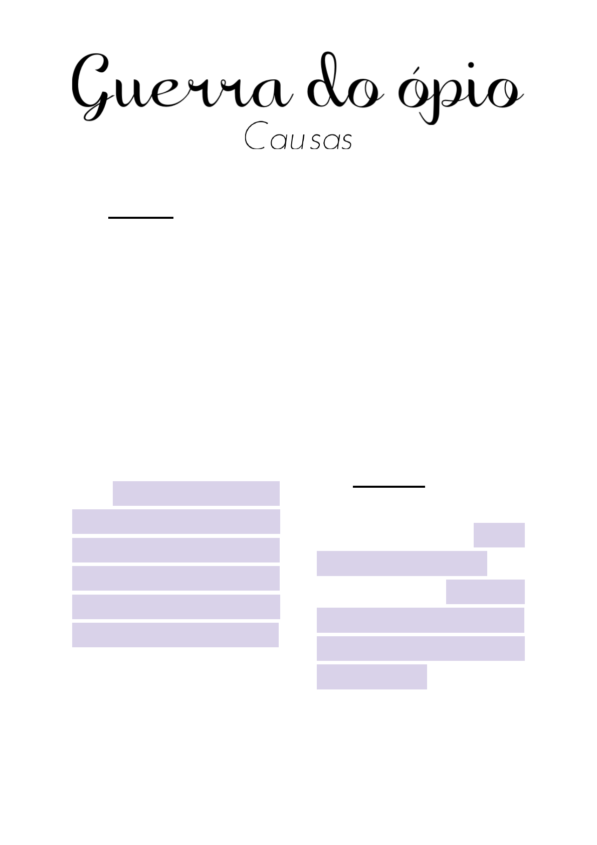 ● 1°Guerra Teve como principal motivo o comércio do ópio dos ingleses na China. A partir de 1800 a China já fazia decretos proibindo o consumo da droga. Entretanto, não foram suficientes para impedir a comercialização, por isso em 1839 fizeram novos decretos que proibiam definitivamente o comércio, aprendendo também mais de 20 mil caixas da droga e expulsaram os comerciantes. No mesmo ano, os ingleses descontentes com as ações da China, decretam guerra. Porém a guerra só teve início em 1840. A 1° Guerra durou 2 anos (1840 - 1842). Os chineses foram derrotados e em decorrência disso assinaram o tratado de Nanquim que tornava possível o comércio dos ingleses na China. ● 2° Guerra A segunda guerra ocorreu em decorrência da quebra no tratado de Nanquim. Isso aconteceu pois, o governo Chines *embargou um dos navios representantes da coroa inglesa. Logo após isso, a Inglaterra declarou uma 2° Guerra à China. ● 1°Guerra causa: Em 1939 a China fez novos decretos que proibiam definitivamente o comércio do ópio, aprendendo também mais de 20 mil caixas da droga juntamente a isso expulsaram os comerciantes ingleses. ● Desfecho da primeira Guerra: A China foi derrotada na primeira guerra e com isso assinaram o tratado de Nanquim que dava livre acesso dos ingleses a comerciar na China, além de possibilitar diversas coisas de interesse do governo inglês. ● 2° Guerra quebra no tratado de Nanquim.(o governo Chines *embargou um dos navios representantes da coroa inglesa.) Essa segunda guerra resultou na tomada de mais regiões estratégicas do comércio chinês, como também a capital do império, a cidade de Pequim, onde com a ajuda dos franceses, invadiu a cidade e incendiou o Palácio de Verão, do imperador chinês" ● Desfecho da segunda Guerra: Mais uma vez a China foi derrotada.