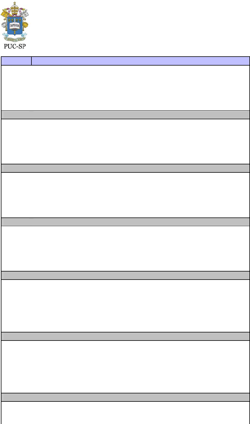 Pontifícia Universidade Católica de São Paulo Geografia (Bacharelado) PERÍODO ATIVIDADES PEDAGÓGICAS / DISCIPLINAS 1 A CONSTRUÇÃO DO CONHECIMENTO E O SENTIDO DO DISCURSO GEOGRAF 1 ANÁLISE GEOGRÁFICA 1 FUNDAMENTOS DE GEOLOGIA PARA A GEOGRAFIA 1 INTRODUÇÃO AO PENSAMENTO TEOLÓGICO I 1 PROCEDIMENTOS QUANTITATIVOS EM GEOGRAFIA 1 SOCIEDADES E CARTOGRAFIAS 2 CARTOGRAFIA 2 GEOGRAFIA DA PRODUÇÃO E DA CIRCULAÇÃO 2 GEOPROCESSAMENTO: INTRODUÇÃO 2 HISTÓRIA 2 LÍNGUA PORTUGUESA 2 LINGUAGEM E ALFABETIZAÇÃO GEOGRÁFICA 3 DIMENSÃO GEOGRAFICA DA CIDADE E DO CAMPO 3 DIMENSÃO GEOGRÁFICA DAS DINÂMICAS CLIMÁTICAS 3 DIMENSÃO GEOGRÁFICA DO RELEVO I 3 FUNDAMENTOS ANÁLITICOS PARA O PLANEJAMENTO TERRITORIAL 3 GEOGRAFIA DAS CULTURAS 3 TRATAMENTO E INTERPRETAÇÕES DE IMAGENS 4 FUNDADORES DA GEOGRAFIA 4 GEOGRAFIA AGRÁRIA APLICADA 4 GEOGRAFIA DA BIOSFERA I 4 GEOGRAFIA DAS DINÂMICAS HÍDRICAS 4 GEOGRAFIA URBANA APLICADA 4 RECURSOS NATURAIS E ENERGÉTICOS 5 ANTROPOLOGIA 5 DIMENSÃO GEOGRÁFICA DO RELEVO II 5 FORMAÇÃO TERRITORIAL DO BRASIL I 5 GEOGRAFIA REGIONAL DO MUNDO I 5 PAISAGEM, TERRITÓRIO E REGIÃO 5 PENSAMENTO SOCIOLÓGICO CONTEMPORÂNEO 5 SUP ESTAG: DISC GEOGRÁFICOS E A ESC COMO VEIC DE DIVUL CIENT 6 ANÁLISE E INTERVENÇÃO EM IMPACTOS AMBIENTAIS 6 DINÂMICA TERRITORIAL DA CULTURA E DAS RELAÇÕES DE PODER 6 FORMAÇÃO TERRITORIAL DO BRASIL II 6 GEOGRAFIA REGIONAL DO MUNDO II 6 INTRODUÇÃO AO PENSAMENTO TEOLÓGICO II 6 PODERES E CONTRA PODERES 6 SUP DE ESTÁGIO: ESTUDO GEOGRÁFICO DA ESC E O PROC ENS APREN 7 ANÁLISE DO SISTEMA DE TRANSPORTE E LOGÍSTICA 7 ANÁLISE E INTERVENÇÃO EM SITUAÇÕES DE RISCO 7 ATIVIDADE DE PESQUISA I Pontifícia Universidade Católica de São Paulo Geografia (Bacharelado) 7 INTRODUÇÃO À SISTEMATIZAÇÃO DE MEMORIAL 7 OPTATIVA 7 POLÍTICAS PÚBLICAS E GESTÃO TERRITORIAL 7 TOPOGRAFIA E GEODÉSIA 8 ATIVIDADE DE PESQUISA 8 CARTOGRAFIA PARA O PLANEJAMENTO TERRITORIAL 8 GEOGRAFIA DA BIOSFERA II 8 OPTATIVA 8 ORIENTAÇÃO DO TRABALHO DE CONCLUSÃO DE CURSO (BACHARELADO) 8 PATRIMÔNIO CULTURAL E CONSERVAÇÃO 8 PLANEJAMENTO ENERGÉTICO E DE RECURSOS HÍDRICOS 8 SEMINÁRIOS DE PESQUISA