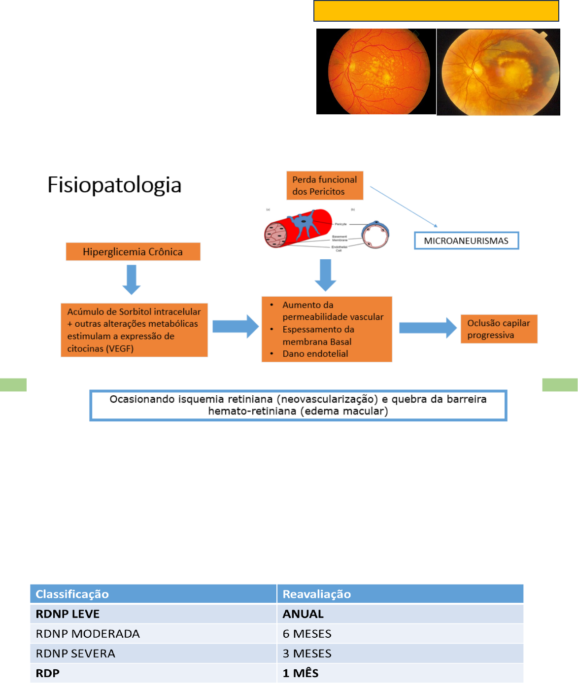 Resivsão oftalmo 2 Anatomia e patologia da retinaSECA EXSUDATIVA Perda de visão central-doença da macula (DMRI) DMRI-seca x exsudativa Vitamina, óculos escuro e cessar tabagismo Exsudativa-drogas anti-VEGF (neovascular) Retinopatia diabética Tempo de evolução da doença Diagnostico clinico-fundo de olho Exames auxiliares retinografia, angiografia fluorescenica,(neovasos), tomografia de coerência optica (edema macular) e ultrassonografia ocular DM Tipo I: 5 anos após o diagnóstico; DM Tipo II: imediatamente após o diagnóstico e anualmente se primeiro exame normal Se alterado: · Retinopatia diabética não proliferativa (qualquer estágio) com edema macular Injeção intravítrea de anti-VEGF · Retinopatia diabética proliferativa Panfotocoagulação à laser + Injeção intravítrea de anti-VEGF Casos refratários ou complicados (descolamento de retina, proliferação fibrovascular e hemorragia vítrea persistente): Vitrectomia RETINOPATIA HIPERTENSIVA ANATOMIA E PATOLOGIA DA ORBITA E DO NERVO ÓPTICO Sinais e sintomas (orbita) · Hiperemia · Dor (normalmente no movimento ou piora com este) · Quemose (edema conjuntival) · Exoftalmia (proptose) / enoftalmia / distopia · Retração palpebral · Baixa acuidade visual · Sensação pulsátil / sopro audível · Oftalmoplegia · Alterações do fundo de olho · Edema de disco · Atrofia óptica · Shunts optociliares · Dobras de coroide Exames- TC Celulite pré-septal x pós-septal (orbitária) · Indicação de exames de imagem: · Dúvida se é celulite orbitária (proptose, quemose, acuidade visual diminuída, defeito pupilar aferente relativo DPAR e motilidade ocular alterado ou doloroso.) Celulite orbitária bacteriana – Tratamento · Internação hospitalar (Avaliação otorrinolaringológica e oftalmológica frequente, se criança: aconselhamento pediátrico); · Antibióticos via intravenosa: conforme a resistência local, (Ex: ceftazidima IV + metronidazol VO) devem ser continuados até que o paciente esteja afebril durante 4 dias, seguidos por 1 a 3 semanas de tratamento oral; · Monitoração da função do nervo óptico; · Cirurgia: · Drenagem de um abscesso orbital deve ser considerada em uma fase precoce; · Drenagem dos seios infectados deve ser considerada se houver falha de resposta aos antibióticos ou uma doença muito grave dos seios; · Biópsia de tecido inflamatório pode ser realizada em um quadro clínico atípico; · A compressão do nervo óptico grave pode justificar uma situação de cantotomia/cantólise de emergência; Oftalmopatia de Graves · Causa mais frequente tanto de proptose bilateral como unilateral no adulto. · Pode ocorrer em pacientes com hipertireoidismo tratado, eutireoideos e hipotireóideos. · Fatores de risco: tabagismo (principal), sexo feminino, iodo radioativo · Patogênese: Reação autoimune órgão-específica, na qual um anticorpo contra células da glândula tireoide e fibroblastos orbitais acarreta inflamação dos músculos, tecidos intersticiais, gordura orbital e glândulas lacrimais. · Diagnóstico: RM, em casos inconclusivos biópsia muscular; · Sintomas. Aspereza, olhos vermelhos, lacrimejamento, fotofobia, pálpebras inchadas e desconforto retrobulbar; · Sinais: Tétrade: proptose, retração palpebral, neuropatia óptica e miopatia restritiva; Outros: Hiperemia epibulbar, edema periorbital, Insuficiência lacrimal, sinais na córnea, GLAUCOMA (NEUROPATIA ÓPTICA GLAUCOMATOSA) O glaucoma é uma neuropatia óptica progressiva caracterizada por perda de campo visual à medida que a lesão progride e na qual a PIO é fator-chave modificável Campo visual computadorizado Avalia funcionalmente o nervo óptico. Permite identificar o dano glaucomatoso e acompanhar a progressão do defeito. Classificação: Congênito/Adquirido Primário-Ângulo aberto ou ângulo fechado/Secundário (patologia ocular ou não ocular identificável) Crise de glaucoma · Dor ocular intensa · Cefaléia · Baixa acuidade visual · Halos coloridos · Náuseas · Vômitos Tratamento · Forma aguda: · Posição supina · Prednisona colírio · Colírios hipotensores: Timolol · Acetazolamida 250 mg 6/6h (contraindicação: alergia a sulfas) · Manitol 20% EV, 1 a 2 g/Kg · Iridotomia Yag laser · Forma crônica: · Controle da pio · Iridotomia profilática Trabeculectomia NEUROPATIAS ÓPTICAS INFLAMATÓRIAS Neurite óptica desmielinizante isolada (NODI) Fisiopatologia: inflamação e desmielinização de qualquer segmento do nervo óptico; Manifestações clínicas: · Baixa acuidade visual aguda (horas ou dias); · Dificuldade na diferenciação de cores e dor ocular ou retro-ocular que piora com movimentos; · Fotópsias; · Fenômeno de Uhthoff Defeito pupilar aferente relativo presente; Disco óptico edemaciado (36 – 58% dos casos); Ressonância nuclear magnética com contraste - hiperintensidade em T2 com o realce do nervo (observados em 84% dos nervos afetados); OCT: perda axonal (episódio prévio); · Tratamento: · Adultos: Pulsoterapia com metilprednisolona (1g/dia, endovenoso, ao longo de 1 hora, durante 3 dias consecutivos), seguida por 1 mg/kg/dia via oral em redução lenta em 8-12 semanas. · Crianças: 15mg/Kg/dia de metilprednisolona EV (equivale a 1g/dia em adultos). Manifestações oculares do Diabetes Mellitus · Pálpebras: xantelasma (apesar de pouco específica). · Conjuntiva: alterações na microcirculação (vasodilatação, fluxo sangüíneo lento, etc.) · Músculos extra-oculares: paralisia do III e/ou VI pares. · Córnea: dobras na membrana de Descemet. · Íris: ectrópio da úvea, rubeose e vacuolização. · Cristalino: catarata / flutuações na refração. · Corpo ciliar: espessamento da membrana basal. · Humor vítreo: corpúsculos asteróides. · Nervo óptico: atrofia (rara). · Retina: retinopatia e lipemia URGÊNCIAS OFTÁLMICAS · Alívio dos sintomas (analgésicos sistêmicos / colírios cicloplégicos); · Sempre excluir perfuração