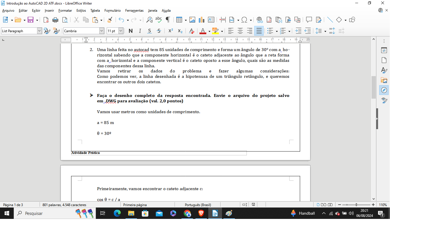 Introdução ao AutoCAD 2D ATF.docx LibreOffice Writer Arquivo Editar Exibir Inserir Formatar Estilos Tabela Formulário Ferramentas Janela Ajuda a abc List Paragraph Cambria 11 pt N I S S A 10 11 12 13 14 15 16 17 18 19 2. Uma linha feita no autocad tem 85 unidades de comprimento e forma um ângulo de 30° com a ho- rizontal sabendo que a componente horizontal é o cateto adjacente ao ângulo que a reta forma com a horizontal e a componente vertical é o cateto oposto a esse ângulo, quais são as medidas das componentes dessa linha. Vamos retirar os dados do problema e fazer algumas considerações: Como podemos ver, a linha desenhada é a hipotenusa de um triângulo retângulo, e queremos encontrar os outros dois catetos. Faça o desenho completo da resposta encontrada. Envie arquivo do projeto salvo em DWG para avaliação (val. 2,0 pontos) Vamos usar metros como unidades de comprimento. a = 85 m Atividade Prática Primeiramente, vamos encontrar o cateto adjacente C: cos Página de 3 801 palavras, 4,548 caracteres Primeira página Português (Brasil) + 110% 20:21 Pesquisar Handball 06/08/2024 2