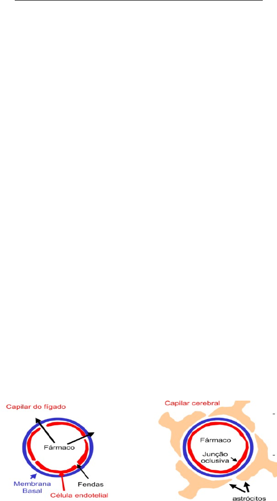 DISTRIBUIÇÃO DE MEDICAMENTOS O QUE É DISTRIBUIÇÃO DE MEDICAMENTOS? É a passagem de substâncias da corrente sanguínea para os tecidos alvos, onde então o fármaco irá atuar e desenvolver o seu efeito farmacológico. A diferença principal entre o processo de absorção e o de distribuição é o sentido do movimento do soluto (fármaco): Absorção: o fármaco está caminhando do local de administração para a corrente sanguínea; Distribuição: o fármaco está saindo da corrente sanguínea para atuar em um determinado tecido. FATORES QUE PODEM INFLUENCIAR A DISTRIBUIÇÃO DE MEDICAMENTOS: Permeabilidade capilar: É determinada pela estrutura do capilar e pela natureza química do fármaco. A organização do endotélio do capilar sanguíneo obedece basicamente a 2 conformações: · Capilares periféricos: passagem de substâncias hidrofílicas e/ou de baixo PM, pelas fenestras. Substâncias lipossolúveis atravessam as membranas. · Capilares centrais (BHE): passagem de partículas extremamente lipossolúveis e em raros casos, de pequeníssimo PM. Por não possuir fenestras (abertura), as substâncias hidrossolúveis não conseguem passar. · Fármacos lipossolúveis entram facilmente · Fármacos ionizáveis ou polares não entram facilmente · Grandes fendas permitem ampla passagem do fármaco entre o sangue e o interstício hepático. · Estrutura capilar é contínua e não existe fendas. Lipossolubilidade, hidrossolubilidade e grau de ionização: Lipossolúvel apolar não ionizada (s/ carga) coef. partição O/A difusão passiva Hidrossolúvel polar ionizada (c/ carga) coef. Partição O/A peso molecular atravessa poros Peso molecular Quanto menor o peso molecular, mais fácil de atravessar as fenestras do capilar. Fluxo sanguíneo e perfusão do tecido alvo: quanto maior o fluxo sanguíneo e a perfusão do tecido, melhor será a distribuição do fármaco. Para tal devemos contar com uma boa vascularização. fluxo sanguíneo perfusão · Vascularização: quantidade de vasos de um determinado tecido. · Fluxo sanguíneo: quantidade de sangue que passa por uma secção transversal de um vaso, por unidade de tempo. · Perfusão: é a razão entre a quantidade de sangue que entra e a quantidade de sangue que sai de um determinado órgão, tecido ou local. Exemplo: · Tecidos muito rapidamente perfundidos: rins, coração, cérebro e fígado. · Tecidos mediamente perfundidos: pele e musculo (durante o repouso) · Tecido pouco perfundidos: adiposo e conjutivo Ligação aos tecidos de reserva: Tecidos ósseo, adiposo e muscular. Sítios de reserva = sítios de perda, pois enquanto estiverem ligados a estes tecidos, deixam de exercer ação farmacológica. Importante: considerar a saturabilidade dos tecidos. Exemplo: · Tetraciclina - afinidade com tecido ósseo – hipoplasia dentaria · DDT (INSENTICIDA) – afinidade por tecido adiposo – saturação – intoxicação – problemas respiratórios, renais e no SNC = morte Ligação às proteínas plasmáticas: Além dos tecidos de reserva, os fármacos também tem afinidade de ligação a estas proteínas. É uma ligação reversível entre o fármaco e proteínas plasmáticas (principalmente albumina), retardando sua passagem para fora do compartimento vascular. Qual a importância da ligação fármaco-proteína plasmática? Essa ligação serve para estocar o fármaco na corrente sanguínea e retardar a sua distribuição, prolongando a duração do efeito farmacológico. O que pode acontecer quando dois fármacos são administrados simultaneamente? Interação Medicamentosa < 30: é baixo 30 a 60: bom, equilíbrio > 100: alto Volume de Distribuição Vd = Quantidade de fármaco no organismo Concentração do fármaco no plasma · Quantifica a distribuição · Vd muito baixo – fármaco está com elevada concentração plasmática e baixa concentração nos tecidos. Exemplo: Digoxina é muito lipossolúvel - vai para o tecido adiposo - diminui conc. Plasmática - aumenta Vol. dist (Vd) Atenção ao tempo de meia vida! · Fígado e rim – órgão voltado para eliminação · Atenção aos pacientes com problemas hepáticos ou renal!! · Tempo de maia vida tende a ser maior, precisando de ajuste de dose. Nível placentário: barreira menos seletiva, formada pela diferença de pressão entre a circulação materna e a fetal. Substâncias lipossolúveis e hidrossolúveis de PM a atravessam. Entre a circulação materna e a fetal existe um tempo mínimo de equilíbrio de substâncias, de 15 a 40 min, dependendo da substância. Por este motivo, cirurgias de cesariana não devem ultrapassar a duração máxima de 30 minutos. BIOTRANSFORÇÃO DE MEDICAMENTOS BIOTRANSFORMAÇÃO (Metabolismo de Fármacos) É a alteração da estrutura química do medicamento dentro do organismo, através da ação de enzimas O que são xenobióticos? São compostos de origem exógena aos quais os seres humanos estão expostos. Podem ser medicamentos, drogas, inseticidas, agrotóxicos, poluentes, fumaça, aditivos químicos, aditivos naturais (flavonóides, terpenos, ... ), fitoterápicos e etc. A biotransformação se destina a aliviar a carga destes xenobióticos. · Os medicamentos possuem certas características (lipofilicidade, pouca ionização em pH fisiológico, ligação com proteínas plasmáticas) que levam a uma baixa excreção renal e a um longo tempo de ação no organismo, necessitando, portanto serem biotransformados. · Fármacos lipossolúveis são mais passíveis de sofrer biotransformação por atravessarem mais facilmente a membrana celular. · Os fármacos mais hidrossolúveis geralmente não necessitam de biotransformação e são excretados normalmente intactos (in natura). Onde ocorre a Biotransformação? Ocorre principalmente no fígado por este possuir um complexo enzimático bastante eficiente para tal (REL e microssomas). Outros locais: rim, epitélio gastrintestinal, pulmões e plasma. Qual é o objetivo da B