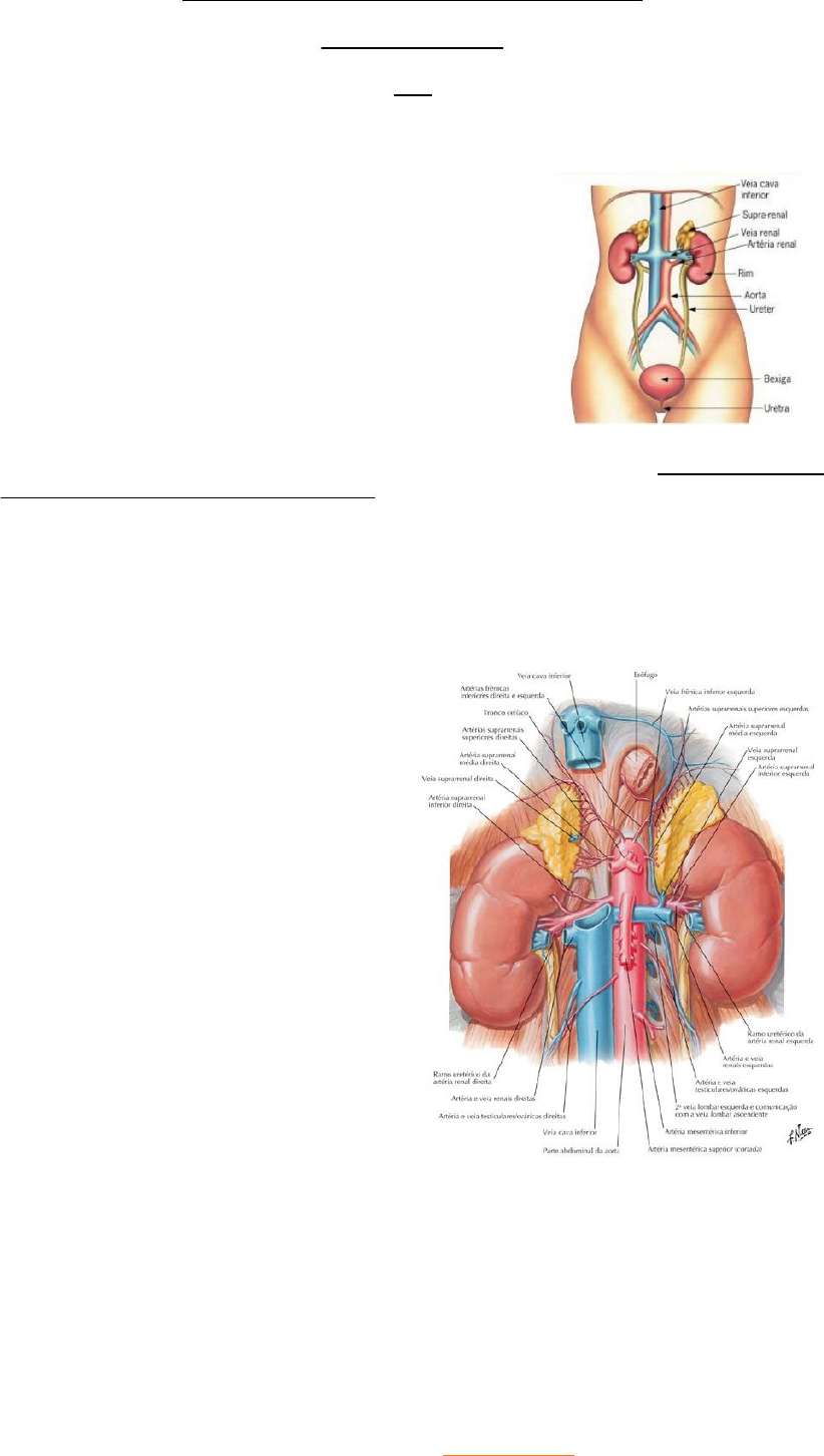 Utilizamos cookies essenciais e tecnologias semelhantes de acordo com a nossa Política de Privacidade e, ao continuar você concorda com essas condições. Ok MORFOLOGIA I – SÉRGIO NADER – 12/04/2017 ABDOME PARTE 3 RIM Peritônio é a Serosa que contém no seu interior a maioria das vísceras abdominais. É o elemento externo dos órgãos. Os Rins são órgãos Retroperitoniais, ou seja, são localizados bem posteriormente na cavidade abdominal. Junto com eles estão as Glândulas Supra Renais, Veia Cava Inferior e Artéria Aorta, todos atrás do Peritônio. Eles não estão presos por nenhum Meso. Existe uma gordura que tem um papel importante em termos de sustentar o Rim na sua posição. Em uma Nefrectomia (procedimento de retirada do Rim), o acesso é costal e lateral, não invadindo a cavidade peritonial. Os dois Rins, em termos de topografia, apresentam uma diferença: o Rim Direito é um pouco mais baixo que o Rim Esquerdo, devido à presença do Fígado. O rim esquerdo chega a tocar o nível da 11ª costela, já o rim direito não o faz. O Hilo Renal é a abertura nos rins por onde os vasos chegam a estes órgãos. Nele se encontram três elementos principais, nesta ordem (de anterior para o posterior): a Veia Renal, a Artéria Renal e a Pelve Renal. A pelve renal é um elemento coletor, por onde a urina passa. A Veia Cava Inferior está à direita da coluna, o que faz com que ela esteja mais próxima ao Rim Direito. Por consequência, a Veia Renal Direita é bem menor do que a Veia Renal Esquerda. Já a Artéria Renal Esquerda é um pouco menor do que a Artéria Renal Direita, pois a Artéria Aorta está quase no plano mediano, porém mais próxima ao rim esquerdo. O Rim possui dois extremos: Pólo (ou Extremidade) Renal Superior e Pólo ( ou Extremidade) Renal Inferior. O Pólo Renal Superior relaciona-se intimamente com a Glândula Supra Renal. Existem duas margens, onde a margem lateral é convexa, enquanto a margem medial possui uma reentrância que dá origem ao Hilo. https://sobreuol.noticias.uol.com.br/normas-de-seguranca-e-privacidade Utilizamos cookies essenciais e tecnologias semelhantes de acordo com a nossa Política de Privacidade e, ao continuar você concorda com essas condições. Ok O Rim é revestido por uma Cápsula Fibrosa. Por dentro, ele possui uma região mais periférica, de coloração geralmente mais clara, chamada Córtex Renal. A córtex, em vários momentos, projeta-se em direção à Medula Renal, formando as chamadas Colunas Renais. Entre cada uma das colunas existe uma estrutura de formação triangular, que tem a base voltada para a periferia e o ápice voltado para o meio, que são as Pirâmides Renais, que são estruturas da Medula Renal. Nos ápices das pirâmides encontram-se os Óstios das aberturas dos canalículos que vão trazer a urina. Grosseiramente pode-se pensar que nos ápices das pirâmides é onde está gotejando a urina já filtrada. Ela é coletada pelos Cálices Renais Menores, que são reunidos em 2, 3 ou até 4 deles para formar os Cálices Renais Maiores, que por sua vez se reúnem para formar uma estrutura chamava Pelve Renal (antigamente chamada de Passinete). O ponto em que se tem a Pirâmide relacionada com o Cálice Menor recebe o nome de Papila Renal. É onde a urina é de fato coletada. Entre esse sistema coletor e o próprio rim existe um espaço, que é preenchido por gordura, e chama-se Seio Renal. O seio renal é o ponto em que o Hilo se formou mas se projeta ainda no interior do gordura. Parênquima Renal e forma esse espaço preenchido por A Pelve Renal se torna Ureter, mas existe um ponto que marca o limite entre os dois, que é a Junção Ureteropiélica. O Rim não possui segmentação cirúrgica como os pulmões, ele é totalmente integrado. Cada Rim tem em média 1 milhão de Néfrons. Agenesia Renal → O indivíduo nasce sem um rim. Pode acontecer de nascer sem os dois também, mas é incompatível com a vida. Rim Extra Numerário → Quando o indivíduo nasce com mais de 2 rins. Isso não quer dizer que os rins deste indivíduo sejam melhores, pelo contrário. Às vezes são mal formados e não funcionam bem. Rim Ectópico → Quando o rim se encontra na região da Pelve. https://sobreuol.noticias.uol.com.br/normas-de-seguranca-e-privacidade Utilizamos cookies essenciais e tecnologias semelhantes de acordo com a nossa Política de Privacidade e, ao continuar você concorda com essas condições. Ok Rim em Ferradura → Quando o indivíduo nasce com um só rim, que na verdade é a junção dos dois rins pelo pólo inferior, fazendo um “U”. Na formação fetal, os rins são um só, que vão subindo e se separando, formando os dois rins. Porém nesse caso, esses rins não se separam, formando esse grande rim em “U”. Eles não sobem até a mesma altura dos rins normais, porque ficam presos embaixo pela Artéria Mesentérica Superior, que prende o pólo inferior e não permite que o rim suba. Esses rins funcionam perfeitamente, na maioria das vezes. São encontrados ao acaso, geralmente fazendo uma ultra por outro motivo. Funções dos Rins A principal função do Rim é a Filtração. Porém, ele exerce outras funções, como a Reabsorção e a produção de Eritropoetina, um hormônio regulador de células sanguíneas. O rim verifica todo o sangue que passa por ele e controla a produção desse hormônio. Outra função é o Controle da Pressão Arterial → A Renina é uma enzima produzida pelo Aparelho Justaglomerular do Rim. Em última análise ela vai ser Angiotensina 1 e Angiotensina 2, esta última sendo um potente vasoconstrictor. Descobriu-se que a Angiotensina 2 está relacionada com a Hipertensão, sendo que boa parte dos indivíduos com hipertensão tem níveis de angiotensina 2 altos e são muito responsivos a ela. Daí coube à pesquisa e à indústria farmacêutica trabalhar com mecanismos que quebrem um pouco a ação da angiotensina. Logo, se a Angiotensina 2 é o vasoconstrict