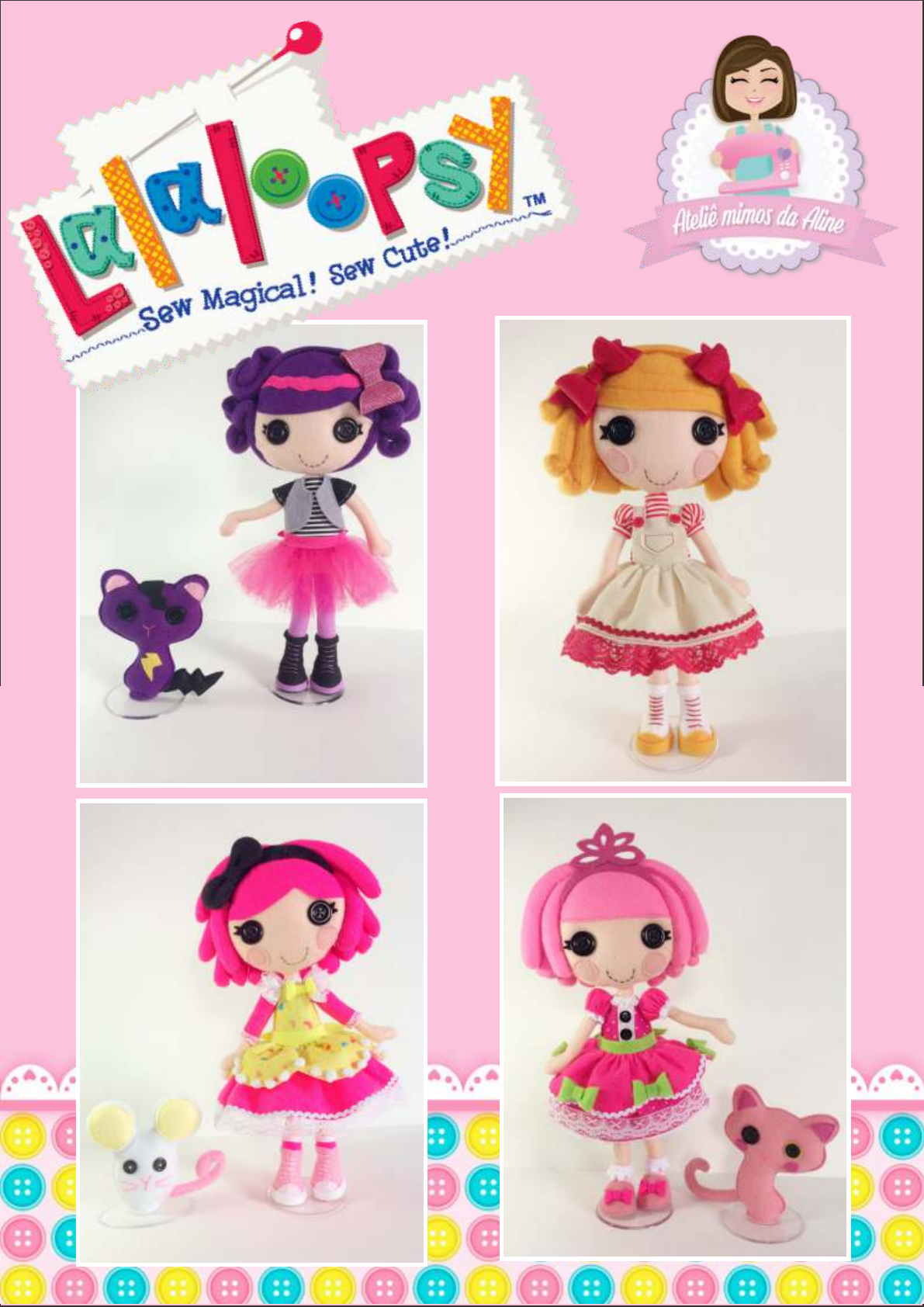 Apostila Digital Moldes - Dicas de Montagem - Pap FotográficoMoldes - Dicas de Montagem - Pap FotográficoMoldes - Dicas de Montagem - Pap Fotográfico ApresentaçãoAPRESENTAÇÃO Oii! sou Ediane Mayná , proprietária do Ateliê Mimos da Aline .Totalmente apaixonada pelo universo do artesanato em feltro .O artesanato mudou a minha vida no ano de 2014 e foi no momento de maternidade que me descobri artesã e empreendedora . A partir disso comecei a me profissionalizar na arte e atualmente trabalho desenvolvendo peças com o feltro e ensinando em apostilas e vídeos . Há um mundo mágico chamado de Lalaloopsyland! Um lugar colorido e cheio de diversão , onde as bonecas Lalaloopsy vivem diversas brincadeiras! Neste módulo você terá os moldes das bonecas e seus mascotes e algumas fotos explicativas do processo de montagem das bonecas . Ÿ Tempestade. ( boneca lilás), e seu mascote Cool cat (gatinho lilás ) Ÿ Spot ( boneca laranja), e seu mascote uma zebrinha Ÿ Crumbs ( boneca do laço preto) seu mascote é um ratinho . Ÿ Jewels ( boneca da coroa rosa) seu mascote é um gato persa . ApresentaçãoLISTA DE MATERIAIS Ÿ Maquina de costura opcional; Ÿ Tesoura ; Ÿ Lápis; Ÿ Botão preto 2cm de 4 furos para os olhos ; Ÿ Cola quente ; Ÿ Enchimento; Ÿ Agulha de mão n7 ; Ÿ Alfinetes; Ÿ Papelão Paraná; Ÿ Base de acrílico; Ÿ Arame de artesanato; Ÿ Linha de pesponto preta para borda a boca; Ÿ Feltro pele; Ÿ Feltros confete amarelo Mewi; Ÿ Feltro preto; Ÿ Feltro rubi cítrico; Ÿ Feltro branco; Ÿ Feltro rosa claro para as bochechas; Ÿ Feltro rosa claro para as botas Ÿ Feltro Pink para os cabelos; Ÿ Feltro amarelo claro para o mascote; Ÿ Feltro rosa chiclete para o mascote; Ÿ Renda 2cm; Ÿ Renda 1cm ; Ÿ Sianinha fina; Ÿ Linhas de costura comum nas cores do feltro; Crumbs Jewel Ÿ Maquina de costura opcional; Ÿ Tesoura ; Ÿ Lápis; Ÿ Botão preto 2cm de 4 furos para os olhos ; Ÿ Cola quente ; Ÿ Enchimento; Ÿ Agulha de mão n7 ; Ÿ Alfinetes; Ÿ Papelão Paraná; Ÿ Base de acrílico; Ÿ Arame de artesanato; Ÿ Linha de pesponto preta para borda a boca; Ÿ Linhas de costura comum para cada cor de feltro; Ÿ Feltro pele; Ÿ Feltro estampado St FÉ rosa Poá; Ÿ Feltro rosa chiclete; Ÿ Feltro verde cítrico; Ÿ Feltro branco; Ÿ Botões para o vestido; Ÿ Termo colante ( Entretela dupla face teclabel ) Ÿ Feltro rosa rubi cítrico para o vestido. Ÿ Feltro rosa claro para as bochechas; Ÿ Renda 2cm branca; Ÿ Sianinha fina ; Tamanho da bonecas 31cm Preço sugerido para a venda R$130,00 und Com o mascote R$150,00 Unidade dos mascotes R$ 20,00 ApresentaçãoLISTA DE MATERIAIS Ÿ Maquina de costura opcional; Ÿ Tesoura ; Ÿ Lápis; Ÿ Botão preto 2cm de 4 furos para os olhos ; Ÿ Cola quente ; Ÿ Enchimento; Ÿ Agulha de mão n7 ; Ÿ Alfinetes; Ÿ Papelão Paraná; Ÿ Base de acrílico; Ÿ Arame de artesanato; Ÿ Manta Lolita brilhosa rosa; Ÿ Tule Pink; Ÿ Tecido listrado ou feltro estampado que se aproxime da estampa; Ÿ Linha de pesponto preta para borda a boca; Ÿ Linhas de costura comum para cada cor de feltro; Ÿ Feltro pele; Ÿ Feltro preto ; Ÿ Feltro rosa Penélope ( rocho) para os cabelos; Ÿ Feltro cinza claro; Ÿ Feltro violeta para as meias; Ÿ Feltro Pink detalhe dos cabelos; Tempestade Spot Ÿ Maquina de costura opcional; Ÿ Tesoura ; Ÿ Lápis; Ÿ Botão preto 2cm de 4 furos para os olhos ; Ÿ Cola quente ; Ÿ Enchimento; Ÿ Agulha de mão n7 ; Ÿ Alfinetes; Ÿ Papelão Paraná; Ÿ Base de acrílico; Ÿ Arame de artesanato; Ÿ Linha de pesponto preta para borda a boca; Ÿ Linhas de costura comum para cada cor de feltro; Ÿ Feltro pele; Ÿ Feltro amarelo ouro; Ÿ Feltro rosa claro para as bochechas ; Ÿ Feltro bege palha; Ÿ Feltro vermelho Noel; Ÿ Feltro branco; Ÿ Feltro ou tecido listrado vermelho para a camisa e manga. Termos de uso Conteúdo protegido pela Lei de Direitos Autorais (Lei 9.610/98) O usuário que adquiriu essa apostila é livre para vender e divulgar o que confeccionar com suas próprias mãos, seguindo as explicações desta apostila. Material de Uso Individual É expressamente proibido o repasse por meio de doação ou venda desse material. Proibida a venda, divulgação, compartilhamento total ou parcial em sites, blogs, grupos ou qualquer outra forma de mídia social Vamos praticar o Artesanato Gentil. Quer fazer uma peça que você gostou? Compre a apostila e desfrute de todo o talento e esforço do artesão que você admira. Dicas de montagem Ÿ Risque os moldes no feltro. Ÿ Para riscar o molde no feltro uso Caneta Esferográfica azul ou preta. De preferência Caneta de ponta fina. Ÿ Depois de riscado o molde no lado avesso do feltro, recortamos pelo lado de dentro do risco. Ÿ Usaremos o ponto palito em quase todos os processos. Ÿ O Ponto Palito é utilizado para aplicações. As partes aplicadas com este ponto poderiam ter sido coladas, porém o acabamento que o Ponto Palito fornece à peça é incomparável. Ÿ O Ponto Caseado é utilizado para fechar as peças em Feltro, juntar duas metades. Quanto mais uniformes os pontos, mais a peça mostrará um bom acabamento. Ÿ O Ponto Atrás é muito utilizado nos trabalhos em feltro para bordar detalhes nas peças como: boca, olhos etc. Ponto caseado Ponto Palito Ponto Atrás Ÿ O molde do corpo, cabeça e braços serão utilizados em todas as bonecas, diferenciando apenas o cabelo da frente . Ÿ O molde base das botas serão utilizados em 3 bonecas . Ÿ Para cada boneca separe as cores de feltros e materiais que serão utilizados . Ÿ Os moldes estão prontos para a costura tanto a mão quanto a maquina . Ÿ Dicas de montagem da cabeça: Ÿ 1- Corte os moldes da cabeça, cabelos e bochechas em suas determinadas cores, costure as bochechas e borde as boquinhas , e por ultimo os olhos. Costure a cabeça já com o cabelo colado e preencha a com a fibra. Ÿ 2- Costure a base dos corpos, antes de fechar a costura, estruture o corpo das bonecas com um arame no pescoço e mais dois 