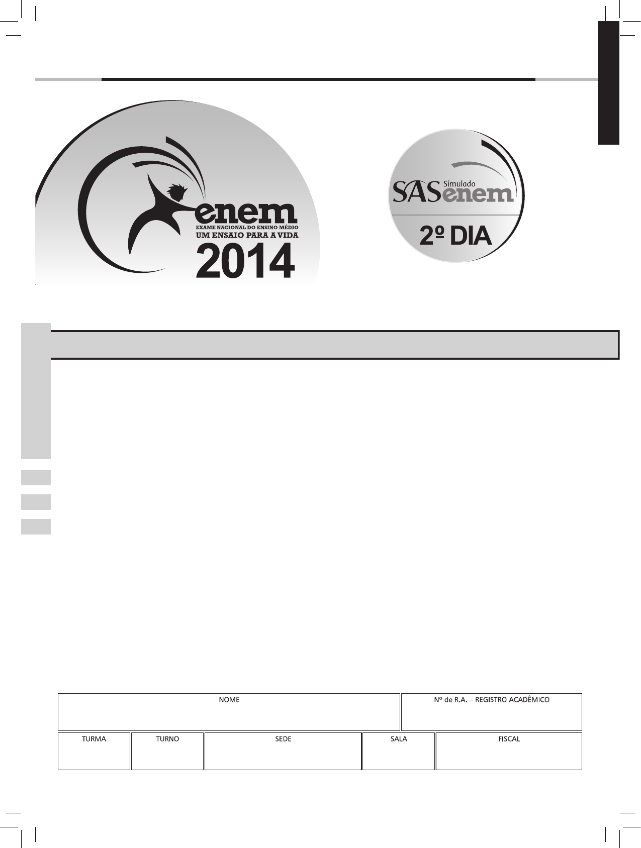 1. SERÁ ATRIBUÍDA NOTA ZERO À PROVA QUANDO O ALUNO: a) utilizar ou portar, durante a realização da prova, MÁQUINAS e/ou RELÓGIOS DE CALCULAR, bem como RÁDIOS, GRAVADORES, HEADPHONES, TE- LEFONES CELULARES ou FONTES DE CONSULTA DE QUALQUER ESPÉCIE; b) ausentar-se da sala em que se realiza a prova levan- do consigo o CADERNO DE QUESTÕES e/ou o CAR- TÃO-RESPOSTA antes do prazo estabelecido; c) agir com incorreção ou descortesia para com qualquer participante do processo de aplicação das provas; d) comunicar-se com outro participante, verbalmente, por escrito ou por qualquer outra forma; e) apresentar dado(s) falso(s) na sua identificação pessoal; f) for ao banheiro portando CELULAR, mesmo que desligado, APARELHO DE ESCUTA, MÁQUINA DE CALCULAR ou qualquer outro MATERIAL DE CON- SULTA relativo à prova. Na ida ao banheiro, durante a realização da prova, o aluno será submetido à re- vista por meio de DETECTOR DE METAL. 2. Este CADERNO DE QUESTÕES contém a Proposta de Redação e 90 questões, numeradas de 1 a 90 e dis- postas da seguinte maneira: a) as questões de número 1 a 45 são relativas à área de Linguagens, Códigos e suas Tecnologias; b) as questões de número 46 a 90 são relativas à área de Matemática e suas Tecnologias. 3. Verifique no CARTÃO-RESPOSTA se os seus dados estão registrados corretamente. Caso haja alguma divergência, comunique-a imediatamente ao aplicador. 4. Decorrido o tempo determinado, será distribuído o car- tão-resposta, o qual será o único documento válido para a correção da prova. 5. Não dobre, não amasse, nem rasure o CARTÃO-RESPOS- TA. Ele não poderá ser substituído. 6. Para cada uma das questões objetivas, são apresentadas 5 opções, identificadas com as letras A, B, C, D e E. Apenas uma responde corretamente à questão. Você deve, por- tanto, assinalar apenas uma opção em cada questão. A marcação de mais de uma opção anula a questão, mesmo que uma das respostas esteja correta. 7. No CARTÃO-RESPOSTA, marque, para cada questão, a letra correspondente à opção escolhida para a resposta, preenchendo todo o espaço compreendido no círculo, com caneta esferográfica de tinta azul ou preta. 8. Reserve os 30 minutos finais para marcar seu CARTÃO- -RESPOSTA. Os rascunhos e as marcações assinaladas no CADERNO DE QUESTÕES não serão considerados na avaliação. 9. O aluno, ao sair da sala, deverá entregar, definitivamente, seu CARTÃO-RESPOSTA devidamente assinado, devendo ainda assinar a folha de presença e o cartão de identificação de sala. 10. O tempo disponível para estas provas é de quatro horas e trinta minutos. EXAME NACIONAL DO ENSINO MÉDIO PROVA DE REDAÇÃO E DE LINGUAGENS, CÓDIGOS E SUAS TECNOLOGIAS PROVA DE MATEMÁTICA E SUAS TECNOLOGIAS LEIA ATENTAMENTE AS INSTRUÇÕES SEGUINTES LC – 2o dia | Página 2 PROPOSTA DE REDAÇÃO A partir da leitura dos textos motivadores seguintes e com base nos conhecimentos construídos ao longo de sua formação, redija um texto dissertativo-argumentativo em norma padrão da língua portuguesa sobre o tema AS CONSEQUÊNCIAS PARA A SOCIEDADE DO CONSUMO DE ÁLCOOL PELOS JOVENS, apresentando proposta de intervenção que respeite os direitos humanos. Selecione, organize e relacione, de forma coerente e coesa, argumentos e fatos para defesa de seu ponto de vista. Alcoolismo na adolescência Alcoolismo nunca foi problema exclusivo dos adultos. Pode também acometer os adolescentes. Hoje, no Brasil, causa grande preocupação o fato de os jovens começarem a beber cada vez mais cedo e as meninas, a beber tanto ou mais que os meninos. Pior ainda, é que certamente parte deles conviverá com a dependência do álcool no futuro. Para essa reviravolta em relação ao uso de álcool entre os adolescentes, que ocorreu bruscamente de uma geração para outra, concorreram diversos fatores de risco. O primeiro é que o consumo de bebida alcoólica é aceito e até estimulado pela sociedade. Pais que entram em pânico quando descobrem que o filho ou a filha fumou maconha ou tomou um comprimido de ecstasy em uma festa, acham normal que eles bebam porque, afinal, todos bebem. Sem desprezar os fatores genéticos e emocionais que influem no consumo da bebida – o álcool reduz o nível de ansiedade e algumas pessoas estão mais propensas a desenvolver alcoolismo –, a pressão do grupo de amigos, o sentimento de onipotência próprio da juventude, o custo baixo da bebida, a falta de controle na oferta e consumo dos produtos que contêm álcool e a ausência de limites sociais colaboram para que o primeiro contato com a bebida ocorra cada vez mais cedo. Não é raro o problema começar em casa, com a hesitação paterna na hora de permitir ou não que o adolescente faça uso do álcool ou com o mau exemplo que alguns pais dão, vangloriando-se de serem capazes de beber uma garrafa de uísque ou dez cervejas em um final de semana. Não se pode esquecer de que, em qualquer quantidade, o álcool é uma substância tóxica e que o metabolismo das pessoas mais jovens faz com que seus efeitos sejam potencializados. Não se pode esquecer também, de que ele é responsável pelo aumento do número de acidentes e atos de violência, muitos deles fatais, a que se expõem os usuários. Disponível em: <http://drauziovarella.com.br/dependencia-quimica/alcoolismo-na-adolescencia/>. Acesso em: 16 jan. 2014. Jovens e álcool O último Levantamento Nacional sobre o Uso de Drogas, realizado pelo Centro Brasileiro de Informações sobre Drogas Psicotrópicas (Cebrid) e pela Secretaria Nacional Antidrogas (Senad), revela que o consumo de álcool por adolescentes de 12 a 17 anos já atinge 54% dos entrevistados e desses, 7% já apresentam dependência. O estudo mostrou que entre jovens de 18 a 24 anos, 78% já fizeram uso da substância e 19% deles são dependentes. Para se ter uma ideia de como o consumo de bebidas alcoólicas na adolescência aumentou, no levantamento anterior, re