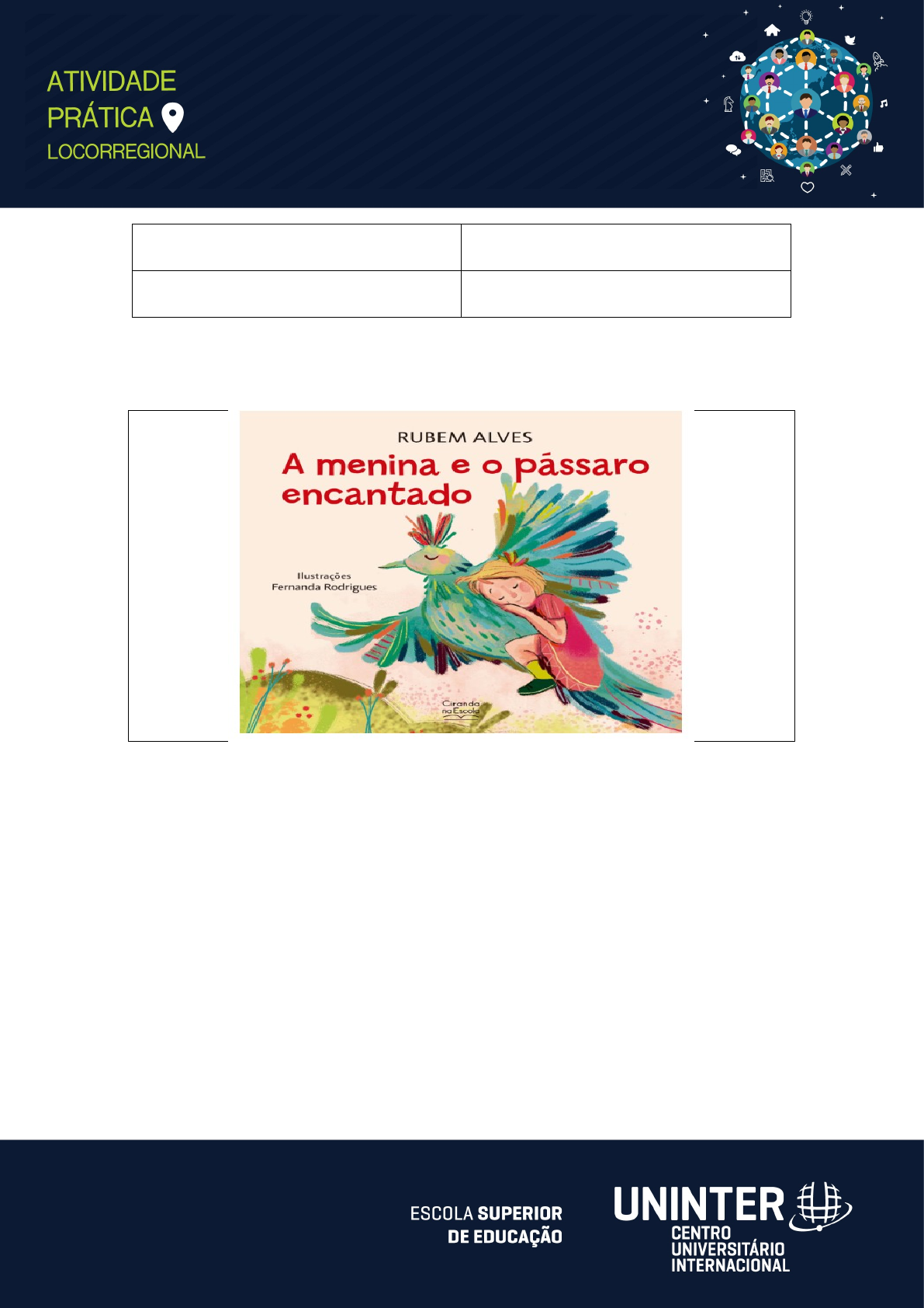 DISCIPLINA: Teoria e Crítica Literária POLO: PAP Uninter NOME: Gabriela araujo costa RU: 4365772 1. Insira no quadro a seguir o print da capa da obra escolhida como base para a sua produção. 2. Escreva no espaço abaixo sua resenha crítica. Consulte o arquivo “Orientações para produção da resenha” para informações sobre a estrutura do gênero textual e os itens a serem contemplados: (Para fundamentar e desenvolver seu texto tenha por base a obra selecionada e os textos do Material de Apoio) Digite aqui a sua resposta-texto, que deverá ter de 200 a 250 palavras. A obra “A Menina e o pássaro encantado”, de Rubem Alves, completa 33 anos. A obra escrita em 1984 é dedicada à Raquel Alves, sua filha.O livro conta a história de uma menina que tinha como seu melhor amigo um pássaro, que era livre, e justamente por ser livre ela não sabia quando ele voltaria novamente. A menina sentia muita falta do pássaro e à medida que sua saudade aumentava ele ficava encantado. A cada retorno do pássaro ele trazia uma porção de histórias.Até que um dia ela decidiu prender o passáro em uma gaiola, tirando dele seu encantamento/liberdade ate que ela vê o quanto ela o prejudicou, e o libertou novamente.Neste livro infantil, demonstra a importância de respeitar a necessidade do outro, pois conforme ele estava preso foi perdendo seu "encantamento" logo sua personalidade alegre e contagiante, se tornando outra ave, o que pode ocorrer em relacionamentos, ter tanta expectativas sobre o outro e cobranças que deixa de ser a pessoa por quem se apaixonou. Além de demonstrar a importância de saber deixar ir, cada um ter seu espaço para florescer sozinho e poder voltar para o aconchego. 3. Informe a seguir as referências dos materiais utilizados na elaboração de sua produção textual, conforme regras da ABNT: Referência bibliográfica: (insira aqui as referências encontradas) Ex: Alves,Rubem Alves, "A menina e o passáro encantado".Ciranda na Escola; 1ª edição (25 setembro 2023) Ex: SOBRENOME, Nome do autor. Título do livro. Cidade: Editora, ano. Ex: SOBRENOME, Nome do autor. Título do livro. Cidade: Editora, ano. image3.png image2.png