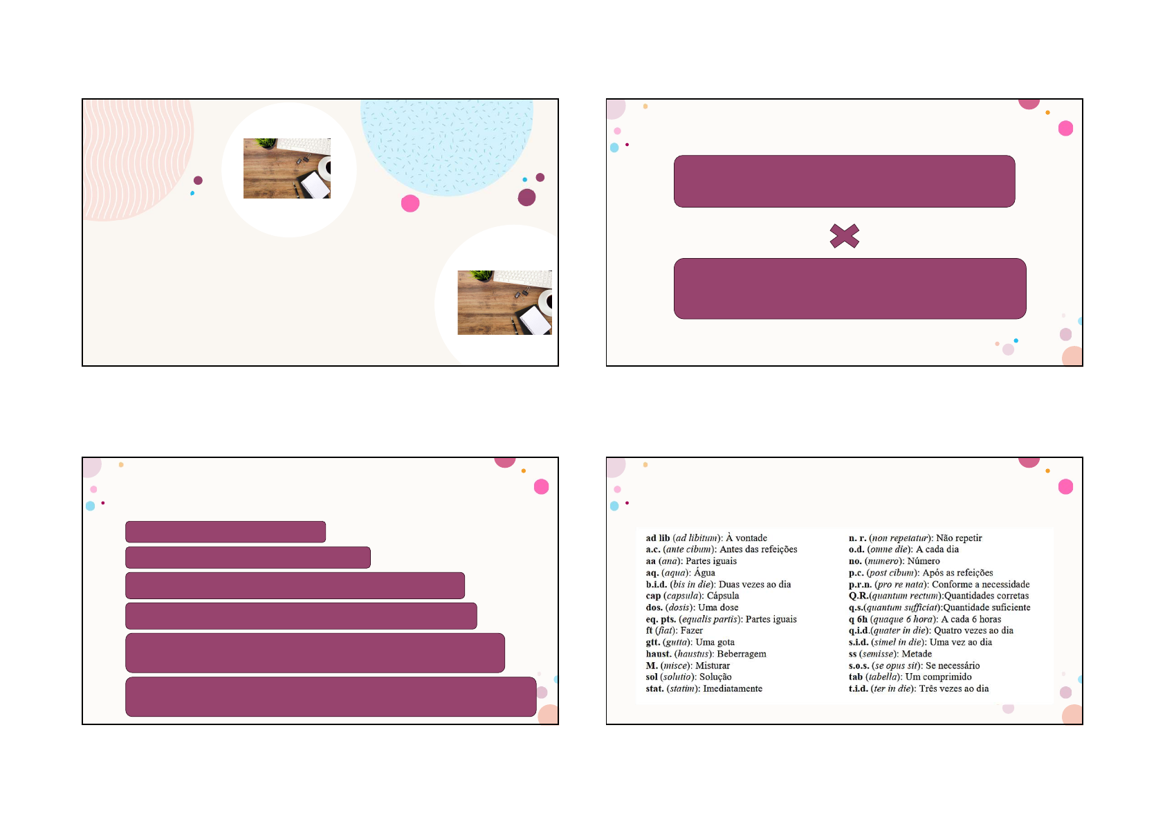 11/08/2023 1 CONCEITOS BÁSICOS E PRESCRIÇÃO MÉDICO VETERINÁRIA Profa. Dra. Lorrayne Martins Motta FARMACOLOGIA: Estudo da fonte das drogas (farmacógnosia) e da ação e destino das mesmas no organismo (farmacodinâmica) TERAPÊUTICA: Aplicação clínica da farmacologia, ou seja, como administrar determinado medicamento para o tratamento e/ou prevenção de doenças. Conceitos básicos Excipiente: onde o fármaco se encontra diluído Posologia: é o estudo da dosagem dos medicamentos (forma de uso do medicamento). Prescrição: ato de definir o medicamento a ser consumido pelo paciente, com respectiva dosagem e duração do tratamento, por meio da elaboração de uma receita médica Dose: (dose de ataque ou dose de manutenção), frequência, duração e via de administração. Bioequivalência: condição que se dá entre dois produtos farmacêuticos que são equivalentes farmacêuticos e que mostram uma mesma ou similar biodisponibilidade (efeito similar entre dois fármacos) Princípio Ativo: molécula ativa Conceitos básicos 1 2 3 4 11/08/2023 2 Conceitos básicos Classificação dos medicamentos a. Curativos: Têm como objetivo eliminar o agente causal da doença. Ex.: Antibióticos, antiparasitários e outros. b. Profiláticos: Previnem o aparecimento da doença. Ex.: Eimeriostáticos (como aditivos de ração) e vacinas. c. Sintomáticos: Combatem apenas os sintomas produzidos pela enfermidade. Ex.: Antitérmicos, analgésicos e antinflamatórios. d. Dietéticos: Visam a correção de um problema nutricional como causa primária ou secundária de uma doença. Ex.: Suplementos vitamínico-minerais. e. Diagnósticos: Auxiliam a realização de um procedimento diagnóstico. Ex.: Contrastes radiológicos. Tipos de medicamentos Medicamento de Referência: produto inovador registrado no órgão federal responsável pela vigilância sanitária e comercializado no país com um nome de marca. Medicamento Genérico: é aquele que, ao expirar a patente de um produto, é comercializado sem nome de marca. Todo medicamento genérico é o princípio ativo, mas nem todo princípio ativo é medicamento genérico. Medicamento Similar: medicamento com o mesmo princípio ativo, concentração, forma farmacêutica, via de administração, posologia e indicação terapêutica do medicamento de referência. A diferença entre o medicamento genérico e o similar é que o medicamento genérico é aprovado pela ANVISA como genérico, com o objetivo de diminuição do preço. Tipos de medicamentos Medicamento Tarjado: são medicamentos cujo uso requer a prescrição do profissional e que apresentam, em sua embalagem, tarja (vermelha ou preta). Medicamento de Venda Livre: é aquele cuja dispensação não requer autorização. 5 6 7 8 11/08/2023 3 Formas de apresentação - Líquidas Suspensões: Misturas heterogêneas entre soluto e solvente, sendo que o primeiro se deposita no fundo da solução, necessitando homogeneização Emulsões: Substâncias oleosas dispersas em meio aquoso, também apresentando separação de fases Elixires / Tinturas: Soluções para uso oral onde o álcool atua respectivamente como veículo ou solvente Xaropes: Soluções aquosas onde açúcares, em altas concentrações, são utilizados como corretivos Colírios: Soluções ou emulsões para uso nasal, oftalmológico ou otológico Soluções: Misturas homogêneas do soluto (base) com o solvente (veículo). Podem, em alguns casos, apresentar-se sob a forma de gotas Loções: Soluções aquosas, alcoólicas ou hidro-alcoólicas para uso tópico Formas de apresentação - Líquidas Formas farmacêuticas – Sólidas e semissólida Drágeas: Similar ao anterior, mas com revestimento gelatinoso que impede sua desintegração nas porções superiores do trato digestório Cápsulas: Droga e excipiente não prensados e colocados num invólucro gelatinoso Supositórios: Apresentações semissólidas para uso retal Pílulas: Apresentação onde o aglutinante (excipiente) é viscoso Óvulos e velas: Apresentações semissólidas para uso ginecológico, cuja diferença entre si é a forma Comprimidos: Mistura de droga(s), aglutinante(s) e excipiente prensados mecanicamente 9 10 11 12 11/08/2023 4 Via de administração Via de administração Prescrição • Conceito: É uma ordem escrita de um profissional devidamente cadastrado no Conselho Regional de sua profissão (CRM, CRO, CRMV) para um farmacêutico, visando ao fornecimento (dispensação) de um ou mais medicamentos a um determinado paciente. Introdução Dosagem do medicamento Quantidade exata a ser comprada Instrução da administração (via, intervalo entre doses e duração do tratamento) 13 14 15 16 11/08/2023 5 Introdução Dosagem do medicamento Quantidade exata a ser comprada Instrução da administração (via, intervalo entre doses e duração do tratamento) Partes da receita Cabeçalho Superscrição Inscrição Instrução Assinatura Exemplos de prescrição 17 18 19 20 11/08/2023 6 Exemplos de prescrição Exemplos de prescrição PORTARIA Nº 344, DE 12 DE MAIO DE 1998(*) Aprova o Regulamento Técnico sobre substâncias e medicamentos sujeitos a controle especial. • Notificação de Receita - Documento padronizado destinado à notificação da prescrição de medicamentos: a) entorpecentes (cor amarela), b) psicotrópicos (cor azul) e c) retinóides de uso sistêmico e imunossupressores (cor branca). • A Notificação concernente aos dois primeiros grupos (a e b) deverá ser firmada por profissional devidamente inscrito no Conselho Regional de Medicina, no Conselho Regional de Medicina Veterinária ou no Conselho Regional de Odontologia; a concernente ao terceiro grupo (c), exclusivamente por profissional devidamente inscrito no Conselho Regional de Medicina. • Parágrafo único. Fica vedada a prescrição de medicamentos à base de substâncias constantes da lista "C4" (anti-retrovirais), deste Regulamento Técnico e de suas atualizações, por médico v