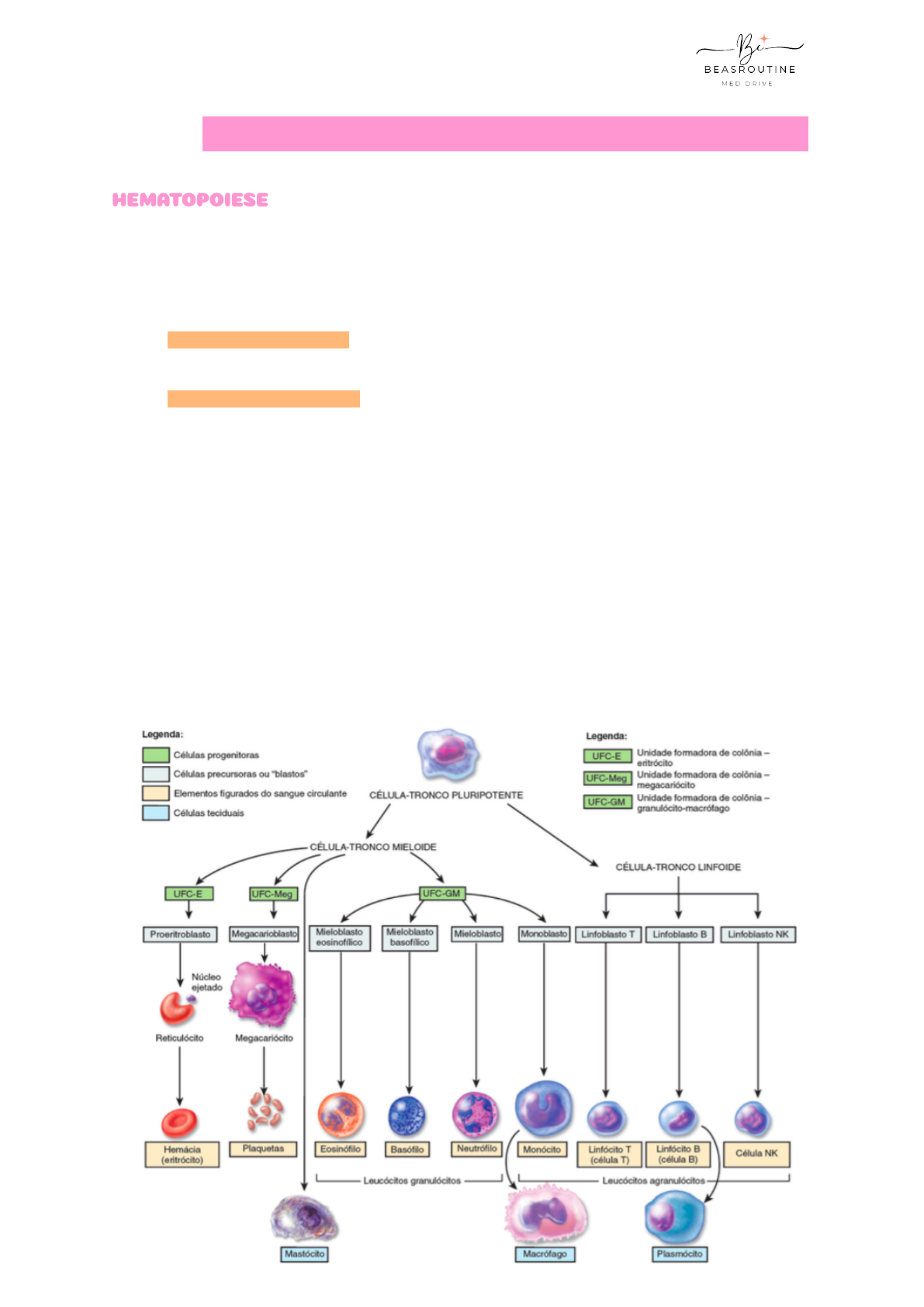 É PROIBIDO o compartilhamento desses materiais Anemi� � � � � a� aaaaaaaaaa� � � � � � � � � � � �.…. Beatriz Ignacio Carvalho - @beasroutine HEMATOPOIESE Formação das células sanguíneas a partir de células-tronco pluripotentes na medula óssea vermelha a partir das células-tronco mielóides e linfóides. 1. Células-tronco linfóides: linfócitos T e B. 2. Células-tronco mielóides: originam hemácias, plaquetas, monócitos, neutrófilos eosinófilos, basófilos e mastócitos. Durante a hematopoiese algumas células se diferenciam na linhagem progenitora, as UFC (unidades formadoras de colônia), sendo a unidade formadora das hemácias chamada UFC-E (eritrócitos). Na eritropoiese, a UFC-E origina o proeritroblasto ainda com núcleo, sob estímulo da eritropoetina produzida nos rins e auxiliado pela vitamina B12, importante para a formação do grupo heme e do ácido fólico. O proeritroblasto irá passar pelas etapas de eritroblasto basófilo, policromatófilo e ortocromático. A célula irá produzir hemoglobina e condensar e perder seu núcleo e organelas. Na próxima etapa, o reticulócito se cora de corante basofílico (azul de cresil brilhante ou de metileno) por conta dos seus remanescentes de organelas. É um estágio intermediário das hemácias maduras e cai na corrente sanguínea produzindo hemoglobina e se tornando hemácia em 1-2 dias. A contagem de reticulócitos avalia grau de compensação da medula na anemia, com mais reticulócitos na corrente sanguínea em anemias hemolíticas e menor contagem em anemias commedula hipoproliferativa. As hemácias possuem vida de 120 dias e após, são fagocitadas principalmente no baço, mas também no fígado, medula óssea e linfonodos. Suas membranas se fragilizam e É PROIBIDO o compartilhamento desses materiais rompem ao passarem por pequenos vasos. Sua degradação gera produtos recicláveis. DEFINIÇÃO E CLASSIFICAÇÃO A anemia é definida como diminuição da concentração de hemoglobina do sangue abaixo dos valores de referência para a idade e o sexo. Anemia é um termo que se aplica, ao mesmo tempo, a uma síndrome clínica e a um quadro laboratorial caracterizado por diminuição do hematócrito, da concentração de hemoglobina no sangue, ou da concentração de hemácias por unidade de volume. OBS: A diminuição do número de eritrócitos - oligocitemia - isoladamente não serve para definir o estado anêmico, embora com frequência esteja presente em quase toda anemia. A OMS define anemia em adultos como hemoglobina abaixo de 13,0 g/dL em homens e 12,0 g/dL em mulheres. CLASSIFICAÇÃO MORFOLÓGICA DAS ANEMIAS A classificação mais útil baseia-se nos índices hematimétricos e divide as anemias em microcíticas, normocíticas e macrocíticas. O critério morfológico não dá ideia da causa da anemia, mas do aspecto morfológico dos eritrócitos presentes na circulação. Segundo esse critério, as anemias podem ser classificadas em: ➔ Macrocíticas: Caracterizadas pela presença de hemácias de grande volume e geralmente hipercrômicas. Algumas dessas anemias macrocíticas podem ser megaloblásticas. ➔ Microcíticas: Tem predomínio de hemácias de pequeno volume e pobres em hemoglobina ou hipocrômicas. Incluem-se aqui as anemias ferroprivas. ➔ Normocíticas: São geralmente normocrômicas. Estão incluídas neste grupo as anemias hemolíticas e as aplasias medulares ou anemia aplástica Anemia verdadeira: caracterizada pela redução da massa eritrocitária, ou seja, do volume total de hemácias no organismo. Anemia relativa ou por diluição: quando há aumento do volume plasmático, sem correspondente aumento das hemácias. O exemplo mais comum de anemia relativa é a hemodiluição, que ocorre durante a gravidez. Excluídas as raras situações de hemodiluição, a queda da concentração de hemoglobina reflete uma redução da massa de eritrócitos. Os diferentes mecanismos conducentes à anemia podem ser agrupados em três causas básicas: 1. Perdas sanguíneas agudas (hemorragia aguda) 2. Menor produção de eritrócitos 3. Diminuição da sobrevida dos eritrócitos ANEMIAS CARENCIAIS . As anemias carenciais são um grupo de anemias caracterizadas por apresentar carência de elementos fundamentais para a eritropoiese: ferro, vitamina B12 ou folato. ANEMIA FERROPRIVA O ferro faz parte do grupo heme, que integra numerosas proteínas do organismo, como citocromos, citocromo oxigenase, peroxidases, catalase, mioglobina e hemoglobina. Sendo um metal pesado, o ferro livre é quase insolúvel e bastante tóxico, e por isso durante todo o seu ciclo metabólico está sempre ligado a proteínas de transporte ou funcionais. É PROIBIDO o compartilhamento desses materiais Assim, a hemoglobina é a principal forma funcional de ferro no organismo e também seu principal depósito, e por isso a anemia é a manifestação clínica mais proeminente da carência de ferro. Aproximadamente 1 mL de concentrado de hemácias contém 1 mg de ferro. Além da hemoglobina, o organismo armazena ferro em diferentes tecidos sob formas de ferritina e hemossiderina. DIETA E ABSORÇÃO DE FERRO: Após atravessar o enterócito, o ferro chega ao plasma onde se liga à transferrina. A transferrina pode receber ferro dos enterócitos e dos depósitos, e pode liberá-lo para os depósitos, para os eritroblastos, para o músculo, para a síntese de mioglobina, ou para diferentes tecidos para a síntese de enzimas e citocromos. A molécula de transferrina pode conter até dois átomos de ferro. Ela conduz e entrega ferro a tecidos que têm receptores de transferrina, principalmente os eritroblastos na medula óssea, que incorporam o ferro na hemoglobina. DEFINIÇÃO DA ANEMIA FERROPRIVA Na anemia ferropriva há um balanço negativo de ferro, isto é, a ingestão deste elemento é menor do que a necessidade do organismo. O ferro é armazenado na forma de ferritina e de hemossiderina. Nos homens,