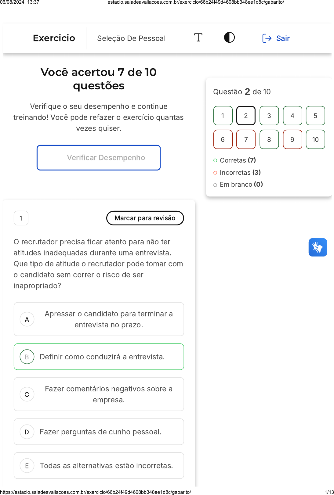 Você acertou 7 de 10 questões Verifique o seu desempenho e continue treinando! Você pode refazer o exercício quantas vezes quiser. Verificar Desempenho A B C D E 1 Marcar para revisão O recrutador precisa ficar atento para não ter atitudes inadequadas durante uma entrevista. Que tipo de atitude o recrutador pode tomar com o candidato sem correr o risco de ser inapropriado? Apressar o candidato para terminar a entrevista no prazo. Definir como conduzirá a entrevista. Fazer comentários negativos sobre a empresa. Fazer perguntas de cunho pessoal. Todas as alternativas estão incorretas. Questão 2 de 10 Corretas �7� Incorretas �3� Em branco �0� 1 2 3 4 5 6 7 8 9 10 Exercicio Seleção De Pessoal Sair 06/08/2024, 13:37 estacio.saladeavaliacoes.com.br/exercicio/66b24f49d4608bb348ee1d8c/gabarito/ https://estacio.saladeavaliacoes.com.br/exercicio/66b24f49d4608bb348ee1d8c/gabarito/ 1/13 A B C Resposta correta Parabéns, você selecionou a alternativa correta. Confira o gabarito comentado! Gabarito Comentado A alternativa correta é a que afirma que o recrutador pode definir como conduzirá a entrevista. Isso é apropriado porque permite que o recrutador estabeleça as expectativas e o fluxo da entrevista, garantindo que o candidato saiba o que esperar. As outras alternativas sugerem comportamentos que podem ser considerados inadequados ou desrespeitosos, como apressar o candidato, fazer comentários negativos sobre a empresa ou fazer perguntas de cunho pessoal. 2 Marcar para revisão Para o candidato, saber o que não fazer é tão importante quanto saber o que fazer durante uma entrevista. Qual postura é reprovada de forma instantânea durante uma avaliação pessoal? Falar sobre benefícios. Falar sobre amenidades. Falar sobre experiências. 06/08/2024, 13:37 estacio.saladeavaliacoes.com.br/exercicio/66b24f49d4608bb348ee1d8c/gabarito/ https://estacio.saladeavaliacoes.com.br/exercicio/66b24f49d4608bb348ee1d8c/gabarito/ 2/13 D E A B C Falar sobre conhecimentos. Todas as alternativas estão incorretas. Resposta correta Parabéns, você selecionou a alternativa correta. Confira o gabarito comentado! Gabarito Comentado A resposta correta é: Falar sobre benefícios. Falar sobre benefícios é uma postura reprovada de forma instantânea durante uma avaliação pessoal, pois o candidato deve focar em suas competências e habilidades, e não em benefícios que a empresa pode oferecer. 3 Marcar para revisão Os jogos corporativos e as dinâmicas de grupo são atividades vivenciais e permitem que o recrutador identifique as competências em ação. Qual competência não costuma ser identificada em uma dinâmica de grupo? Avaliar proficiência. Tomada de decisões. Exercitar planejamento. 06/08/2024, 13:37 estacio.saladeavaliacoes.com.br/exercicio/66b24f49d4608bb348ee1d8c/gabarito/ https://estacio.saladeavaliacoes.com.br/exercicio/66b24f49d4608bb348ee1d8c/gabarito/ 3/13 D E Pensar por hipóteses. Todas as alternativas estao incorretas. Resposta correta Parabéns, você selecionou a alternativa correta. Confira o gabarito comentado! Gabarito Comentado A resposta correta é: Avaliar proficiência. Avaliar proficiência é uma competência que não é identificada em uma dinâmica de grupo, pois essa competência é avaliada em uma entrevista individual, onde o recrutador pode observar o candidato em ação. As outras competências são identificadas em uma dinâmica de grupo, pois são competências que podem ser desenvolvidas e aprimoradas por meio da interação com outras pessoas. Portanto, a resposta correta é: Avaliar proficiência. ----- 4 Marcar para revisão Testes são recursos muito utilizados nos processos de seleção. Qual é o principal objetivo de um teste em uma seleção? 06/08/2024, 13:37 estacio.saladeavaliacoes.com.br/exercicio/66b24f49d4608bb348ee1d8c/gabarito/ https://estacio.saladeavaliacoes.com.br/exercicio/66b24f49d4608bb348ee1d8c/gabarito/ 4/13 A B C D E Identificar o grau de domínio que o candidato demonstra para a competência a ser avaliada. Demonstrar clareza, confiança, conhecimento e simpatia ao se comunicar com o entrevistador. Falar sobre sua experiência e dos conhecimentos que adquiriu. Evidenciar para o entrevistador os conhecimentos obtidos através de cursos e trabalhos voluntários. Todas as alternativas estão incorretas. Resposta correta Parabéns, você selecionou a alternativa correta. Confira o gabarito comentado! Gabarito Comentado O principal objetivo de um teste em um processo de seleção é identificar o grau de domínio que o candidato demonstra para a competência a ser avaliada. Isso significa que o teste é usado para avaliar a capacidade do candidato de executar as tarefas e responsabilidades do cargo para o qual ele está se candidatando. Portanto, a alternativa correta é: "Identificar o grau de domínio que o candidato demonstra para a competência a ser avaliada". 06/08/2024, 13:37 estacio.saladeavaliacoes.com.br/exercicio/66b24f49d4608bb348ee1d8c/gabarito/ https://estacio.saladeavaliacoes.com.br/exercicio/66b24f49d4608bb348ee1d8c/gabarito/ 5/13 A B C D E 5 Marcar para revisão As ferramentas que podem ser utilizadas no processo seletivo tem com o objetivo de avaliar os candidatos e selecionar os perfis mais indicados para determinado cargo/função. São ferramentas utilizadas durante o processo seletivo de seleção de pessoal, exceto: Simulações / cases. Entrevista comportamental. Dinâmicas de grupo. Debate eleitoral. Testes psicológicos. Resposta correta Parabéns, você selecionou a alternativa correta. Confira o gabarito comentado! Gabarito Comentado Diversas ferramentas podem ser utilizadas para avaliar um candidato durante uma seleção, entre elas: Entrevistas técnicas e comportamentais Testes técnicos e psicológicos Apresentação de cases Simulações e dinâmicas de grupos O debate eleitoral não é uma ferramenta utilizada para avaliar um candidato durante 06/08/2024, 13:37 estacio.saladeavaliacoes.com.b