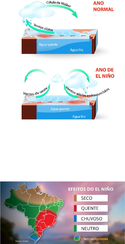 O que é e quais os impactos do El Niño? Entenda agora! O El Niño é caracterizado pelo aquecimento anormal e persistente da superfície do Oceano Pacífico na região da Linha do Equador, podendo se estender desde a costa da América do Sul até o meio do Pacífico Equatorial. Durante o fenômeno, que, normalmente, começa a se formar no segundo semestre do ano, as águas ficam, pelo menos, 0,5°C acima da média por um longo período de tempo de, no mínimo, seis meses. Vale lembrar que ele não tem um período de duração definido, podendo persistir até dois anos ou mais. Durante a formação do El Niño, o comportamento dos ventos alísios tem papel fundamental. Os alísios são ventos constantes vindos dos Hemisférios Sul e Norte, que se encontram na região da Linha do Equador e seguem do leste para o oeste do planeta Terra. Normalmente, o movimento dos ventos interfere no Oceano Pacífico e empurra as águas da superfície para o oeste, permitindo que as mais profundas e frias subam. No entanto, quando os ventos alísios estão enfraquecidos ou invertem a direção, essa troca de águas não ocorre e as mais quentes permanecem por mais tempo paradas na superfície, podendo chegar até 3°C ou mais acima da média, formando, assim, o El Niño. Impactos do El Niño no Brasil No Brasil, o fenômeno aumenta o risco de seca na faixa norte das regiões Norte e Nordeste e de grandes volumes de chuva no Sul do País. Isso ocorre porque a água da superfície do Pacífico, que está muito mais quente do que o normal, evapora com mais facilidade. Ou seja, o ar quente sobe para a atmosfera mais alta, levando umidade e formando uma grande quantidade de nuvens carregadas. Logo, no meio do Oceano Pacífico, chove muito e com frequência durante o El Niño. Durante as chuvas, esse mesmo ar quente, agora mais seco, continua circulando e, dessa vez, desce no norte da América do Sul, inibindo a formação de nuvens e, consequentemente, a ocorrência de chuvas em parte do Norte e Nordeste do Brasil. Afinal, o ar que provoca a formação de nuvens é aquele que sobe da superfície terrestre para a atmosfera e não o contrário. Já na Região Sul, o El Niño aumenta a probabilidade de chuvas acima da média porque a circulação dos ventos em grande escala, causada pelo El Niño, também interfere em outro padrão de circulação de ventos na direção norte-sul e essa interferência age como uma barreira, impedindo que as frentes frias, que chegam pelo Hemisfério Sul, avancem pelo País. Logo, as frentes ficam concentradas por mais tempo na Região Sul do Brasil. image1.jpeg image2.jpeg