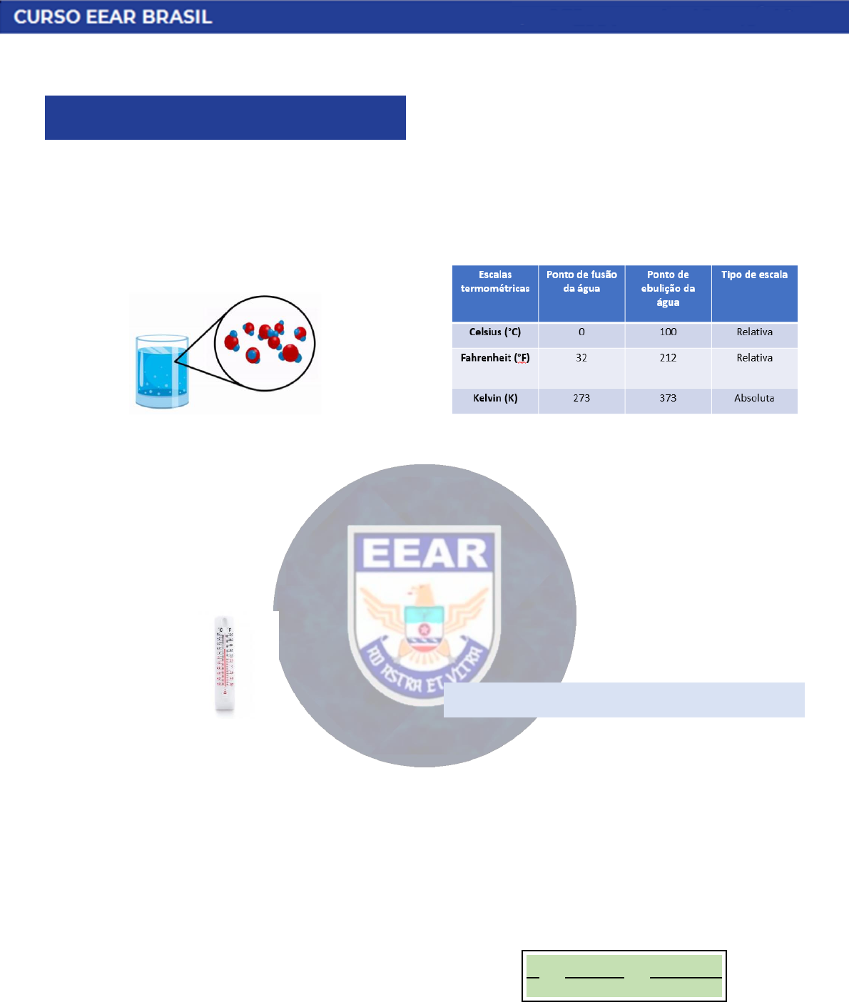 TERMOMETRIA Temperatura É uma grandeza escalar que mede o grau de agitação dos átomos e moléculas. Quanto maior a agitação dos átomos e moléculas maior será a temperatura. À energia térmica em trânsito, damos o nome de calor. O aparelho utilizado para mediar a temperatura é chamado termômetro. Escalas termométricas As principais escalas termométricas utilizadas atualmente são: Celsius (°C) - A Escala Celsius é a mais comum entre todas, foi criada em 1742 pelo astrônomo sueco Anders Celsius. Fahrenheit (°F) - Daniel Gabriel Fahrenheit, o inventor do termômetro de mercúrio, foi o inventor dessa escala por volta dos anos de 1742. Kelvin (k) - Willian Tomson, que viveu entre os anos de 1824 a 1907, durante a realização de experimentos verificou que se o volume de um gás for mantido constante, a sua pressão seria reduzida a uma razão de 1/273 do valor inicial para uma variação de -1°C na temperatura. Observem a tabela abaixo: Pessoal, é fato conhecido que a água se solidifica a 0°C e entra em ebulição a 100°C. É importante conhecer os pontos de fusão e ebulição em outras escalas, como podemos ver na tabela a temperatura de fusão é de 32°F ou 273K. Já a temperatura de ebulição é de 212°F ou 373K CONVERSÃO ENTRE ESCALAS Pessoal, é de extrema importância que vocês saibam transformar temperaturas em escalas diferentes, por exemplo, imagine que a temperatura hoje é de 40°C, quanto seria a temperatura em Fahrenheit ? Aí que entra a nossa fórmula de conversão, observe: 𝐶 5 = 𝐹 − 32 9 = 𝐾 − 273 5 Exemplo: Converta 25°C a) Para °F b) Para K Solução: a) Utilizando a fórmula: 25 5 = 𝐹 − 32 9 5 = 𝐹 − 32 9 45 = 𝐹 − 32 𝑭 = 𝟕𝟕°𝑭 b) Utilizando a fórmula: 25 5 = 𝐾 − 273 5 25 = 𝐾 − 273 𝑲 = 𝟐𝟗𝟖𝑲 VARIAÇÃO DE TEMPERATURAS Pessoal, em alguns problemas, é comum que o examinador peça para você relacionar variação de temperatura em duas escalas termométricas. Nesse caso, nossa fórmula de conversão fica um pouco diferente. ∆𝐶 5 = ∆𝐹 9 = ∆𝐾 5 Algumas observações: • Os denominadores de ambas as fórmulas são iguais. (tanto para a fórmula de conversão de temperaturas quanto para a fórmula de conversão de variação de temperaturas) • Se levarmos em conta apenas as variações em °C e em K, veremos que ∆𝐶 5 = ∆𝐾 5 → ∆𝑪 = ∆𝑲, ou seja, a variação de temperatura na escala Celsius e na escala Kelvin, são iguais. CONVERSÃO ENTRE DUAS ESCALAS QUAISQUER Nós vimos até agora as 3 principais escalas termométricas que existem, mas nada impede que um cientista venha a criar uma nova escala termométrica ou que o examinador da sua prova crie uma para dificultar sua vida na hora do concurso. Então, precisamos aprender a converter os diferentes tipos de escalas termométricas, a forma de fazer isso é através de regra de 3 simples e vou te ensinar a fazer isso em um exemplo: Exemplo: Um cientista resolve criar uma escala representada por °R. Nessa escala, a temperatura de fusão da água é de 20°R e a temperatura de ebulição é de 80°R. Uma temperatura de 50°R é equivalente em °C a: Solução: Pessoal, observem a figura abaixo A primeira figura representa um termômetro graduado em °C, a segunda representa um termômetro graduado em °R. Queremos saber o valor de 50°R em °C. Observe a marcação do 50°R feita de azul, na mesma altura no outro termômetro temos uma temperatura equivalente que queremos calcular (chamada de C). Para terminar de resolver o problema basta usar uma regra de 3 entre os “tamanhos” destacados de laranja e de vermelho, ou seja 𝐶 − 0 100 − 0 = 50 − 20 80 − 20 𝐶 100 = 30 50 Portanto, a temperatura será de C = 60°C Zero absoluto O zero absoluto é a mais baixa temperatura que pode ser alcançada em qualquer escala e equivale a 0K. Pode-se dizer que é o limite inferior de temperatura que existe no universo. Ou seja, é impossível atingir uma temperatura menor que essa. (Não existem temperaturas negativas nessa escala) Nesse estado, a vibração das moléculas que compõem o corpo é paralisada. EXERCÍCIOS 1. Converta 104°F para a) °C b) K 2) Converta 125° C em °F a)125 b)257 c)299 d)212 3. EEAR. Um piloto durante o voo comunica ao operador da torre de controle: “I have a crew member and his temperature is 104 degrees Fahrenheit (104 ºF)”. Imediatamente este operador informa a equipe de apoio que um dos tripulantes do avião apresenta uma temperatura de ______ ºC. A. 38,5 B. 39,5 C. 40,0 D. 41,0 4. EEAR. Antes de embarcar, rumo aos Estados Unidos da América, Pedro ligou para um amigo que lhe informou que a temperatura na cidade onde desembarcaria estava 59 ºF abaixo dos 35 ºC do aeroporto de São Paulo. Logo, na cidade onde Pedro deverá desembarcar, a temperatura, no momento do telefonema, é de ___ ºF. A. 15 B. 24 C. 36 D. 95 05. EEAR. Uma variação qualquer na escala Celsius tem na escala Kelvin valor numérico A. 1/273 vezes maior. B. 273 vezes menor. C. 273 vezes maior. D. igual. 06. A energia da radiação cósmica de fundo possui um equivalente em temperatura de 2,7 kelvins. Indique, entre as alternativas seguintes, qual é o valor dessa temperatura na escala Celsius: A. 275,3 ºC B. –275,3 ºC C. 270,3 ºC D. –270,3 ºC 07. O Brasil é reconhecidamente um país de contrastes. Entre eles podemos apontar a variação de temperatura das capitais brasileiras. Palmas, por exemplo, atingiu em 1 de julho de 1998 a temperatura de 13ºC e em 19 de setembro de 2013 a temperatura de 42ºC (com sensação térmica de 50ºC). Na escala kelvin, a variação da temperatura na capital do Tocantins, entre os dois registros realizados corresponde a: A. 13 K. B. 29 K. C. 42 K. D. 50 K. 08. A temperatura interna de um forno elétrico foi registrada em dois instantes consecutivos por termômetros distintos – o primeiro graduado na escala Celsius e o segundo na escala Kelvin. Os 