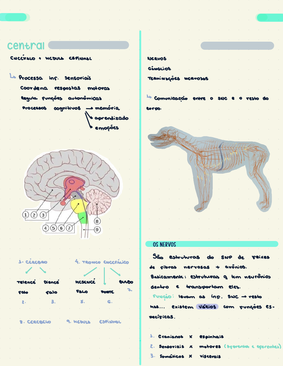 sistema nervoso sistema nervoso Central Periférico os nervos Encefalo + MEDUL ESPINAD NERVOS GÂNGLioS ↳ Processa inf. sensoriais TERMINAÇÕES NERVOSSS Coordena respostas motoras Regula funções autonómicas ↳ Comunicação entre o SNC e o resto do & processos cognitivos > memória Corpo. d aprendizado nemoções São estruturas do SNP de feixes I-CÉREBRO 4. Tronco encefálico de fibras nervosas + axónios. C 2 & A Basicamente : estruturas q tem neurônios Telencé Dience MESENCE - BULBO dentro e transportam eles. Fale Falo FALO PONTE 7. Funcio : levam as inf . SNC - resto 2 3. 5. 6. Mas... existem Vários com funções es- Decíficas . 8. CEREBELO 9. MEDUD ESPINIAL 1. Cranianos X espinhais 2. Sensoriais X motores (Aferentes e eferentes) 3. somáticos X viscerais cranianos Espinhais Sensoriais motores Somaticos viscerais os ganglios células do sistema nervoso Classificação do central Classificação do periférico Sistema nervoso somatico Sistema nervoso autonomo MeningesMeninges e líquor definição dura-máter aracnóide pia-máter funções espaços meníngeos definição funções produção circulação drenagem punção caso clínico Medula espinhal Medula espinhal Cone medular Intumescência cervical Intumescência lombar corte transversal Substância cinzenta Substância branca Tegumento Comum Camadas da pele e tipos de pêlos