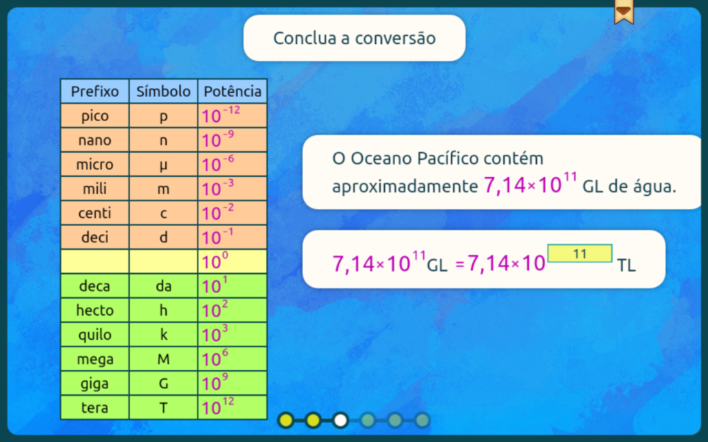 Conclua a conversão Prefixo Símbolo Potência pico P nano n 10-9 micro 10-6 Oceano Pacífico contém mili m 10-3 aproximadamente GL de água. centi 10-2 deci d 10° GL = 11 TL deca da hecto h 102 quilo k mega M 106 giga G 109 tera T