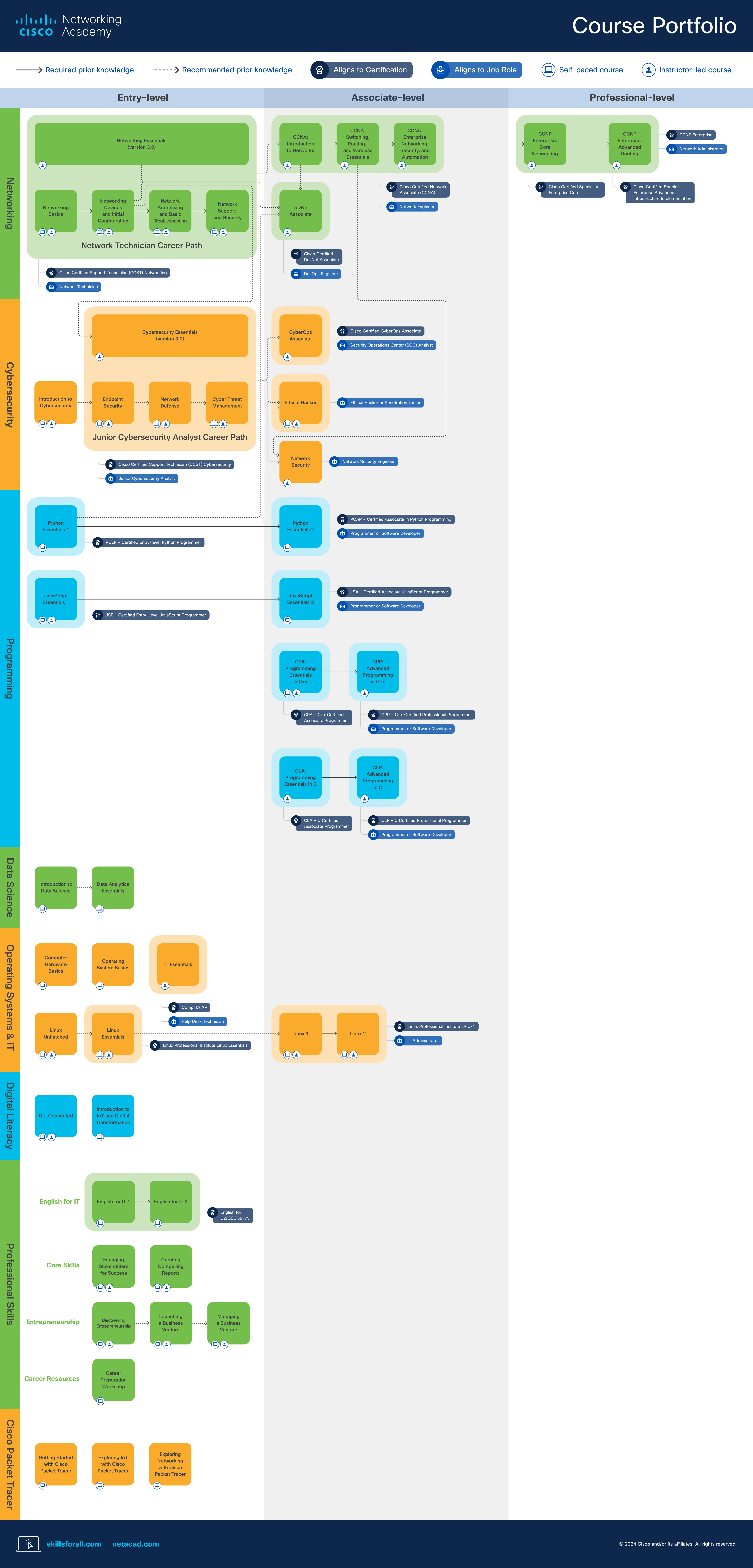 P rog ram m ing Course Portfolio Associate-levelEntry-level Networking Essentials (version 3.0) Networking Basics Networking Devices and Initial Configuration Network Addressing and Basic Troubleshooting Network Support and Security Network Technician Career Path Introduction to Cybersecurity Cybersecurity Essentials (version 3.0) Endpoint Security Network Defense Cyber Threat Management Junior Cybersecurity Analyst Career Path CCNA: Introduction to Networks CCNA: Switching, Routing, and Wireless Essentials CCNA: Enterprise Networking, Security, and Automation English for IT 1 English for IT 2 Linux 1 Linux 2 CCNP Enterprise: Core Networking CCNP Enterprise: Advanced Routing CyberOps Associate Python Essentials 1 Python Essentials 2 JavaScript Essentials 1 JavaScript Essentials 2 CPA: Programming Essentials in C++ CPP: Advanced Programming in C++ CLA: Programming Essentials in C CLP: Advanced Programming in C Ethical Hacker DevNet Associate IT Essentials Linux Essentials Computer Hardware Basics Get Connected Operating System Basics Introduction to IoT and Digital Transformation Linux Unhatched Getting Started with Cisco Packet Tracer Engaging Stakeholders for Success Discovering Entrepreneurship Career Preparation Workshop Exploring IoT with Cisco Packet Tracer Exploring Networking with Cisco Packet Tracer Creating Compelling Reports Launching a Business Venture Managing a Business Venture Introduction to Data Science Data Analytics Essentials N etw orking C yb ersecurity D ig ital Literacy O p erating S ystem s & IT C isco P acket Tracer CPA – C++ Certified Associate Programmer Cisco Certified Specialist - Enterprise Core Cisco Certified Specialist - Enterprise Advanced Infrastructure Implementation Cisco Certified Support Technician (CCST) Networking Network Technician CPP – C++ Certified Professional Programmer Programmer or Software Developer Cisco Certified Support Technician (CCST) Cybersecurity Junior Cybersecurity Analyst CLA – C Certified Associate Programmer Cisco Certified DevNet Associate DevOps Engineer CLP – C Certified Professional Programmer Programmer or Software Developer Ethical Hacker or Penetration Tester Network Security Engineer PCAP – Certified Associate in Python Programming JSA – Certified Associate JavaScript Programmer Programmer or Software Developer PCEP – Certified Entry-level Python Programmer Programmer or Software Developer Cisco Certified CyberOps Associate CCNP Enterprise Security Operations Center (SOC) Analyst Linux Professional Institute LPIC-1 Linux Professional Institute Linux Essentials Network Administrator IT Administrator English for IT B2/GSE 59-75 JSE – Certified Entry-Level JavaScript Programmer Cisco Certified Network Associate (CCNA) Network Engineer Network Security D ata S cience Core Skills P rofessional S kills Entrepreneurship English for IT Career Resources CompTIA A+ Help Desk Technician Required prior knowledge Recommended prior knowledge Aligns to Certification Aligns to Job Role Self-paced course Instructor-led course skillsforall.com netacad.com © 2024 Cisco and/or its affiliates. All rights reserved. Professional-level