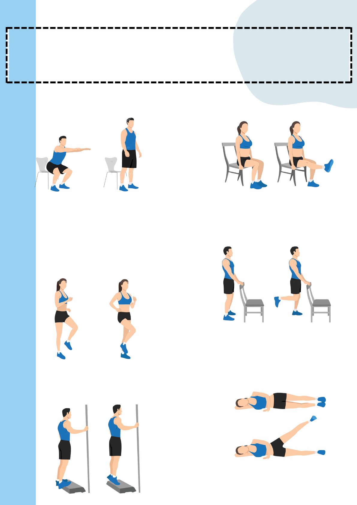 CARTILHA DE EXERCÍCIOS E ORIENTAÇÕES DOMICILIARES 1 2 3 4 5 Agachamento na cadeira (senta e levanta) = em uma cadeira, faça o movimento de sentar e levantar sem apoiar as mãos na cadeira. Marcha estacionária = marche sem sair do lugar (parecido com um trote), eleve os joelhos alternadamente até a altura da cintura ou até onde for possível, mantendo sempre a postura reta. Se necessário, apoie-se em uma cadeira para realizar o exercício com mais segurança. Panturrilha = Apoiada em uma cadeira, com os pés levemente separados, erga o calcanhar do chão com os dois pés e depois retorne ao chão. Elevação das pernas = sentada em uma cadeira, eleve cada perna alternadamente. Realizar 2x na semana Interromper os exercícios em caso de: falta de ar, dor no peito, desconforto respiratório e sensação de desmaio e fraqueza, náuseas e palpitações; Utilizar medicação de resgaste (ex: Aerolin) antes e ao término dos exercícios Realizar 3 séries de 10 repetições, com descanso de 2 minutos entre as séries Flexão de joelho = Apoiada em uma cadeira ou parede com as mãos, flexione o joelho (dobre para trás) alternadamente. 6 Abdução de membros inferiores = Apoiada em uma cadeira/parede com as mãos ou deitada de lado, eleve a perna ao lado do corpo, sempre mantendo a coluna reta. CARTILHA DE EXERCÍCIOS E ORIENTAÇÕES DOMICILIARES 7 8 9 Flexão de cotovelo: Em pé, com duas garrafas pet. Flexione os cotovelos trazendo a garrafa até a altura dos ombros e retorne à posição inicial. Realize com os dois braços ao mesmo tempo. Elevação frontal: Em pé, pegue duas garrafas pets e seguro na horizontal, com os braços afastados. Eleve a garrafa até a linha do ombro e retorne à posição inicial. Elevação lateral: em pé, com duas garrafas pet, eleve os braços lateralmente até a linha do ombro e retorne à posição inicial. Nos próximos exercícios utilize garrafas pet de 600ml com areia/terra dentro. Realizar 3 séries de 10 repetições, com descanso de 2 minutos entre as séries Sempre que possível realize caminhadas ao ar livre de 10 a 15 minutos; Avalie seu nível de esforço durante os exercícios (ideal que se mantenha no nível 4)