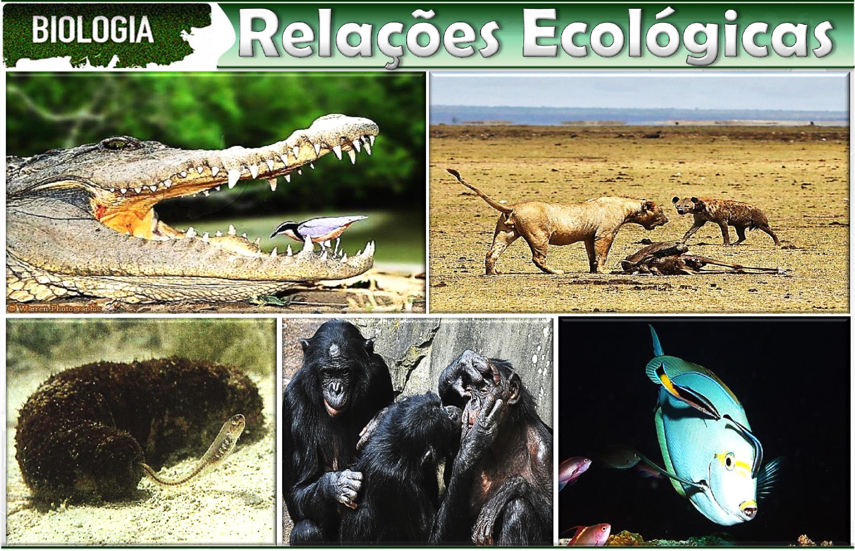 A interação entre organismos que constituem uma comunidade são denominadas relações ecológicas, e costumam ser classificadas em: Relações intraespecíficas; Relações interespecíficas; Relações harmônicas; Relações desarmônicas; Introdução As relações ecológicas ocorrem para a obtenção de recursos necessários à sobrevivência dos organismos. Prejuízo Benefício Neutro + - 0 Exemplos: Relação 1: (+ / +) Relação 2: (+ / -) Relação 3: ( + / 0) Relação 4: (- / -) Relações Harmônicas Intra-Específica Interespecífica - Colônias - Sociedades - Mutualismo - Protocooperação - Comensalismo ( + / + ; + / 0) (Mesma espécie) (Espécies diferentes) Relações Desarmônicas Intra-Específica Interespecífica - Competição intra-específica - Canibalismo - Competição interespecífica - Predatismo - Parasitismo - Amensalismo - Esclavagismo ( + / - ; - / 0 ; - / -) (Mesma espécie) (Espécies diferentes) - São associações entre indivíduos da mesma espécie, unidos fisicamente entre si, podendo ou não ocorrer divisão de trabalho. - Ex: Corais, bactérias (estreptococos), caravela. Relações Harmônicas Intraespecíficas Colônia Colônia Heteromorfa Relações Harmônicas Intraespecíficas Colônia Colônia Isomorfa Relações Harmônicas Intraespecíficas Colônia - São associações entre indivíduos da mesma espécie, organizados de modo cooperativo e não ligados anatomicamente. - Ex: sociedade dos insetos: abelhas, formigas, vespas. Relações Harmônicas Intraespecíficas Sociedade Relações Harmônicas Intraespecíficas Sociedade Relações Harmônicas Intraespecíficas Sociedade Sociedade dos Chimpanzés Sociedade dos Leões Relações Harmônicas Intraespecíficas Sociedade - É a associação entre indivíduos de espécies diferentes, necessária à sobrevivência dos participantes e que beneficia ambos. o Líquens: associação entre algas ou cianobactérias e fungos. o Bacteriorriza: formada por bactérias do gênero Rhizobium com raízes de leguminosas. o Herbívoros e Protozoários. Relações Harmônicas Interespecíficas Mutualismo Relações Harmônicas Interespecíficas Mutualismo Relações Harmônicas Interespecíficas Mutualismo - É a associação entre espécies diferentes em que ambos se beneficiam, mas a existência não é obrigatória. Ex: o Paguro e anêmonas do mar o Cervo e pássaro anu o Pássaro palito e jacaré Relações Harmônicas Interespecíficas Protocooperação Relações Harmônicas Interespecíficas Protocooperação Relações Harmônicas Interespecíficas Protocooperação Relações Harmônicas Interespecíficas Protocooperação - É a associação entre espécies diferentes, na qual uma espécie é beneficiada sem causar prejuízo ou benefício a outra. Comensalismo típico: Uma espécie se alimenta de restos alimentares de outra, sem prejudicá-la. Ex: Abutres. Inquilinismo: Uma espécie vive sobre ou no interior de uma espécie hospedeira, sem prejudicá-la. Nos vegetais essa associação recebe o nome de epifitismo. Ex: Bromélias. Forésia: Uma espécie usa a outra como meio de transporte. Ex: Tubarão e rêmoras. Relações Harmônicas Interespecíficas Comensalismo Relações Harmônicas Interespecíficas Comensalismo Comensalismo típico Inquilinismo Forésia Competição Intraespecífica: Ocorre entre indivíduos da mesma espécie, e é motivada por disputas por território, alimento e companheiro sexual. Obs.: A competição é um fator que regula o tamanho da população Relações Desarmônicas Intraespecíficas Canibalismo: Relação na qual um organismo se alimenta de outro da mesma espécie. Ex: Louva-Deus; Aranha viúva negra. Louva-a-Deus (Macho x Fêmea) Gafanhoto x Gafanhoto Relações Desarmônicas Intraespecíficas Competição Interespecífica: Ocorre entre indivíduos de espécies diferentes. Geralmente ocorre quando duas espécies apresentam sobreposição de nichos ecológicos. A disputa pelo mesmo recurso ambiental é um importante fator no controle do tamanho das populações. Quando uma competição é muito severa uma das espécies pode ser eliminada ou obrigada a emigrar. A introdução de espécies exóticas causa graves impactos ambientais. Relações Desarmônicas Interespecíficas Competição Interespecífica Paramércios cultivados isolados apresentam elevada densidade populacional Cultivados juntos a espécie de P. caudatum tem sua população reduzida devido à intensa competição com P. aurelia. Predatismo: Ocorre quando organismo predadores matam indivíduos da população de presas para deles se alimentarem. Ex: Leões e Zebras. Obs.: A relação presa-predador é um fator regulador da densidade populacional de ambos. Presa Predador Nº de indivíduos Tempo Relações Desarmônicas Interespecíficas Parasitismo: Relação na qual o parasita, obtêm nutrientes e moradia no corpo espécie hospedeira prejudicando-a. - Endoparasitismo: O parasita vive no interior do corpo do hospedeiro. Ex: Vermes. - Ectoparasitismo: O parasita vive na superfície do hospedeiro. Ex: Piolho e homem. - Holoparasita: Planta parasita obtém Seiva Bruta e Elaborada as custas da planta hospedeira. Ex: Cipó-chumbo. - Hemiparasita: Planta parasita obtém Somente Seiva Bruta as custas da planta hospedeira. Ex: Erva de passarinho. Relações Desarmônicas Interespecíficas Carrapato x Ser humano Lombriga x Ser humano Ectoparasita Endoparasita Relações Desarmônicas Interespecíficas Parasitismo em Animais Erva de Passarinho x Árvore Cipó Chumbo x Árvore Hemiparasita Holoparasita Parasitismo em plantas Relações Desarmônicas Interespecíficas Amensalismo ou antibiose: uma espécie libera substâncias que impedem o crescimento e a reprodução de outra. Ex: Algas pirrófitas e animais marinhos (Maré vermelha). Relações Desarmônicas Interespecíficas Esclavagismo (Sinfilia): Uma espécie se beneficia do trabalho de outra. Ex: Chupim, Formigas e pulgões Relações Desarmônicas Interesp