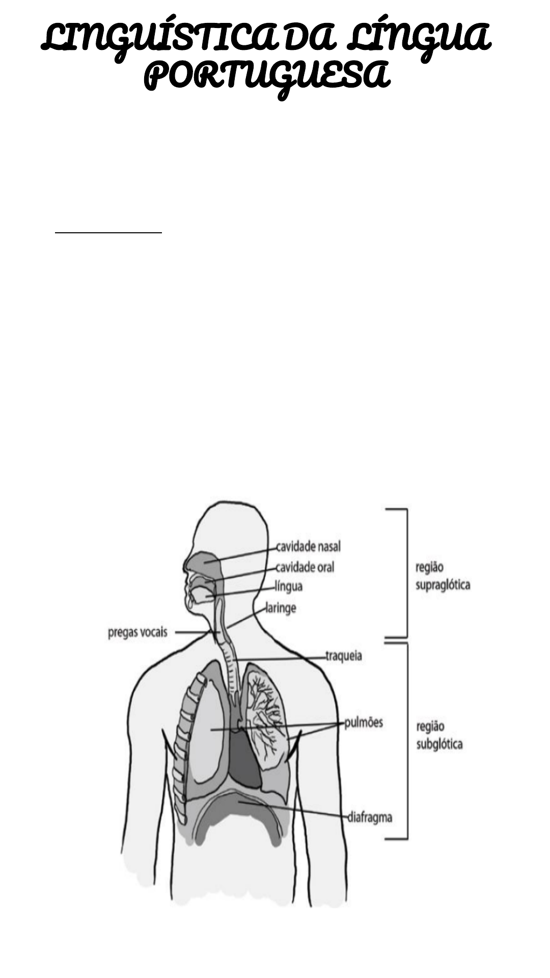 LINGUÍSTICA DA LÍNGUA PORTUGUESA FONÉTICA ➢ Fonética Articulatória: estudo do aparelho fonador (estuda os sons da fala), que, anteriormente a fala, é responsável pela nossa respiração (captação de ar). Ou seja, para que haja fala é preciso, antes de tudo, que haja respiração. No português brasileiro, a fala é gerada a partir da corrente de ar egressiva, ou seja, o ar se dirige para fora dos pulmões. Para tanto, antes de falar precisamos inspirar e encher os pulmões de ar, aumentando o seu volume. Depois, por meio da expiração, essa energia é enviada para que as pregas vocais transformem a corrente de ar em um som audível. (o ar antes de chegar nas pregas vocais ele não produz som). APARELHO FONADOR 1) O sistema respiratório: o diafragma, os dois pulmões, os músculos pulmonares, os tubos brônquios e a traqueia. Esse sistema está localizado na parte inferior à glote, que é denominada cavidade infraglotal, ou subglótica. (sem produção de som). 2) O sistema fonatório: (início da produção do som) laringe que, por sua vez, é formada pelas cordas vocais (som produzido a partir da vibração dessas cordas). Essa região, que pode ser ou não obstruída pelas cordas, é chamada de glote. 3) O sistema articulatório: cavidade faríngea (faringe), cavidade oral, composta pela boca - língua, palato duro e mole (ou véu palatino), úvula, alvéolos, dentes e lábios, e a cavidade nasal, onde estão as narinas. - Região subglótica → somente passagem de ar. - Região supraglótica → Onde começa ter passagem do som nas cordas vocais, localizada em cima da glote e já pode-se perceber o som. CONSOANTES ➢ Sons produzidos com algum tipo de obstrução (total ou parcial) na passagem de ar no trato oral - Som consonantal tem que algo influenciando neste ar. ➢ A classificação articulatória das consoantes é feita segundo o seu ponto de articulação, modo de articulação e vozeamento. ➢ Quanto ao ponto de articulação, (parte fisiológica dentro do trato oral e influencia na produção do som) os segmentos consonantais são classificados: Bilabial (DUAS PARTES DOS LÁBIOS), Labiodental (ENVOLVE DENTES E OS LÁBIOS), Dental (ENVOLVE OS DENTES), Alveolar, Alveopalatal (ENVOLVE OS ALVÉOLOS E O PALATO), Retroflexa, Palatal, Velar, Uvular e Glotal. ➢ Quanto ao modo de articulação: Oclusiva/Plosiva, Nasal, Fricativa, Africada, Tepe, Vibrante, Retroflexa, Lateral. (ligados com a percepção do som). ➢ Quanto ao vozeamento: sonoras/vozeadas; surdas/ não vozeadas. (vibração das cordas vocais). ➢ Propriedades articulatórias secundárias: labialização; palatização; velarização; dentalização. - Palato duro → Som palatal. - Cavidades nasais → Som nasal. - Som dental → Momento onde encosta a língua nos dentes. - Bilabiais → Articulação dos lábios. - Cuidado com a região Nasal, pois temos sons mais nasais e sons que não são. Os sons não considerados nasais são os sons orais. - Tem todos os sons consonantais divididos de acordo com seus pontos de articulação. - Cuidados que alguns conjuntos estão representados pelos seus fonemas.