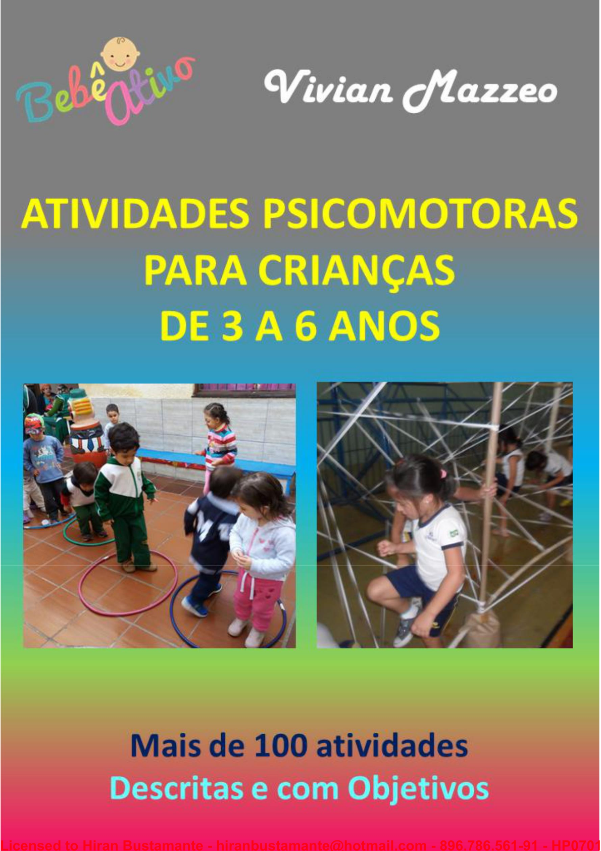 Licensed to Hiran Bustamante - hiranbustamante@hotmail.com - 896.786.561-91 - HP07015918000383 Atividades Psicomotoras para Crianças de 3 a 6 anos Vivian Mazzeo ATIVIDADES PSICOMOTORAS PARA CRIANÇAS DE 3 A 6 ANOS 1ª Edição São Paulo Vivian Brazil Mazzeo 2018 Licensed to Hiran Bustamante - hiranbustamante@hotmail.com - 896.786.561-91 - HP07015918000383 Atividades Psicomotoras para Crianças de 3 a 6 anos Sobre a autora Educadora, Profissional de Educação Física, Psicomotricista, Palestrante, Idealizadora do Bebê Ativo e Escritora. Apaixonada por bebês e crianças eu fundei o Bebê Ativo em 2017. Depois de anos trabalhando em Berçário e Educação Infantil eu reuni as melhores atividades e selecionei para esse livro digital as que são importantes para as crianças, elas gostam e se envolvem e principalmente funcionam no dia a dia. Minha missão é ajudar Profissionais do Berçário e da Creche, para desenvolverem todo o potencial dos bebês e crianças bem pequenas, trabalhando a função Educar e Cuidar, por meio da Estimulação com conhecimento e técnicas que geram resultados. Assim transformo trabalho em carreira, para criar uma vida com propósito e grandes realizações. Publico conteúdos, informações e me relaciono com educadores e escolas diariamente nas redes sociais. Você está convidada! Facebook Instagram YouTube Seja bem vinda! Com carinho... Vivian Mazzeo Profissional de Educadora Física e Psicomotricista CREF 076622-G/SP Licensed to Hiran Bustamante - hiranbustamante@hotmail.com - 896.786.561-91 - HP07015918000383 http://www.bebeativo.com.br/ https://www.facebook.com/bebeativo/ https://www.instagram.com/vivianmazzeo_bebeativo/ https://www.youtube.com/bebeativo Atividades Psicomotoras para Crianças de 3 a 6 anos Crianças de 3 anos Objetivos Gerais: Audição e Linguagem falada: Descrever ações e construir frases. Motricidade: – Fase Motora Fundamental – Estágio Inicial. Dissociar movimentos de braços e pernas, acelerar e desacelerar, subir escadas. Maturação sócio emocional: Esperar sua vez e brincar com as outras crianças. Viso-motricidade: Segurar o lápis e agarrar uma bola. ✓ As idades cronológicas são apenas indicações aproximadas. ✓ Cada criança corresponde a um perfil de evolução. ✓ Tenha cada criança como parâmetro de si mesma. Licensed to Hiran Bustamante - hiranbustamante@hotmail.com - 896.786.561-91 - HP07015918000383 Atividades Psicomotoras para Crianças de 3 a 6 anos Índice Nome da atividade Objetivo Específico 01. A CAIXA MÁGICA Valorizar a criança. 02. ANIMAIS Desenvolver capacidades físicas. 03. CHUVA DE BOLAS Conhecer cores, agrupar objetos por cor, cooperação. 04. CAÇA TESOURO Cooperação. 05. TREM Desenvolver a coordenação da caminhada em diferentes direções. 06. PASSO ALTO PASSO BAIXO Desenvolver coordenação motora e noção espacial. 07. ESTÁTUA Equilíbrio. Esquema corporal. 08. CORDA BAMBA Equilíbrio e enfrentar desafios. 09. BAMBOLÊ Orientação espacial, lateralidade, equilíbrio, esquema corporal. 10. AMARELINHA Equilibro e coordenação motora. 11. DIGITAIS Controlar os movimentos de tensão e relaxamento dos dedos e mãos, tônus muscular. 12. O QUE SERÁ? Desenvolver a motricidade fina e o desejo de exploração. 13. GRITARIA Extravasar, voltar a calma, respeitar regras. 14. O QUE É O QUE É? Habilidades motoras, estruturação espaço temporal. 15. PEGA RABO Capacidades físicas, estruturação espaço temporal, lateralidade. 16. CORDA Capacidades físicas, habilidades motoras, lateralidade, tonicidade. 17. BOLA E BASTÃO Coordenação motora, lateralidade, estruturação espaço temporal. 18. CONES Habilidades motoras, lateralidade. 19. DUPLAS Equilíbrio, organização espacial, organização temporal. 20. TROMBA DO ELEFANTE Coordenação motora e equilíbrio. 21. CORRE COTIA Capacidade física e lateralidade. 22. O ROBÔ Esquema e Imagem corporal. 23. O DETETIVE Organização espacial habilidade motora e lateralidade. 24. GATO MIA Desenvolver atenção, audição e observação. 25. URSO Estruturação espaço temporal e habilidade motora. Licensed to Hiran Bustamante - hiranbustamante@hotmail.com - 896.786.561-91 - HP07015918000383 Atividades Psicomotoras para Crianças de 3 a 6 anos 01. A CAIXA MÁGICA Descrição do exercício: Decore uma caixa por fora e cole um espelho em seu interior. Diga a criança: Esta é uma caixa mágica, se você abrir, verá dentro a pessoa mais especial do mundo. Você sabe quem é essa pessoa? Permita a criança decidir se quer abrir a caixa, mantenha o clima de surpresa. Depois de abrir a caixa pergunte a ela: Quem você viu? Está surpreso? O que você mais gosta em você? Entre outras. Objetivo: Valorizar a criança. 02. ANIMAIS Descrição do exercício: Fazer o som dos animais ou colocar no rádio para a criança ouvir, descobrir qual é e imitá-lo. Objetivo: Desenvolver capacidades físicas. 03. CHUVA DE BOLAS Descrição do exercício: Com uma caixa cheia de bolas de piscina de bolinhas coloridas, fazer uma chuva sobre as crianças, após pedir para que eles recolham e coloquem na bacia correspondente a sua cor. Repetir a atividade. Objetivo: Conhecer cores, agrupar objetos por cor, cooperação. 04. CAÇA TESOURO Descrição do exercício: Esconder um brinquedo e solicitar a turminha que o encontre. Repetir o processo. Objetivo: Cooperação. Se for colocado obstáculos desenvolve também habilidades motoras e capacidades físicas. Com instruções/pistas pode-se desenvolver lateralidade e noção espacial. Licensed to Hiran Bustamante - hiranbustamante@hotmail.com - 896.786.561-91 - HP07015918000383 Atividades Psicomotoras para Crianças de 3 a 6 anos 05. TREM Descrição do exercício: Formar um trenzinho com as crianças. Um atrás do outro com a mão no ombro ou na cintura do amigo. Pode cantar música de trem. Pode variar o ritmo da música de acordo com a velocidade na qual se movimentam e guiar o trem em forma de círculo, onda