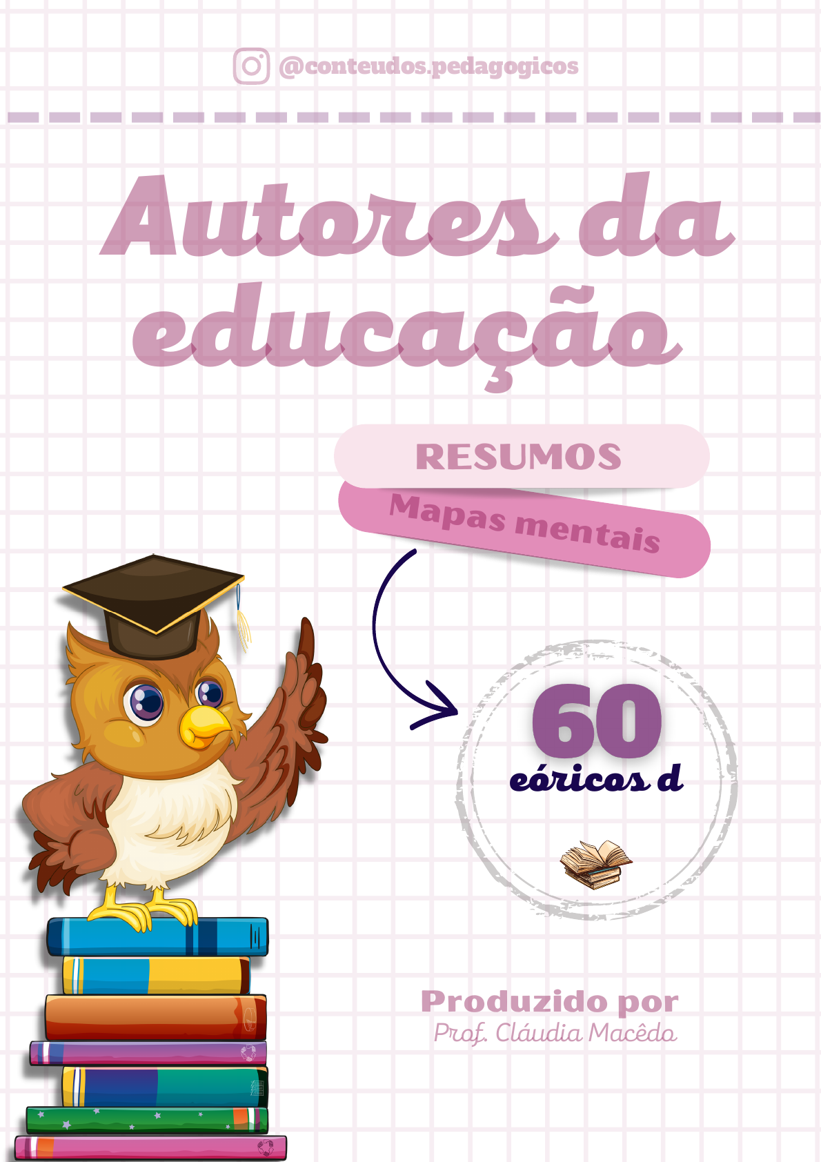 Mapas mentais Mapas mentais @conteudos.pedagogicos Autores daAutores da educaçãoeducação RESUMOSRESUMOS Teóricos da educação Produzido porProduzido por Prof. Cláudia MacêdoProf. Cláudia Macêdo Me chamo Cláudia Macedo, sou professora, pedagoga, pós-graduada em alfabetização e letramento, estudante do curso de letras - língua portuguesa e concurseira. Criei o perfil no Instagram @conteudos.pedagogicos em 2019 com o objetivo de compartilhar conhecimentos com aqueles que assim como eu almejam um cargo efetivo nas áreas educacionais. Esse material foi elaborado com muito carinho e cuidado, em cima de muito estudo, pensando tudo que os concurseiros precisam saber sobre os autores da educação e no que pode vir a cair nas provas dos concursos que você irá fazer. Trata-se de um e-book de resumos e mapas mentais sobre as principais teorias dos autores mais famosos, nessa lista estão mais de 60 nomes importantes para a história e desenvolvimento da educação. Se você está lendo essa mensagem, significa que confiou no meu trabalho, fico muito grata por isso e espero que esse material faça a diferença na sua preparação @conteudos.pedagogicos Bons estudos!Bons estudos! Olá, concurseiro(a)!Olá, concurseiro(a)! O conteúdo desse e-book servirá como um norte a você na hora de estudar, para ter uma visão geral dos conteúdos ou para utilizar como revisão e relembrar o que você já estudou. Não compartilhe esse material com terceiros, ele é protegido por direitos autorais, nenhuma parte deste livro digital pode ser reproduzida ou transmitida, seja quais forem os meios empregados. Apenas você que adquiriu tem licença para uso pessoal ou impressão. Em caso de dúvidas, dicas ou feedback's, entre em contato comigo pelos seguintes canais: RecomendaçõesRecomendações @conteudos.pedagogicos conteudos.pedagogicos13@gmail.com Sócrates Platão Aristóteles Comenius John Locke Rousseau Pestalozzi Friedrich Hegel Auguste Comte Karl Marx Émile Durkhein John Dewey Max Weber Decroly Makarenko Antonio Gramsci Anísio Teixeira Paulo Freire Darcy Ribeiro Talcot Parsons Theodor W. Adorno Louis Althusser Pierre Bourdieu Philippe Perrenoud Miguel A. Zabalza Miguel González Arroyo 1. 2. 3. 4. 5. 6. 7. 8. 9. 10. 11. 12. 13. 14. 15. 16. 17. 18. 19. 20. 21. 22. 23. 24. 25. 26. SumárioSumário 7 9 11 14 17 19 21 24 25 27 29 31 34 36 38 40 43 46 49 50 52 54 56 58 62 64 27. Célestin Freinet 28. Ivan Pavlov 29. J. B. Watson 30. Burrhus Skinner 31. Sigmund Freud 32. Jean Piaget 33. Lev Vygotsky 34. Henry Wallom 35. Carl Rogers 36. Robert Gagné 37. David Ausubel 38. Howard Gardner 39. Maria Montessori 40. Froebel 41. Donald Winnicot 42. Kishimoto 43. Celso Antunes 44. Peter Mittler 45. Maria Tereza Mantoan 46. Emília Ferreiro 47. Délia Lerner 48. Magda Soares 49. Vitor H. Paro 50. Moacir Gadotti 51. Tomaz Tadeu da Silva SumárioSumário 66 68 69 71 74 77 81 85 89 91 93 95 96 99 101 102 105 107 109 112 115 117 121 123 125 52. Antoni Zabala 53. Sacristán 54. Ilma P. Veiga 55. Jerome Bruner 56. Danilo Gandin 57. Celso Vasconcelos 58. José Carlos Libâneo 59. Demerval Saviani 60. Cipriano Luckesi 61. Jussara Hoffman Referências bibliográficas SumárioSumário @conteudos.pedagogicos 127 129 131 135 137 139 141 146 149 151 153 SócratesSócrates @conteudos.pedagogicos - Prof. Cláudia Macêdo Fundador da filosofia ocidental, Sócrates foi um filósofo ateniense do período clássico da Grécia Antiga. "Foi o homem que morreu em função do seu ideal de educar jovens e estabelecer uma moralização do ambiente grego ateniense . Naquela época o ideal humano era o homem belo e de valor, uma pessoa de estirpe, com nobreza, físico de atleta e excelente em tudo. Como educador se preocupava em despertar e estimular o impulso para a busca pessoal e a verdade , o pensamento próprio e escutar a voz interior. Sócrates é a figura central quando se trata da evolução do pensamento pedagógico. 7 Autoconhecimento Intelectualismo moral É o início do caminho para o verdadeiro saber. Defendia o uso do conhecimento como interesse comum - filosofia se transforma na pedagogia. A concepção de educação de Sócrates envolvia a questão de como educar ou preparar as pessoas para viver na cidade. Por meio do conhecimento as pessoas chegariam a sabedoria e à prática do bem, a educação deveria formar o homem por inteiro, e para isso, é necessário uma reflexão sobre a vida e a qualidade de vida. Por considerar o contato direto com os interlocutores muito importante, Sócrates era defensor do diálogo como método de educação. "Pelo diálogo, ele as tira do seu sossego, da sua tranquilidade, da sua paz podre e fétida. Quanto a Sócrates contenta-se em dialogar, em dialogar daquela maneira, em alvoroçar, em inquietar e em esperar que, a seu tempo, esse diálogo produza os resultados esperados: uma revolução no homem que já é velho por causa de uma simples história e por causa de certo tipo de diálogo que esse homem inventa." (FONSECA, 1996, p.7) 8 Método dialético Levar o aluno para uma verdadeira aprendizagem, indo além de qualquer conteúdo, fazer o aluno pensar e refletir sobre os conceitos que ele afirma conhecer. Objetivo Fundamentos Partir da experiência do aluno para que este busque respostas, despertar o pensamento crítico dando ênfase ao processo de raciocínio do estudantes e finalmente o aluno chegará a verdade e aprenderá a pensar corretamente. Papel do professor Ajudar o discípulo a caminhar nesse sentido, despertando cooperação para que ele consiga por si próprio iluminar sua inteligência e sua consciência. Papel do aluno Questionar valores instituídos, desalojando "certezas" por meio da problematização e busca de soluções em conjuto. @conteudos.pedagogicos - Prof. Cláudia Macêdo Platão acreditava que era preciso qualificar os indivíduos como meio para uma sociedade política e eticamente justa, composta por homem virtuosos capazes de dominar suas pa