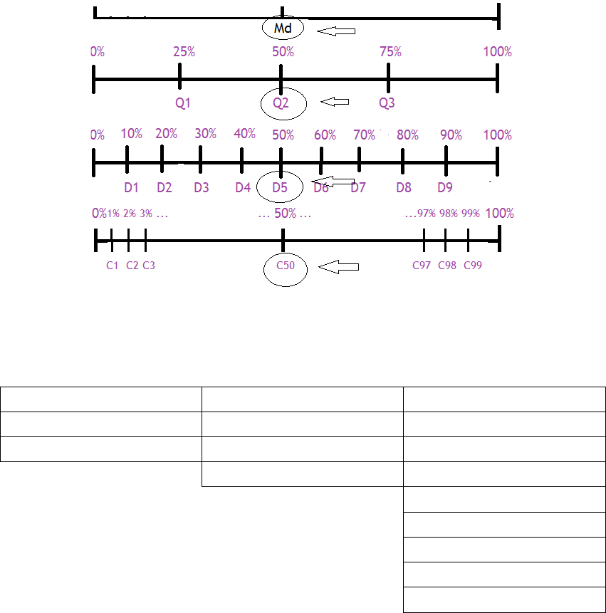 SEPARATRIZES Números reais que dividem a sequência ordenada de dados em partes que contêm a mesma quantidade de elementos da série. A mediana que a divide a sequência ordenada em dois grupos (50% cada) também é uma separatriz. Outras: Q – quartis (4 partes, 25% cada); K – quintis (5 partes, 20% cada); D – decis (10 partes, 10% cada); P – percentis (100 partes, 1% cada). Desta maneira, o primeiro percentil separa a sequência ordenada deixando à sua esquerda 1% de seus valores e 99% dos valores à direita. Q4 k5 D10 P100 = elementos que deixam à sua esquerda 100% dos valores. Se observarmos que os quartis, quintis e decis são múltiplos dos percentis, todas as outras medidas podem ser identificadas como percentis. Desta forma: Q1 = P25 K1 = P20 D1 = P10 Q2 = P50 K2 = P40 D2 = P20 Q3 = P75 K3 = P60 D3 = P30 K4 = P80 D4 = P40 D5 = P50 D6 = P60 D7 = P70 D8 = P80 D9 = P90 Fórmula para localizar a posição do percentil i no rol: i % de n = i x n 100 Ex.: Q1 de 2,5,8,5,5,10,1,12,12,11,13,15 Rol: 1,2,5,5,5,8,10,11,12,12,13,15 Q1 = P25 25% de 12 = 25 x 12 = 3º termo 100 Q1 = P25 = 5 Conclusão: 25% dos valores são menores a 5 e 75% dos valores desta sequência são maiores ou iguais a 5. K2 = P40 40% de 12 = 40x12 = 480 = 4,8º termo 100 100 K2 = P40 = 5 Conclusão: 40% dos valores são menores a 5 e 60% dos valores desta sequência são maiores ou iguais a 5. Q3 = P75 Rol: 1,2,5,5,5,8,10,11,12,12,13,15 i % de n = i x n 100 75% de 12 = 75x12 = 900 = 9º termo 100 100 Q3 = P75 = 12 Conclusão: 75% dos valores são menores a 12 e 25% dos valores desta sequência são maiores ou iguais a 12. ONDE APLICAMOS ISSO? BoxPlot: Saiba tudo sobre o Diagrama de caixa e como interpretar esse gráfico