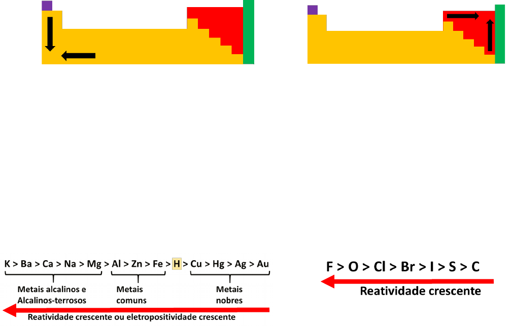 AULA 2 - REATIVIDADE DOS ELEMENTOS QUÍMICOS Para a ocorrência de uma transformação química, é necessário o contato entre os reagentes, com colisões efetivas, energia de ativação e afinidade química. Podemos descrever essa última condição como a reatividade química dos elementos, que é a capacidade dos átomos de uma substância química de reagir a outros átomos ou moléculas para formar novas substâncias. A reatividade depende das características da camada de valência dos átomos, que é a camada mais externa que contém elétrons. Átomos com uma camada de valência completa geralmente são menos reativos, pois não precisam compartilhar ou transferir elétrons para formar ligações químicas. Átomos com camadas de valência incompletas são mais reativos, pois podem interagir facilmente com outros átomos ou moléculas para completar suas camadas de valência. A reatividade também pode ser influenciada pela eletronegatividade, tamanho e carga dos átomos. Elementos químicos diferentes têm diferentes níveis de reatividade, e essa propriedade pode ser explorada em muitas aplicações, incluindo na síntese de compostos químicos, na produção de energia e em processos industriais. As reatividades comparativas de elementos químicos foram determinadas experimentalmente e são conhecidas como filas de reatividade. Por meio de uma série de experimentos envolvendo vários metais e o hidrogênio, foi estabelecida a fila de reatividade a seguir. Filas de reatividade dos metais: Filas de reatividade dos ametais: Os metais possuem a tendência de ceder elétrons, ou seja, oxidar-se. Uma maior tendência em doar elétrons é algo diretamente proporcional a sua reatividade. Além disso, a reatividade dos metais está ligada à sua energia de ionização. REAÇÃO DOS METAIS COM ÁCIDOS Os metais mais reativos que o hidrogênio na série de reatividade reagem rapidamente com o ácido, podendo liberar o gás hidrogênio. Zn(s) + 2 HCl(aq) → ZnCl₂(aq) + H₂(g) Obs.: No caso dos metais nobres, como o ouro, a reação com ácidos comuns não ocorre. Os metais nobres têm potenciais de redução muito altos, indicando que eles têm pouca tendência a perder elétrons. Essa resistência à corrosão é uma das razões pelas quais os metais nobres são valorizados e usados em aplicações como joias e contatos elétricos, em que a durabilidade, boa condutividade elétrica e a resistência à oxidação são desejáveis. REAÇÃO DOS METAIS COM SOLUÇÕES AQUOSAS DE SAIS Nesse tipo de reação, um metal mais reativo é capaz de deslocar um metal menos reativo de seu composto em solução. Por exemplo, se colocarmos zinco metálico em uma solução de sulfato de cobre (CuSO4), o zinco, sendo mais reativo, desloca o cobre da solução, formando sulfato de zinco (ZnSO4) e liberando cobre metálico: Zn(s) + CuSO4(aq) → ZnSO4(aq) + Cu(s) Como o zinco é mais reativo que o cobre, ele perde elétrons, passando de zinco metálico para cátion. Nesse caso, o zinco sofreu uma oxidação. Já o cobre ganhou elétrons, passando de cátion para cobre metálico. O cobre sofreu uma redução. Exemplo: (Espcex (Aman) 2012) Abaixo são fornecidos os resultados das reações entre metais e sais. FeSO4(aq) + Ag(s) → não ocorre a reação 2 AgNO3(aq) + Fe(s) → Fe(NO3)2(aq) + 2 Ag(s) 3 Fe(SO4)(aq) + 2 Al(s) → Al2(SO4)3(aq) + 3 Fe(s) Al2(SO4)3(aq) + Fe(s) → não ocorre a reação De acordo com as reações acima, a ordem decrescente de reatividade dos metais envolvidos em questão é: a) Al, Fe e Ag. b) Ag, Fe e Al. c) Fe, Al e Ag. d) Ag, Al e Fe. e) Al, Ag e Fe. Exemplo 2: Considere que precisamos armazenar uma solução de CuSO4 (sulfato de cobre II). Considerando a fila de reatividade dos metais, qual material a seguir não seria indicado para armazená-lo? a) Au(s) b) Al(s) c) Ag(s) CONDUTIVIDADE ELÉTRICA A condutividade é a medida da capacidade de uma substância de conduzir eletricidade. Essa propriedade depende da presença de íons carregados que podem se mover livremente, permitindo a passagem de corrente elétrica. Entender os diferentes tipos de substâncias e seus comportamentos em relação à condutividade é essencial para compreender os fenômenos elétricos. - Substâncias iônicas: geralmente são sólidas em estado puro, não conduzem eletricidade nessa forma porque os íons estão fixos em posições dentro de uma rede cristalina. No entanto, quando aquecidas até se fundirem ou dissolvidas em água, essas substâncias passam a conduzir eletricidade devido à liberação dos íons em movimento. - Substâncias moleculares: Substâncias moleculares, por outro lado, geralmente não conduzem eletricidade em estado puro porque não possuem íons livres. Entretanto, quando dissolvidas em água, algumas dessas substâncias podem sofrer ionização, um processo químico em que moléculas neutras são convertidas em íons, tornando a solução condutora de eletricidade. PROCESSOS DE CONDUTIVIDADE - Dissociação: Quando substâncias iônicas, como o NaCl, são dissolvidas em água, ocorre o processo de dissociação, onde os íons presentes na substância são separados e se movimentam livremente, tornando a solução condutora de eletricidade. NaCl(s) → Na+(aq) + Cl-(aq) - Ionização: Algumas substâncias moleculares, como o HCl, podem sofrer ionização quando dissolvidas em água, convertendo moléculas neutras em íons carregados. Essa solução resultante também será capaz de conduzir eletricidade. HCl(s) → H+(aq) + Cl-(aq) - Condutividade Metálica: Substâncias metálicas, em contraste, conduzem eletricidade em estado puro devido ao movimento livre de elétrons em sua estrutura. AULA 3 - PROCESSOS ELETROQUÍMICOS II DEFINIÇÃO DA REAÇÃO DE OXIDORREDUÇÃO Essas transformações químicas envolvem a transferência de elétrons entre duas espécies químicas ou entre um eletrodo e uma espécie química. Durante essas reações, ocorre a mudança do número