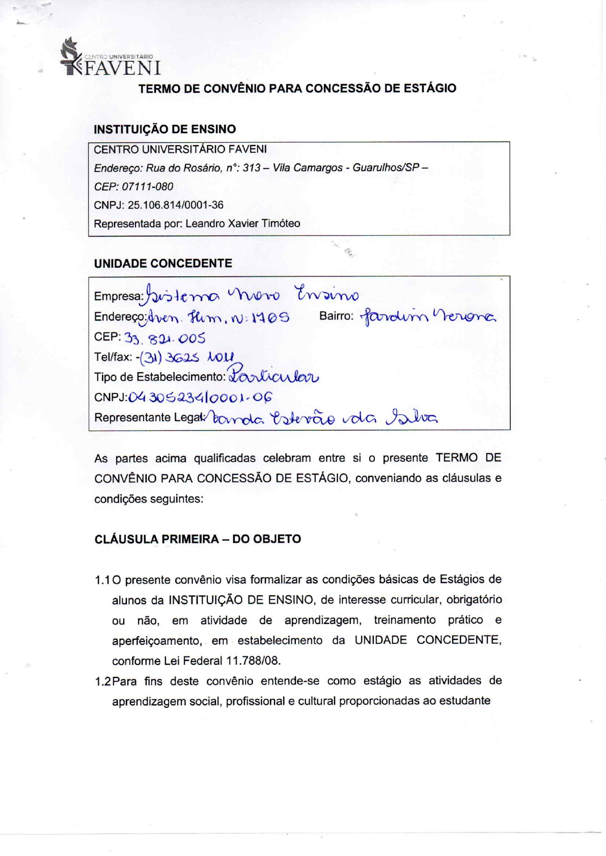 2 CARTA DE APRESENTAÇÃO Ribeirão das Neves, 11 de março de 2024. Ilmo. (a) Sr. (a) Diretor (a) Vanda Estevão da Silva Servimo-nos desta para apresentar o (a) Sr (a). Karina Bruna Botelho da Silva, aluno (a) do (a) Curso de Segunda Licenciatura em Educação Especial. Solicitamos a colaboração de V.Sa. no sentido de que seja autorizada a realização de estágio nesta Instituição, em cumprimento das exigências curriculares, facilitando-lhe a oportunidade de vivenciar a realidade educacional, condição imprescindível para futura atuação profissional. Sem mais para o momento, 4 FICHA DE CARACTERIZAÇÃO DA ESCOLA (01 FICHA PARA CADA INSTITUIÇÃO ESTAGIADA) 1. Da Identificação do Estabelecimento e da Mantenedora 1.1. Denominação: Sistema Novo Ensino 1.2. Endereço: Avenida Hum Nº: 1769 Bairro: Jardim Verona CEP: 33821005 Fone: (31) 3625-2011 1.3. Entidade Mantenedora: Instituto Educacional Maria Madalena LTDA 1.4. Unidade responsável pela supervisão da instituição escolar: Superintendência Regional de Ensino – Metropolitana C 2. Dos Graus e Cursos 2.1. A escola mantém: Educação Infantil (X) Ensino Fundamental I (X) Ensino Fundamental II (X) Ensino Médio ( ) E.J.A. ( ) 2.2. Número de classes e de alunos: GRAU CLASSES ALUNOS Educação Infantil 3 35 Ensino Fundamental I 4 63 Ensino Fundamental II 4 52 Ensino Médio _______ _______ TOTAL 11 150 3. Da Estrutura Física 3.1. Prédio: Próprio (X) Sim ( ) Não Adaptado (X) Sim ( ) Não 5 Tipo de construção (alvenaria, madeira, outro) Alvenaria Atende a necessidade da clientela? (X) Sim ( ) Não ( ) Razoavelmente Estado de conservação do prédio: (X) Bom ( ) Regular ( ) Péssimo Número de andares: 02 Número de salas de aula: 09 Sala ambiente: 01 Dependência para apoio-pedagógico: 01 Laboratório de Ciências: 00 Laboratório de Informática: 01 Salas para Orientação Educacional: 00 Salas para Coordenação Pedagógica: 01 Biblioteca: 01 Dependências Sanitárias: Masculino: 02 Feminino: 02 Filtros de água e bebedouros: 02 Áreas disponíveis: Pátio (X) Quadra descoberta (X) Quadra coberta ( ) Piscina ( ) Campo de Futebol ( ) Tanque de areia ( ) Playground (X) Outros ______________________________________________ 3.2. Equipamentos Mobiliário (avalie os aspectos qualitativos) O mobiliário está em bom estado de conservação. Outros equipamentos: Não apresenta. 6 Recursos audiovisuais: A escola dispõe de recursos audiovisuais como retroprojetores, som e Datashow. 4. Da organização Administrativa e Apoio Pedagógico 4.1. Diretor ( ) Efetivo ( ) Substituto ( ) Designado (X) Outro: Contratado Principais atividades: O diretor escolar é o líder da escola, e como tal tem a responsabilidade de administrar todas as atividades que a instituição realiza, guiando o trabalho e a função de todos que compõem a comunidade escolar. Suas principais atividades são: Organizar a rotina escolar; Garantir o cumprimento de leis e diretrizes de ensino; Realizar o levantamento dos materiais que devem ser comprados; Implementar a tecnologia para otimizar os processos administrativos; Administrar os recursos da escola; Garantia do uso correto dos recursos disponibilizados; Zelar pela manutenção do patrimônio da instituição; Identificar e suprir as necessidades da comunidade escolar; Definir estratégias para captação e retenção de alunos; Integrar todos os componentes da gestão escolar para atuarem em conjunto. 4.2. Assistente de Direção: (X ) Efetivo ( ) Designado ( ) Substituto Principais atividades: Substituir o diretor em sua ausência; Supervisionar a limpeza da escola; Monitorar o ponto dos professores; Buscar soluções para faltas e substituições; Coordenar o fluxo de alunos; Supervisionar a merenda escolar; Controlar o estoque de materiais. 4.3. Coordenador Pedagógico (X) Sim ( ) Não Principais atividades: Guiar e motivar os docentes, inclusive criando condições para que os educadores continuem em formação e realizem processos de atualização; Acompanhar o desempenho dos alunos; Selecionar os métodos e materiais a serem utilizados; Monitorar o desempenho dos professores; Fazer a ponte de comunicação entre todos os envolvidos no processo educacional; Estruturar o projeto político- pedagógico da escola. 4.4. Orientador Educacional 7 ( ) Sim (X) Não Principais atividades: ___________________________________________________________ 4.5. Outros (psicólogo, psicopedagogo, fonoaudiólogo etc.): Não há. Principais atividades: _________________________________________________ _____________________________________________________ 4.6. Bibliotecário (X) Sim ( ) Não Principais Atividades: Disponibilizar a informação, atuar como mediador no processo de leitura, aprendizagem, facilitador do acervo bibliográfico, organizador e colaborador nas atividades culturais; tem habilidade para auxiliar na prática do currículo escolar. 4.7. Corpo Docente: Professores de Educação Infantil: 03 Professores de Ensino Fundamental I: 05 Professores de Ensino Fundamental II: 09 Professores de Ensino Médio: 00 Auxiliares: 05 Total: 22 4.8. Pessoal de Apoio Administrativo e Serviços Auxiliares: Secretária Escolar (X) Sim ( ) Não Contador (X) Sim ( ) Não Tesoureiro ( ) Sim (X) Não Auxiliares Administrativos (X) Sim ( ) Não Inspetor de alunos ( ) Sim (X) Não Serventes/inspetores (X) Sim ( ) Não Zelador ( ) Sim (X) Não Porteiro (X) Sim ( ) Não Segurança ( ) Sim (X) Não 8 RELATÓRIO DE CARACTERIZAÇÃO DA ESCOLA (01 FICHA PARA CADA INSTITUIÇÃO ESTAGIADA) A escola Sistema Novo Ensino, atende alunos em sua maioria filhos de comerciantes e condôminos nos bairros ao redor da escola e alguns bairros mais distantes. Os profissionais são compromissados e realizam o trabalho com dedicação. O Projeto Politico Pedagógico da escola encontra-se atualizado (2022), foi e é desenvolvimento com membros da escola e da comunidade escolar (pais e alunos). A escola é um espaço relacional, onde alunos de dife