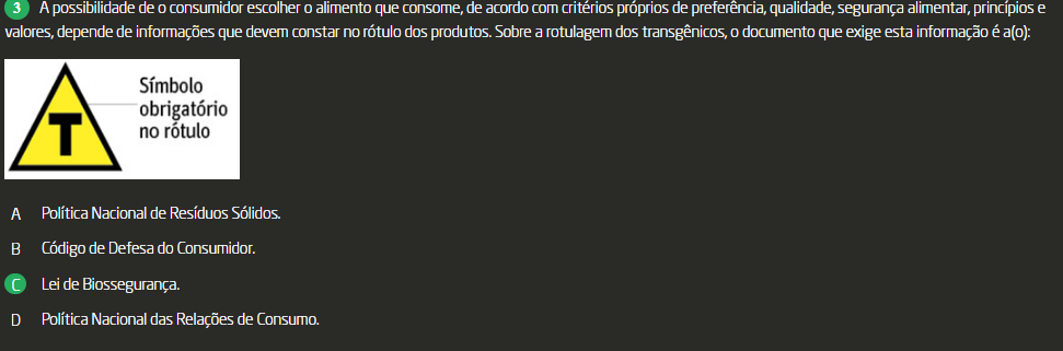 3 A possibilidade de consumidor escolher alimento que consome, de acordo com critérios próprios de preferência, qualidade segurança alimentar, princípios e valores, depende de informações que devem constar no rótulo dos produtos. Sobre a rotulagem dos transgênicos, documento que exige esta informação é a(o): Símbolo obrigatório T no rótulo A Política Nacional de Resíduos B Código de Defesa do Consumidor. Lei de Biossegurança. D Política Nacional das Relações de Consumo.