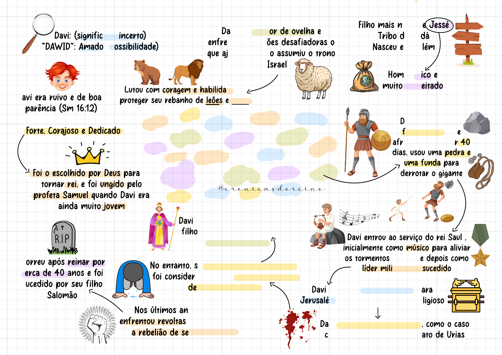 Davi Davi: (significado incerto) “DAWID”: Amado (possibilidade) Davi era pastor de ovelha e enfrentou situações desafiadoras o que ajudou quando assumiu o trono de Israel Lutou com coragem e habilidade ao proteger seu rebanho de leões e ursos Filho mais novo de Jessé Tribo de Judá Nasceu em Belém Homem rico e muito respeitado Davi era ruivo e de boa aparência (Sm 16:12) Forte, Corajoso e Dedicado Foi o escolhido por Deus para se tornar rei, e foi ungido pelo profeta Samuel quando Davi era ainda muito jovem Derrotou o gigante filisteu Golias que afrontou Israel por 40 dias, usou uma pedra e uma funda para derrotar o gigante Davi entrou ao serviço do rei Saul , inicialmente como músico para aliviar os tormentos de Saul e depois como líder militar bem sucedido Davi trouxe a arca da aliança para Jerusalém, centralizando o culto religioso Davi teve várias esposas e muitos filhos, entre eles Salomão que o sucedeu como rei Davi cometeu pecados graves, como o caso com Bate Seba e o assassinato de Urias No entanto, se arrependeu sinceramente e foi considerado como segundo o coração de Deus (Atos 13:22) Nos últimos anos da sua vida enfrentou revoltas internas, incluindo a rebelião de seu filho Absalão Morreu após reinar por cerca de 40 anos e foi sucedido por seu filho Salomão @cronicasdoreino L [ - ... V