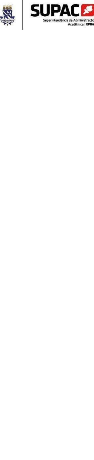 SUPAC – SUPERINTENDÊNCIA DE ADMINISTRAÇÃO ACADÊMICA Endereço: Rua Araújo Pinho, 265 - Canela CEP: 40110-150 - Salvador/Bahia Telefone: (71) 3283-7144 / e-mail: supac@ufba.br GUIA DO ESTUDANTE - SUPAC Consulte na lista abaixo os serviços prestados pela SUPAC. Clique na opção desejada. Adoção do Nome Social Aproveitamentos de Estudos de Graduação e Pós-Graduação Atestado de Matrícula Atestado de Percentual Cursado Atestado de Previsão de Conclusão de Curso Atestado de Provável Concluinte Atestado de Regularidade Acadêmica Atestado de Semestralidade Atestado de Situação Acadêmica Atualização Cadastral Certidão de Estudos – Aluno Especial ( Comprovante de Matrícula Consulta de Processos Declaração de Conclusão de Curso - Aguardando Colação de Grau Declaração de Conclusão de Curso - Após a Colação de Grau Declaração de Desistente de Curso Desistência Definitiva do Curso Dilatação do Tempo Máximo para Conclusão do Curso Diploma – Primeira Via Diploma – Segunda Via Ementas de Disciplinas Envelopamento de documentos da Graduação UFBA Envio de documentos acadêmicos para a WES Envio do histórico escolar da graduação para instituições estrangeiras através de e-mail institucional da UFBA Histórico Escolar de Graduação Histórico Escolar de Pós-Graduação SUPAC – SUPERINTENDÊNCIA DE ADMINISTRAÇÃO ACADÊMICA Endereço: Rua Araújo Pinho, 265 - Canela CEP: 40110-150 - Salvador/Bahia Telefone: (71) 3283-7144 / e-mail: supac@ufba.br Matrícula como Portador de Diploma de Caráter Especial: Reconhecimento de Firma Reembolso de Taxas Regime de Aprovação Revisão/Retificação de processo Solicitação de Regime de Exercício Domiciliar Trancamento por Motivo de Saúde Trancamento Total ou Parcial de Graduação Trancamento Total ou Parcial do Curso de Pós-Graduação Transferência Ex-Offício Transferência Interna de Caráter Especial SUPAC – SUPERINTENDÊNCIA DE ADMINISTRAÇÃO ACADÊMICA Endereço: Rua Araújo Pinho, 265 - Canela CEP: 40110-150 - Salvador/Bahia Telefone: (71) 3283-7144 / e-mail: supac@ufba.br - Todo e qualquer e-mail deve, obrigatoriamente, conter nome completo e número de matrícula do(a) interessado(a), se houver. Os arquivos PDF devem ser corretamente nomeados. Ex.: “Requerimento João dos Santos Silva”; “Histórico Maria Joana Souza” - Deve ser indicado no assunto do e-mail o tema daquela mensagem. Ex.: Aproveitamento de Estudos; Trancamento por Motivo de Saúde etc. - O número do protocolo é enviado automaticamente pelo SIPAC para o e-mail do(a) requerente quando o processo é cadastrado. ➢ Consulta de Processos: É possível consultar o andamento de processos administrativos em www.sipac.ufba.br > consultas > processos (não é necessário fazer login). Isto vale para aproveitamentos de estudos, solicitações ao CAE, desistências de curso etc. O processo terá sido finalizado quando for encaminhado ao Núcleo de Arquivo (NARQ/CARE). ➢ Reconhecimento de Firma (Confirmação da autenticidade da assinatura/firma, realizada por Cartórios de Notas): Consulte aqui o cartório para reconhecimento de firma ➢ Aproveitamentos de Estudos de Graduação e Pós-Graduação: deverão ser solicitados via e-mail (aproveitamento.nae@ufba.br). Aproveitamento de estudos é quando você usa o que já estudou em outro curso ou faculdade para não precisar fazer de novo as mesmas matérias na UFBA. Você deve solicitar através do email aproveitamento.nae@ufba.br Siga os 3 passos abaixo: 1.Baixe, preencha e assine o documento “Requerimento Escolar para Aproveitamento de Estudos” (disponível em https://supac.ufba.br/formularios-menu-aluno - ou clicando AQUI) - A assinatura deve ser manuscrita ou eletrônica – não pode ser o nome digitado; - Não esqueça de preencher o curso atual e turno no cabeçalho, além do nome completo do(a) discente; 2. Anexe o Histórico Escolar constando a aprovação nas disciplinas que serão objeto da solicitação; - O histórico de outra instituição deve ser oficial, assinado por funcionário ou servidor da instituição; 3. Anexe as Ementas e/ou conteúdo programático das disciplinas cursadas; - Em caso de ementas de disciplinas cursadas em outra instituição, TODAS as ementas devem estar assinadas por funcionário ou servidor da instituição. ❗ IMPORTANTE: TODOS os documentos devem ser enviados em PDF, separados da seguinte maneira: - 1 único arquivo PDF para o Requerimento Escolar; SUPAC – SUPERINTENDÊNCIA DE ADMINISTRAÇÃO ACADÊMICA Endereço: Rua Araújo Pinho, 265 - Canela CEP: 40110-150 - Salvador/Bahia Telefone: (71) 3283-7144 / e-mail: supac@ufba.br - 1 único arquivo PDF para o Histórico Escolar; - 1 único arquivo PDF para as ementas de disciplinas; - 1 único arquivo PDF para os certificados/declarações (quando for o caso). *Obs.: O NAE/SUPAC não realiza o cadastro de aproveitamento de carga horária complementar/atividades complementares. Estas devem ser solicitadas diretamente ao Colegiado do curso. ➢ Dilatação do Tempo Máximo para Conclusão do Curso: Deverá o(a) requerente enviar o Requerimento Escolar (disponível em https://supac.ufba.br/sites/supac.ufba.br/files/requerimento_escolar.doc) devidamente preenchido e assinado (assinatura manuscrita ou eletrônica – não pode ser o nome digitado). Este pedido deve ser enviado ao Colegiado de Curso, conforme Art. 75-A do Regulamento de Ensino de Graduação e Pós- Graduação da UFBa. ➢ Trancamento por Motivo de Saúde: Deverá o(a) requerente enviar o Requerimento Escolar (disponível em https://supac.ufba.br/sites/supac.ufba.br/files/requerimento_escolar.doc) devidamente preenchido e assinado (assinatura manuscrita ou eletrônica – não pode ser o nome digitado) e os documentos médicos pertinentes, todos em formato PDF, para trancamento.nae@ufba.br; Nos casos de estudantes da Pós-Graduação, enviar o Requerimento Escolar ao respectivo Programa de Pós- graduação. Tranc