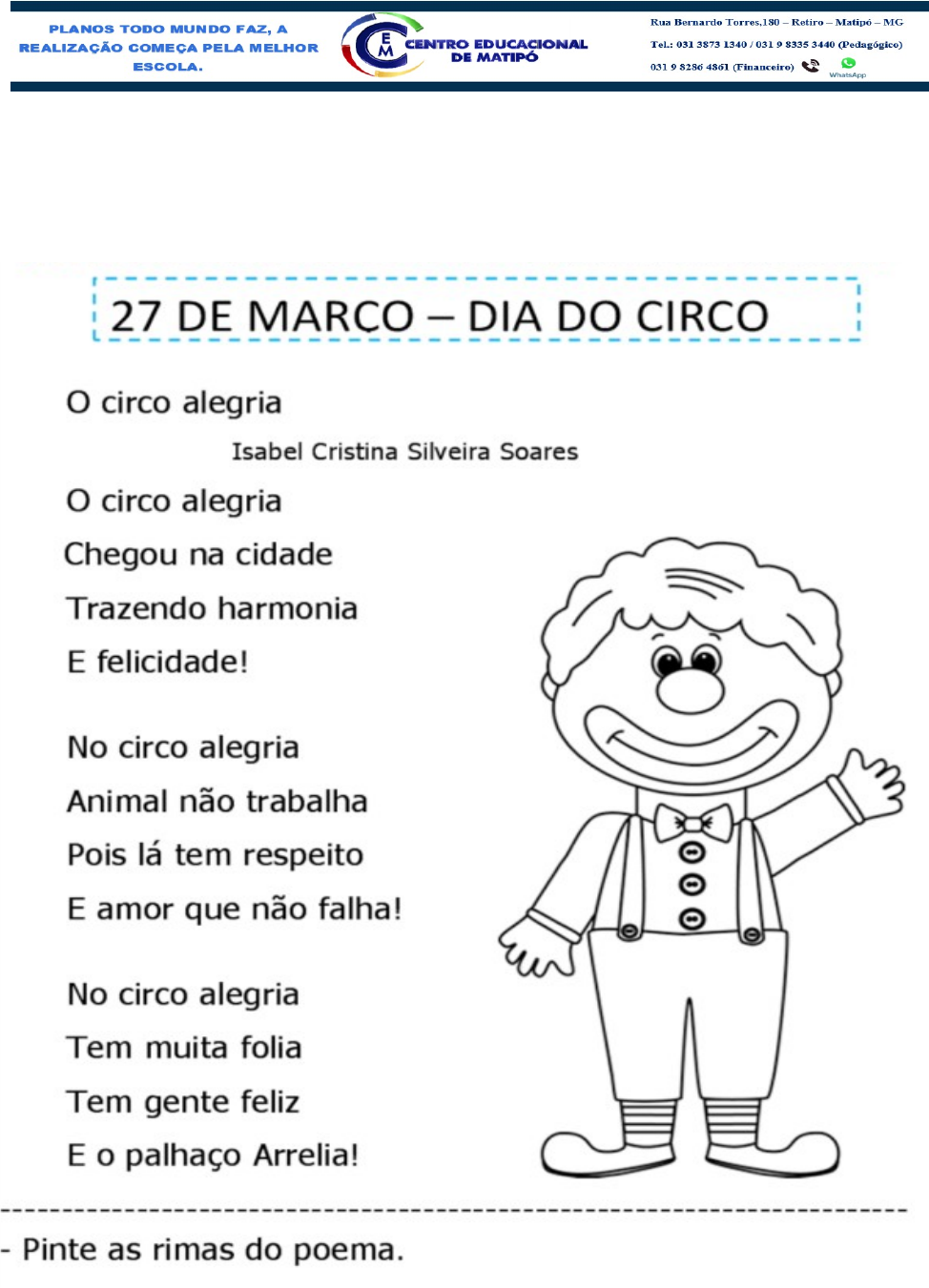 Aluno(a):______________________________________________________________________ Escola: ________________________________________________________________________ Professora: Josiana Patrícia de Souza Brandão Data: ___/___/2021. Série: 2º ano. Atividade de Língua Portuguesa Atividade de literatura Leia o texto: 4 – COPIE O TEXTO EM SEU CADERNO COM A LETRA BONITA. image1.png image2.png image3.png image4.png