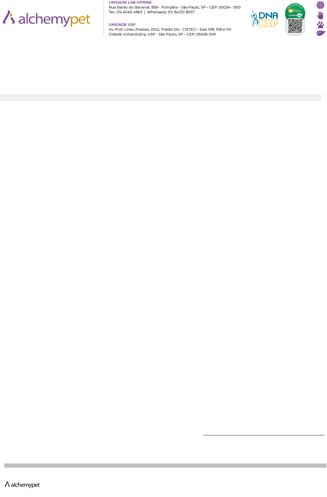 Nº Pedido: Paciente: Data Entrada: Espécie: Raça: Local: Gênero: Idade: ID: Responsável: Clínica: Dr(a): CRMV: Assinado eletronicamente por: Responsável Técnico MV Dra. Bianca Castro Freire - CRMV:40844/SP Diretor Técnico Prof. Dr. Adilson Kleber Ferreira - CRF:48034/SP A interpretação do resultado deste(s) exame(s) e a conclusão diagnóstica são atos médicos; dependem da análise conjunta dos dados clínicos e demais exames do(a) paciente. A Alchemypet participa continuamente desde 2018 do Programa de Proficiência em Ensaios Laboratoriais Veterinário, apoiado pela Sociedade Brasileira de Medicina Veterinária e fornecido pela Controllab. Laboratório registrado no CRMV/SP sob o nº: 42697-PJ Laboratório registrado no CRF/PJ sob o nº: 4868519 -PJ FLOCA152863 05/10/2022 Canino LaboratórioSem Raça Definida (SRD) 6 anosF 1567 A TocaMARIANA VENANCIO 1567 Mariana Venancio dos Santos 26831 Hemograma Completo Material: Tubo EDTA (roxo) sangue total Método: Determinação automatizada - Microscopia óptica SÉRIE VERMELHA Valores de Referência Hemácias...................................... 6,07 milhões/mm³ 5,10 a 8,50 milhões/mm³ Hemoglobina................................. 13,1 g/dL 11,0 a 19,0 g/dL Hematócrito................................... 43 % 36 a 56 % VCM.............................................. 70 fL 62 a 78 fL HCM.............................................. 22 pg 20 a 28 pg CHCM............................................ 31 g/dL 30 a 38 g/dL RDW.............................................. 13,2 % 11,5 a 15,9 % Eritroblasto.................................... 0 % em 100 Leucócitos 0 % Pesquisa de Hematozoários......... Ausente na amostra analisada Pesquisa de Microfilárias.............. Ausente na amostra analisada Avaliação morfológica da Série Vermelha: Morfologia celular normal avaliada por citometria de fluxo ou microscopia SÉRIE BRANCA Leucócitos............................... 14.590 /mm³ 6.000 a 17.000 /mm³ Blastos........................................... 0,00 % 0 /mm³ 0 % 0 /mm³ Promielócitos................................. 0,00 % 0 /mm³ 0 % 0 /mm³ Mielócitos....................................... 0,00 % 0 /mm³ 0 % 0 /mm³ Metamielócitos............................... 0,00 % 0 /mm³ 0 % 0 /mm³ Bastonetes..................................... 0,00 % 0 /mm³ 0 a 2 % 0 a 340 /mm³ Segmentados................................. 88,00 % 12.839 /mm³ 55 a 75 % 3.300 a 12.750 /mm³ Eosinófilos..................................... 2,00 % 292 /mm³ 1 a 5 % 60 a 850 /mm³ Basófilos........................................ 0,00 % 0 /mm³ 0 a 1 % 0 a 170 /mm³ Linfócitos........................................ 18,00 % 2.626 /mm³ 13 a 40 % 780 a 6.800 /mm³ Linfócitos Atípicos.......................... 0,00 % 0 /mm³ 0 % 0 /mm³ Monócitos...................................... 2,00 % 292 /mm³ 1 a 4 % 60 a 680 /mm³ Avaliação morfológica da Série Branca: Morfologia celular normal avaliada por citometria de fluxo ou microscopia Plaquetas................................. 416 mil/mm³ 180 a 490 mil/mm³ VPM............................................... 8,6 fL 7,3 a 11,2 fL Avaliação morfológica das Plaquetas: Ausência de alterações plaquetárias qualitativas Nota: Como critério para liberação dos laudos hematológicos o laboratório Alchemypet realiza contagem e análise morfológica em lâmina de todos os pacientes de acordo com The International Council for Standardization in Haematology (ICSH). Resultado liberado por Priscila Costa Valentim - / em 05/10/2022 às 15:17 Página 1 de 18 Nº Pedido: Paciente: Data Entrada: Espécie: Raça: Local: Gênero: Idade: ID: Responsável: Clínica: Dr(a): CRMV: Assinado eletronicamente por: Responsável Técnico MV Dra. Bianca Castro Freire - CRMV:40844/SP Diretor Técnico Prof. Dr. Adilson Kleber Ferreira - CRF:48034/SP A interpretação do resultado deste(s) exame(s) e a conclusão diagnóstica são atos médicos; dependem da análise conjunta dos dados clínicos e demais exames do(a) paciente. A Alchemypet participa continuamente desde 2018 do Programa de Proficiência em Ensaios Laboratoriais Veterinário, apoiado pela Sociedade Brasileira de Medicina Veterinária e fornecido pela Controllab. Laboratório registrado no CRMV/SP sob o nº: 42697-PJ Laboratório registrado no CRF/PJ sob o nº: 4868519 -PJ FLOCA152863 05/10/2022 Canino LaboratórioSem Raça Definida (SRD) 6 anosF 1567 A TocaMARIANA VENANCIO 1567 Mariana Venancio dos Santos 26831 Glicose Material: Tubo Amarelo (Gel) / Soro Método: Enzimático Colorimétrico Resultado ......................... Valor de Referência 88,25 mg/dL Canino Filhote: 77 a 150 mg/dL Adulto: 74 a 143 mg/dL Geriátrico: 70 a 143 mg/dL Felino Filhote: 77 a 153 mg/dL Adulto: 74 a 159 mg/dL Geriátrico: 71 a 159 mg/dL Nota: Amostras de sangue coletadas em tubo contendo fluoreto de sódio (inibidor glicolítico) e em anticoagulante EDTA, devem ser utilizadas para a determinação precisa da Glicose sérica. As amostras coletadas de forma adequada permanecem estáveis por 12 horas até 25°C em temperatura ambiente e por 24 horas entre 2° a 8°C sob refrigeração. Nos casos de mensuração em outras condições o exame estará sujeito à confirmação a critério médico. Referência: Fobker M. Stability of glucose in plasma with different anticoagulants. Clin Chem Lab Med. 2014 Jul;52(7):1057-60. doi: 10.1515/cclm-2013-1049. PMID: 24633752. Resultado liberado por Elaine Alexandre da Cruz Andrade - OUTROS/SP em 05/10/2022 às 15:59 Página 2 de 18 Nº Pedido: Paciente: Data Entrada: Espécie: Raça: Local: Gênero: Idade: ID: Responsável: Clínica: Dr(a): CRMV: Assinado eletronicamente por: Responsável Técnico MV Dra. Bianca Castro Freire - CRMV:40844/SP Diretor Técnico Prof. Dr. Adilson Kleber Ferreira - CRF:48034/SP A interpretação do resultado deste(s) exame(s) e a conclusão diagnóstica são atos médicos; dependem da análise conjun