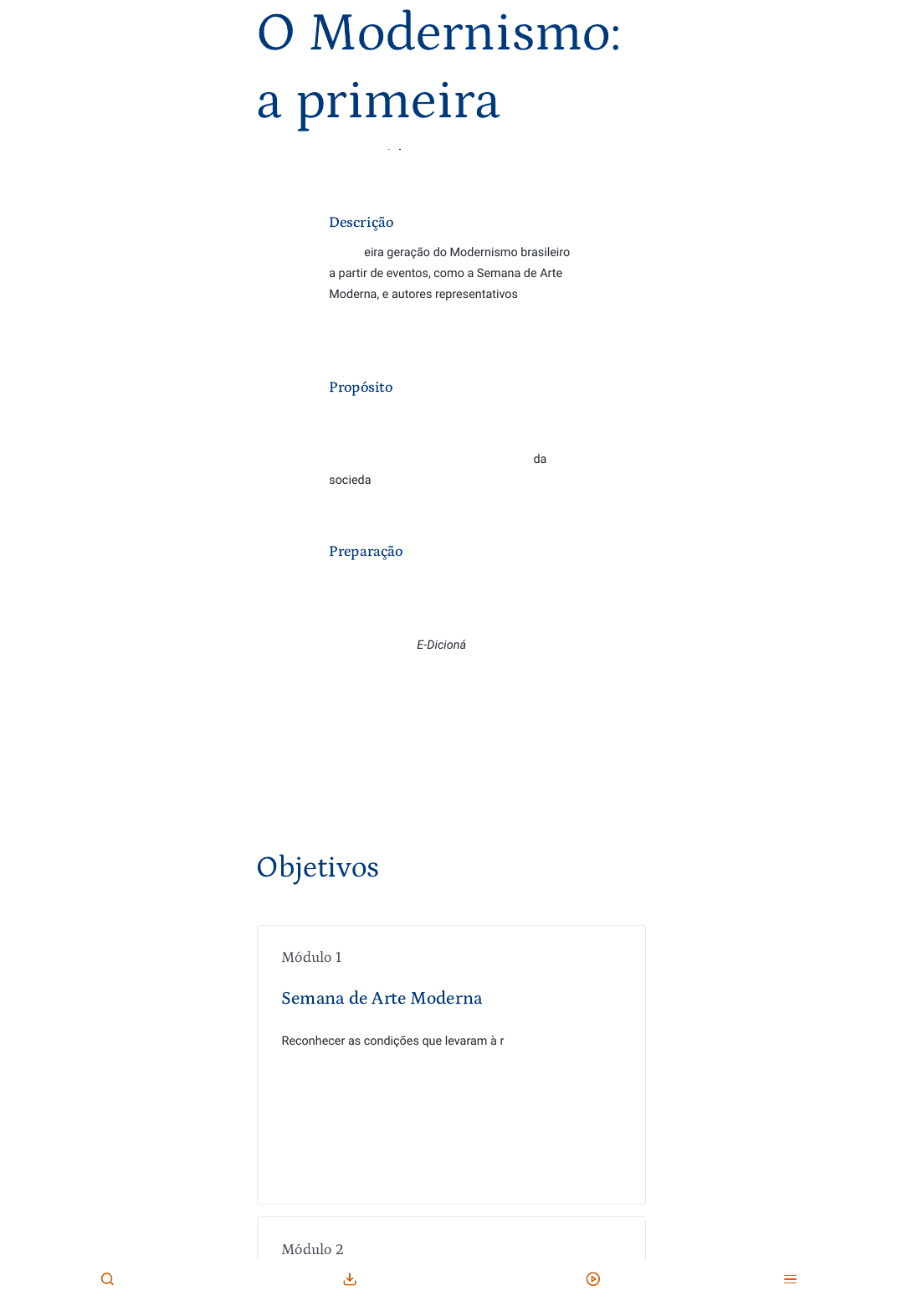 17/04/2024, 11:11 O Modernismo: a primeira geração https://stecine.azureedge.net/repositorio/00212hu/04395/index.html?brand=estacio# 1/39 Objetivos Módulo 1 Semana de Arte Moderna Reconhecer as condições que levaram à realização da Semana de Arte Moderna. Acessar módulo Módulo 2 Antropofagia de Oswald de Andrade O Modernismo: a primeira geração Prof. Rodrigo Jorge Ribeiro Neves Descrição A primeira geração do Modernismo brasileiro a partir de eventos, como a Semana de Arte Moderna, e autores representativos, como Oswald de Andrade e Mário de Andrade. Propósito Conhecer a contribuição literária e cultural do Modernismo brasileiro para ampliar a competência leitora e a compreensão da sociedade brasileira. Preparação Tenha em mãos um dicionário de literatura para compreender o vocabulário específico da área. Na internet você acessa gratuitamente o E-Dicionário de Termos Literários, de Carlos Ceia, e o Dicionário de Cultura Básica, de Salvatore D’Onofrio. Buscar Baixar conteúdo em PDF Vídeos Menu 17/04/2024, 11:11 O Modernismo: a primeira geração https://stecine.azureedge.net/repositorio/00212hu/04395/index.html?brand=estacio# 2/39 Identificar o conceito de antropofagia em Oswald de Andrade. Acessar módulo Módulo 3 Macunaíma de Mário de Andrade Analisar a narrativa de Macunaíma, o herói sem nenhum caráter, de Mário de Andrade. Acessar módulo Introdução O Modernismo no Brasil não foi apenas uma escola literária inscrita em um determinado momento histórico, com características e cronograma bem definidos. Foi um movimento cultural, pois surgiu como inquietação diante das transformações estruturais que o país atravessava e da necessidade de desvendar a natureza dessa sociedade para, assim, transformá-la e integrá-la no processo de desenvolvimento. Para o Modernismo, a cultura é a chave. Neste conteúdo, você vai conhecer as principais questões que contribuíram para o surgimento do Modernismo brasileiro. A primeira geração se consolida com a realização da Semana de Arte Moderna de 1922, que contou com uma série de antecedentes. Entre as figuras representativas dessa fase, iremos estudar dois nomes fundamentais para compreender os sentidos do Modernismo: Oswald de Andrade, com seu conceito de antropofagia, e Mário de Andrade, considerado líder do movimento e autor de uma das obras mais importantes da literatura brasileira: Macunaíma, o herói sem nenhum caráter. 17/04/2024, 11:11 O Modernismo: a primeira geração https://stecine.azureedge.net/repositorio/00212hu/04395/index.html?brand=estacio# 3/39 1 Semana de Arte Moderna Ao final deste módulo, você será capaz de reconhecer as condições que levaram à realização da Semana de Arte Moderna. 17/04/2024, 11:11 O Modernismo: a primeira geração https://stecine.azureedge.net/repositorio/00212hu/04395/index.html?brand=estacio# 4/39 Antecedentes do Modernismo Para entender a Semana de Arte Moderna, em 1922, é preciso, antes, conhecer e analisar os seus antecedentes, ou seja, os episódios que anteciparam e permitiram a realização do evento. Afinal de contas, nenhum acontecimento histórico, como você bem sabe, simplesmente surge no instante em que é registrado na história. Até mesmo uma mera reunião entre amigos, bem despretensiosa, demanda planejamento e, antes disso, a existência de condições para que esse encontro ocorra. O caso da Semana é assim também. Mario de Andrade I, por Anita Malfatti (1922). Não há como estudar a Semana de 22 sem levar em conta a exposição de Anita Malfatti e a sua importância para a formação da primeira geração do Modernismo brasileiro, sendo considerada por um dos mais importantes historiadores do movimento, Mário da Silva Brito, como o seu “estopim” (BRITO, 1974, p. 40). Anita Malfatti era filha de um engenheiro italiano, que se naturalizou brasileiro e atuou como deputado na primeira assembleia legislativa estadual, no fim do século XIX. Sua estadia na então Academia Real de Artes (Königliche Academiem der Künste zu Berlin) em Berlim, na Alemanha, entre 1910 e 1914, será de grande influência em sua formação. É um período de grande efervescência da arte moderna alemã. Mas Anita encontra também a possibilidade de conhecer obras de importantes artistas pós-impressionistas, em Colônia, no sul do país da língua de Goethe e de David Friedrich. Lá, ela aprecia os quadros dos impressionistas Camille Pissarro e Auguste Renoir, e dos pós- impressionistas Paul Gauguin, Van Gogh e Paul Cézanne. 17/04/2024, 11:11 O Modernismo: a primeira geração https://stecine.azureedge.net/repositorio/00212hu/04395/index.html?brand=estacio# 5/39 No entanto, Anita se sente um pouco isolada na Alemanha. Volta para o Brasil, ficando pouco tempo. A próxima parada seria ainda mais preponderante em sua formação como artista moderna: a Escola Independente de Arte (Independence School of Art), de Nova York, nos Estados Unidos. Tomando as lições do artista e professor Homer Boss, Anita se descobriu entre telas, paisagens e corpos, refletindo a natureza e, portanto, a própria vida na forma e na cor. Era uma festa! A festa da forma e a festa da cor. (MALFATTI apud BRITO, 1974, p. 45) Além disso, nos Estados Unidos ela travou contato com outros artistas revolucionários e de diversos campos, como o pintor Marcel Duchamp e a bailarina Isadora Duncan. Ao chegar de Nova York, em 1917, Anita realiza um dos eventos mais emblemáticos da história da arte e da literatura modernas no Brasil: a sua exposição. Por insistência de artistas como Di Cavalcanti, ela reuniu 53 trabalhos e os expôs em um salão na rua Libero Badaró, 111, região central de São Paulo. Ali estavam suas experiências artística e humana vividas na Alemanha e nos Estados Unidos, que acabaram provocando um abalo na vida intelectual e cultural do país no início do século XX. Entre as obras, estavam: Curiosidade Nem a viagem que Malfatti fez à França,