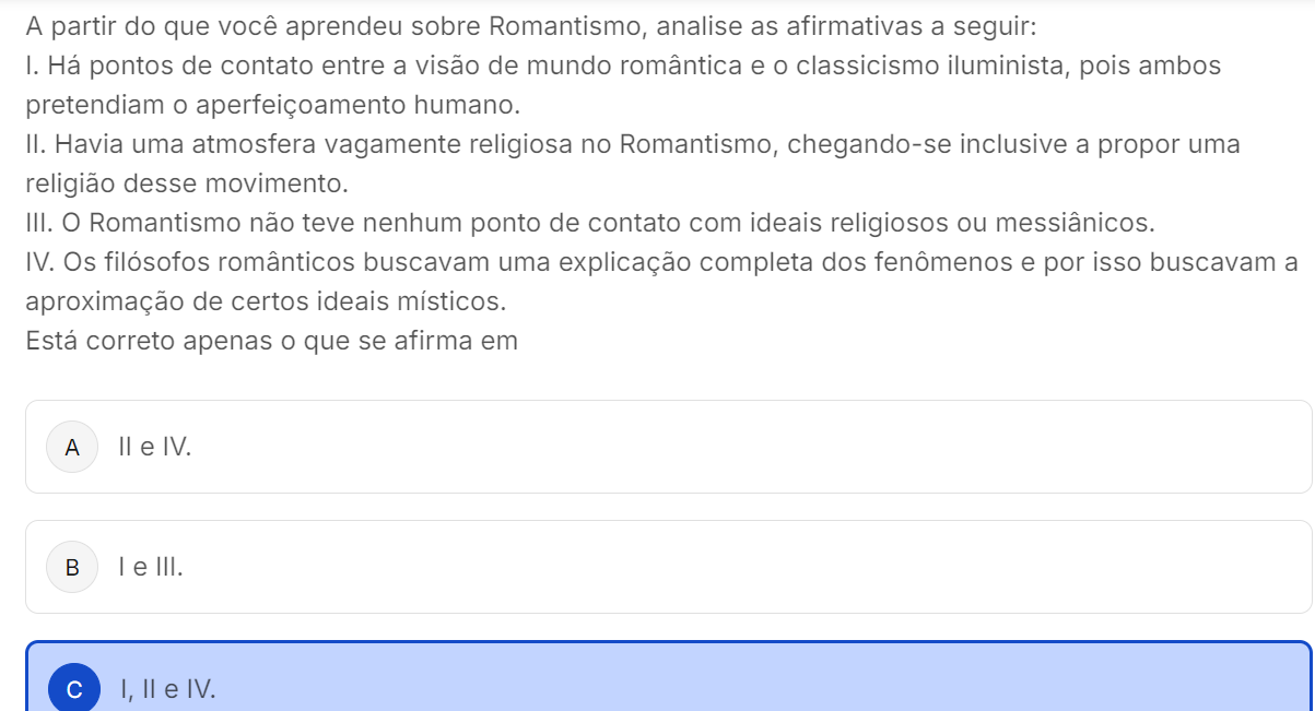 A partir do que você aprendeu sobre Romantismo, analise as afirmativas a seguir: I. Há pontos de contato entre a visão de mundo romântica e o classicismo iluminista, pois ambos pretendiam aperfeiçoamento humano. II. Havia uma atmosfera vagamente religiosa no Romantismo, chegando-se inclusive a propor uma religião desse movimento. III. Romantismo não teve nenhum ponto de contato com ideais religiosos ou messiânicos. IV. Os filósofos românticos buscavam uma explicação completa dos fenômenos e por isso buscavam a aproximação de certos ideais místicos. Está correto apenas o que se afirma em A e IV. B e III. C I, e IV.